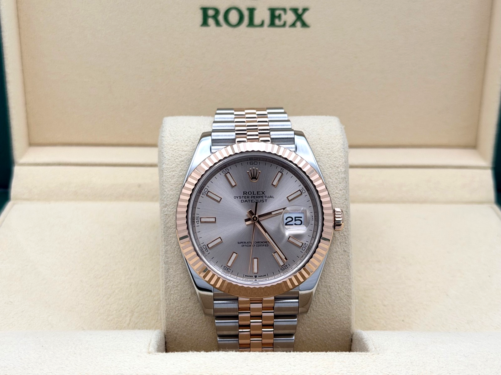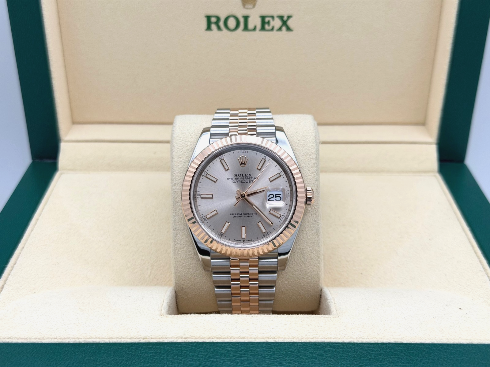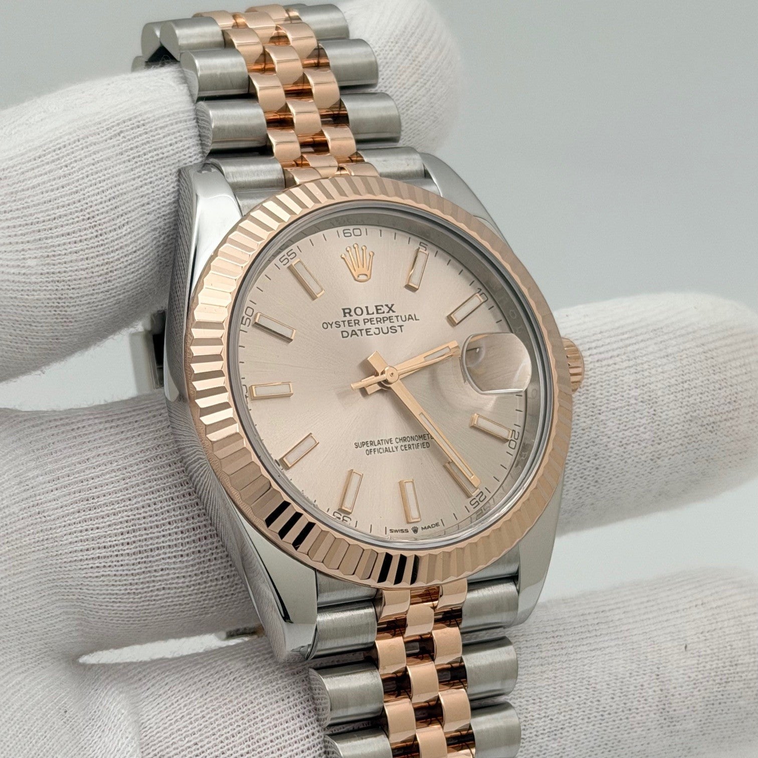 Rolex Datejust 41 126331 41mm Sundust Dial 18k Rose Gold Stainless Steel Box Rolex Sale! from 1499500 /per This item is a recurring or deferred purchase. By continuing, I agree to the cancellation policy and authorize you to charge my payment method at the prices, frequency and dates listed on this page until my order is fulfilled or I cancel, if permitted. +1 (619) 232-1273 This item is currently on backorder but you can still purchase it now and we'll ship as soon as more become available. Style Number: 126331Serial: N0E0****Year: 2016 - Present Model: Rolex Datejust 41 Case Material: Stainless Steel Band: 18k Rose Gold & Stainless Steel Jubilee Bezel: 18k Rose Gold Fluted Dial: Sundust Dial Crystal: Sapphire Case Size: 41mm Includes: - Rolex Box- Certified Appraisal - 1 Year WarrantySKU 23458 / 118324TGC121525