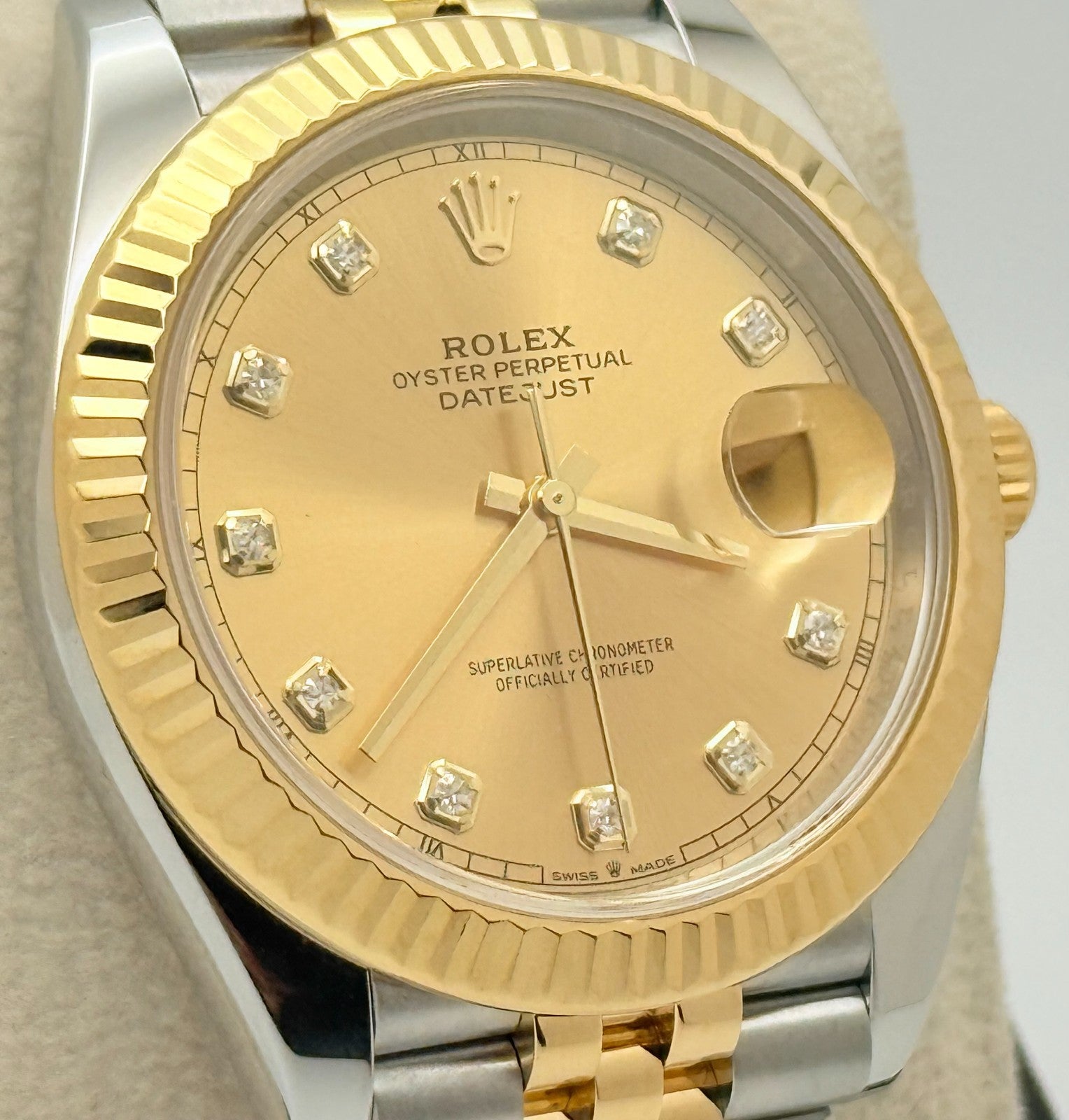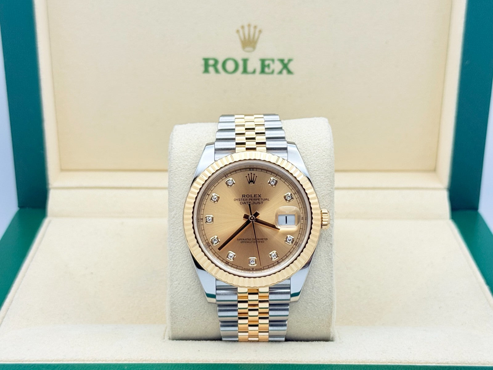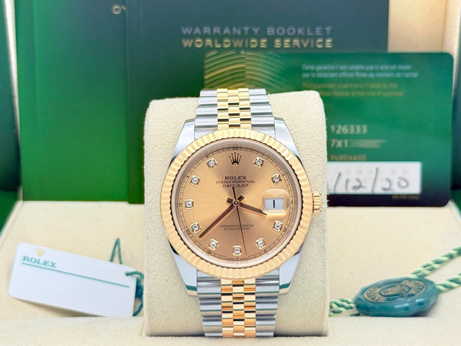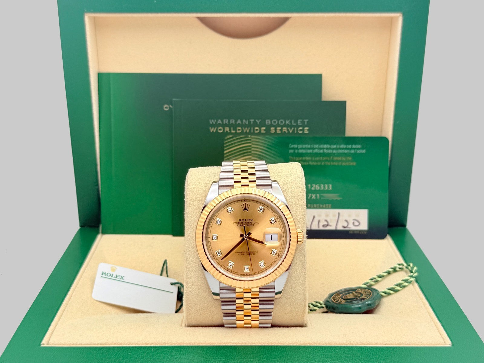 Rolex Datejust 41 126333 Champagne Diamond Dial 18K Yellow Gold Steel Box Paper Rolex Sale! from 1839500 /per This item is a recurring or deferred purchase. By continuing, I agree to the cancellation policy and authorize you to charge my payment method at the prices, frequency and dates listed on this page until my order is fulfilled or I cancel, if permitted. +1 (619) 232-1273 This item is currently on backorder but you can still purchase it now and we'll ship as soon as more become available. Style Number: 126333Serial: 7X1****Year: 2020 Model: Rolex Datejust 41 Case Material: Stainless Steel Band: 18k Yellow Gold & Stainless Steel Jubilee Bezel: 18k Yellow Gold Fluted Bezel Dial: Factory Champagne Diamond Dial Crystal: Sapphire Case Size: 41mm Includes: - Rolex Box & Paper- Certified Appraisal - One Year WarrantySKU 22636 / 137575TJD060425SF