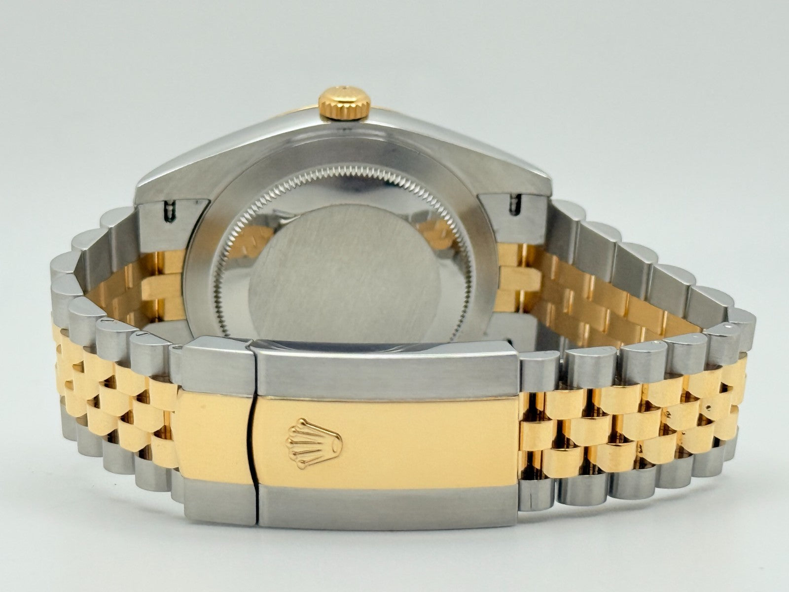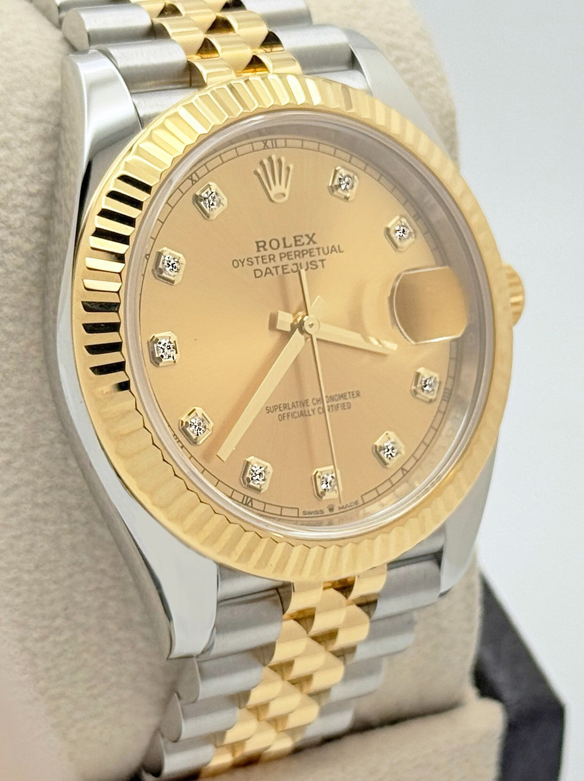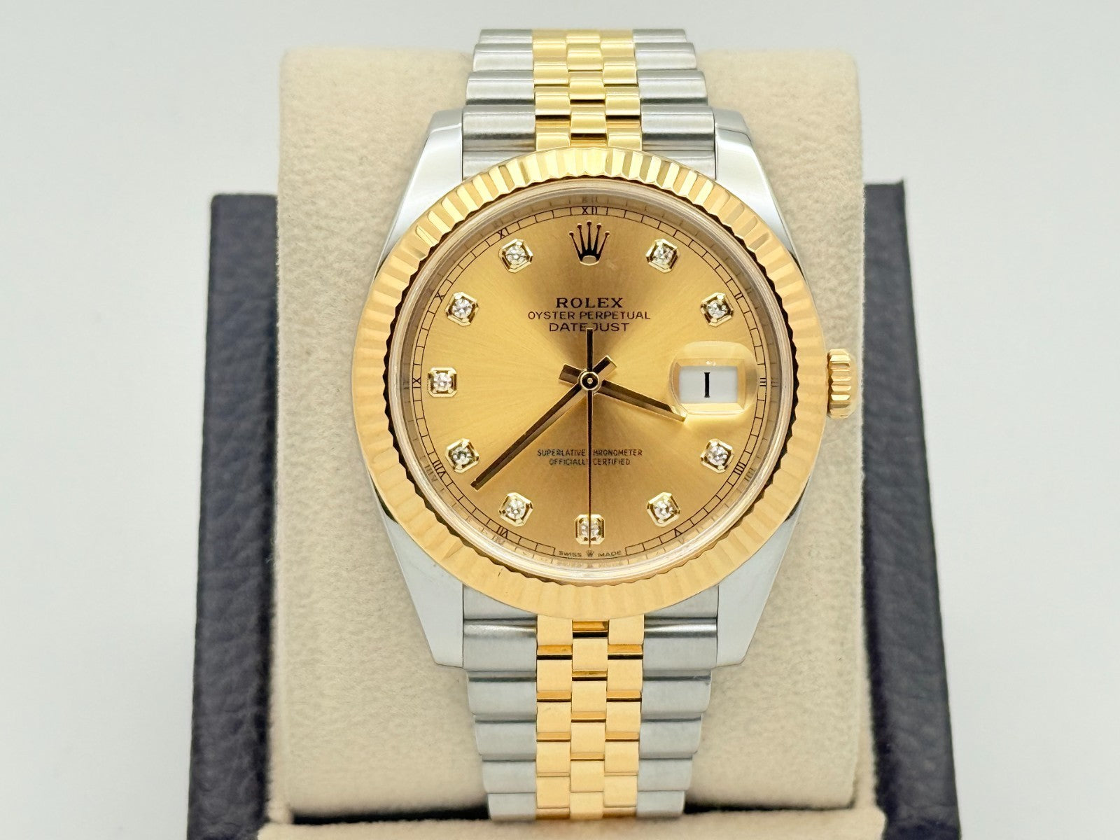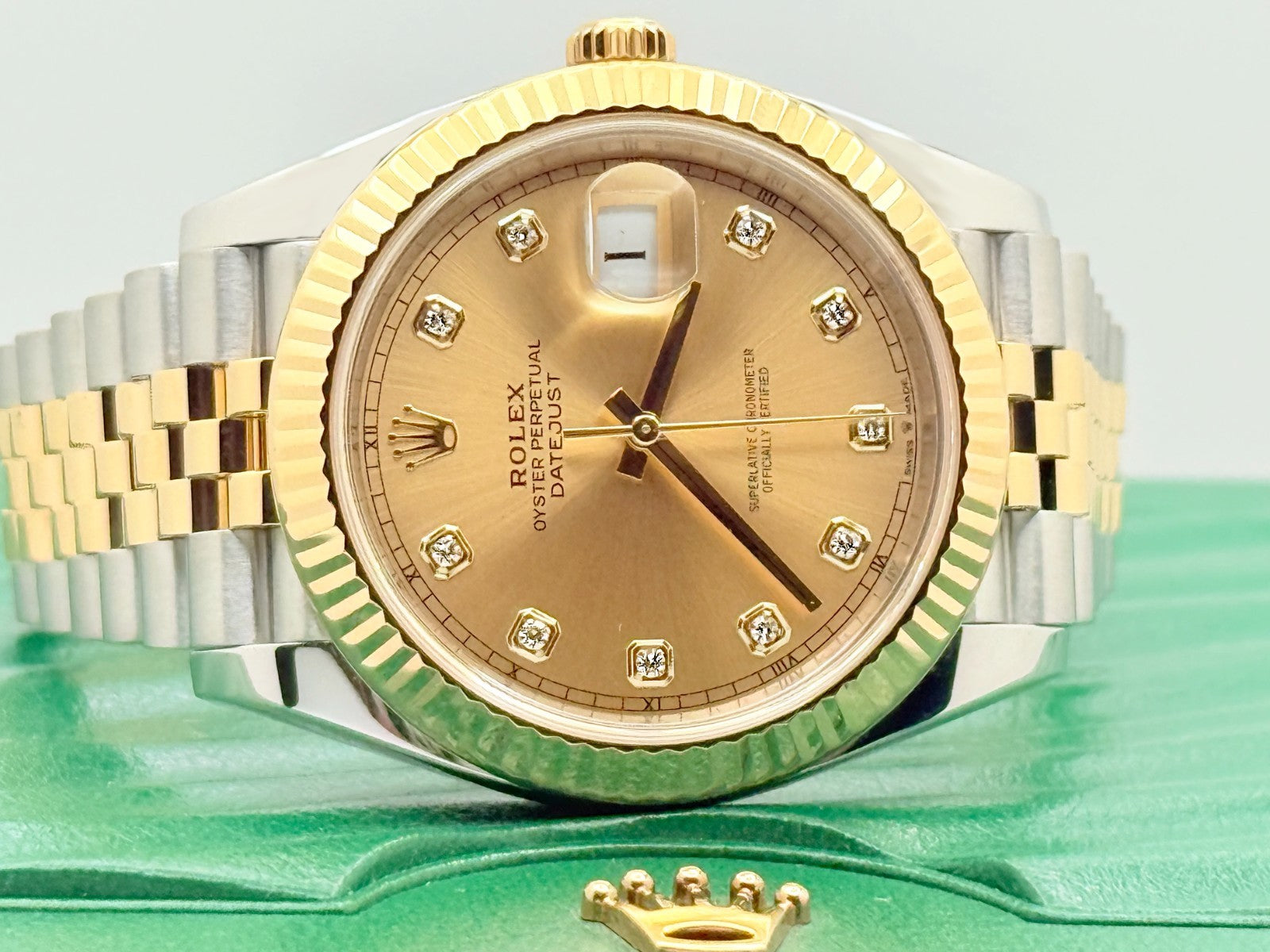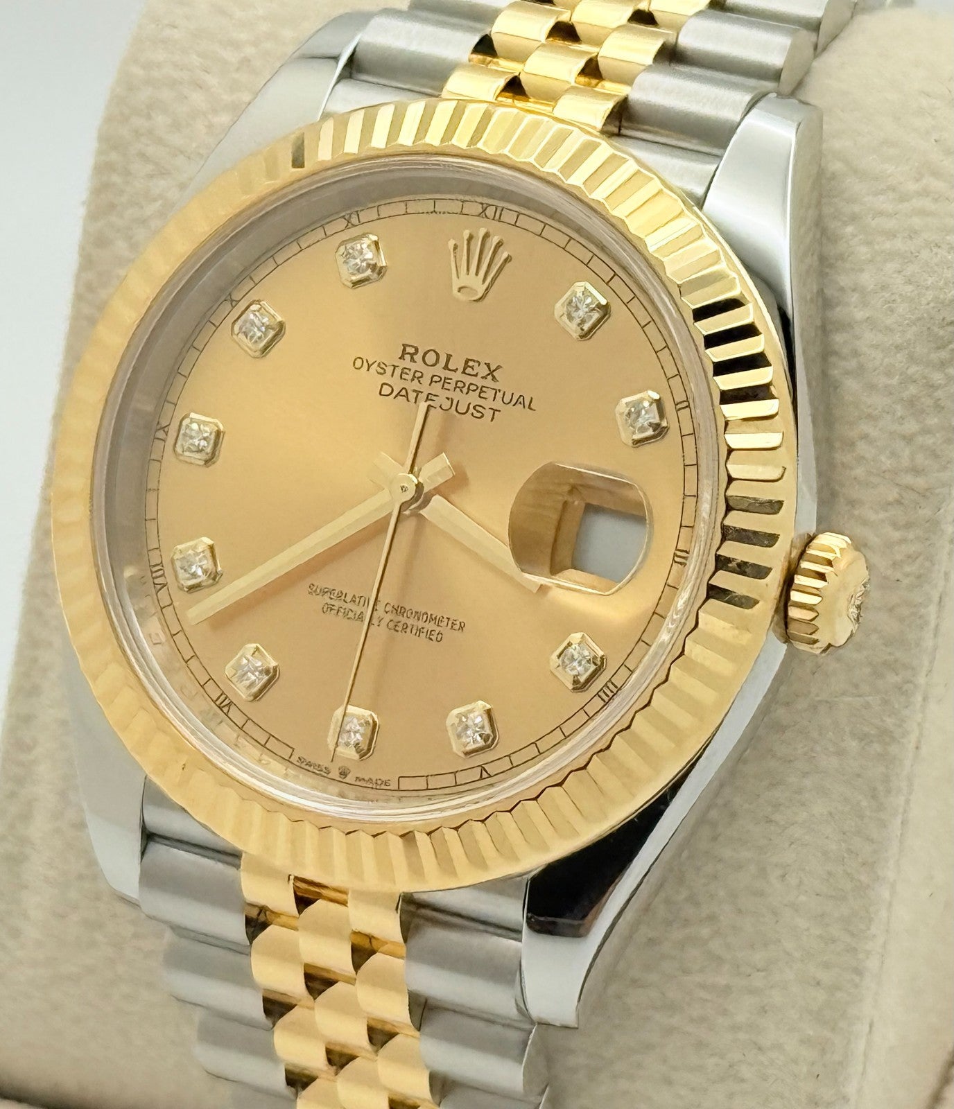 Rolex Datejust 41 126333 Champagne Diamond Dial 18K Yellow Gold Steel Box Paper Rolex Sale! from 1839500 /per This item is a recurring or deferred purchase. By continuing, I agree to the cancellation policy and authorize you to charge my payment method at the prices, frequency and dates listed on this page until my order is fulfilled or I cancel, if permitted. +1 (619) 232-1273 This item is currently on backorder but you can still purchase it now and we'll ship as soon as more become available. Style Number: 126333Serial: 7X1****Year: 2020 Model: Rolex Datejust 41 Case Material: Stainless Steel Band: 18k Yellow Gold & Stainless Steel Jubilee Bezel: 18k Yellow Gold Fluted Bezel Dial: Factory Champagne Diamond Dial Crystal: Sapphire Case Size: 41mm Includes: - Rolex Box & Paper- Certified Appraisal - One Year WarrantySKU 22636 / 137575TJD060425SF