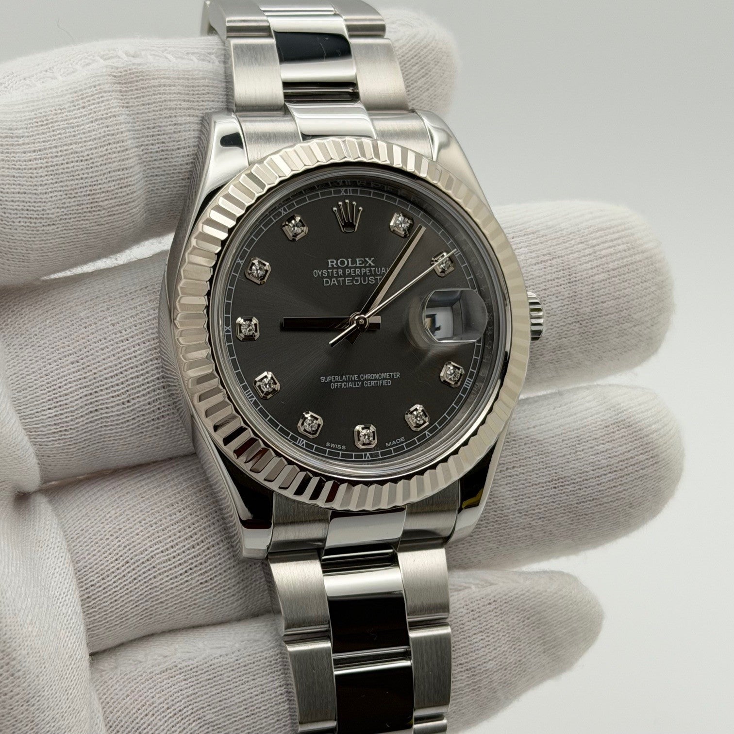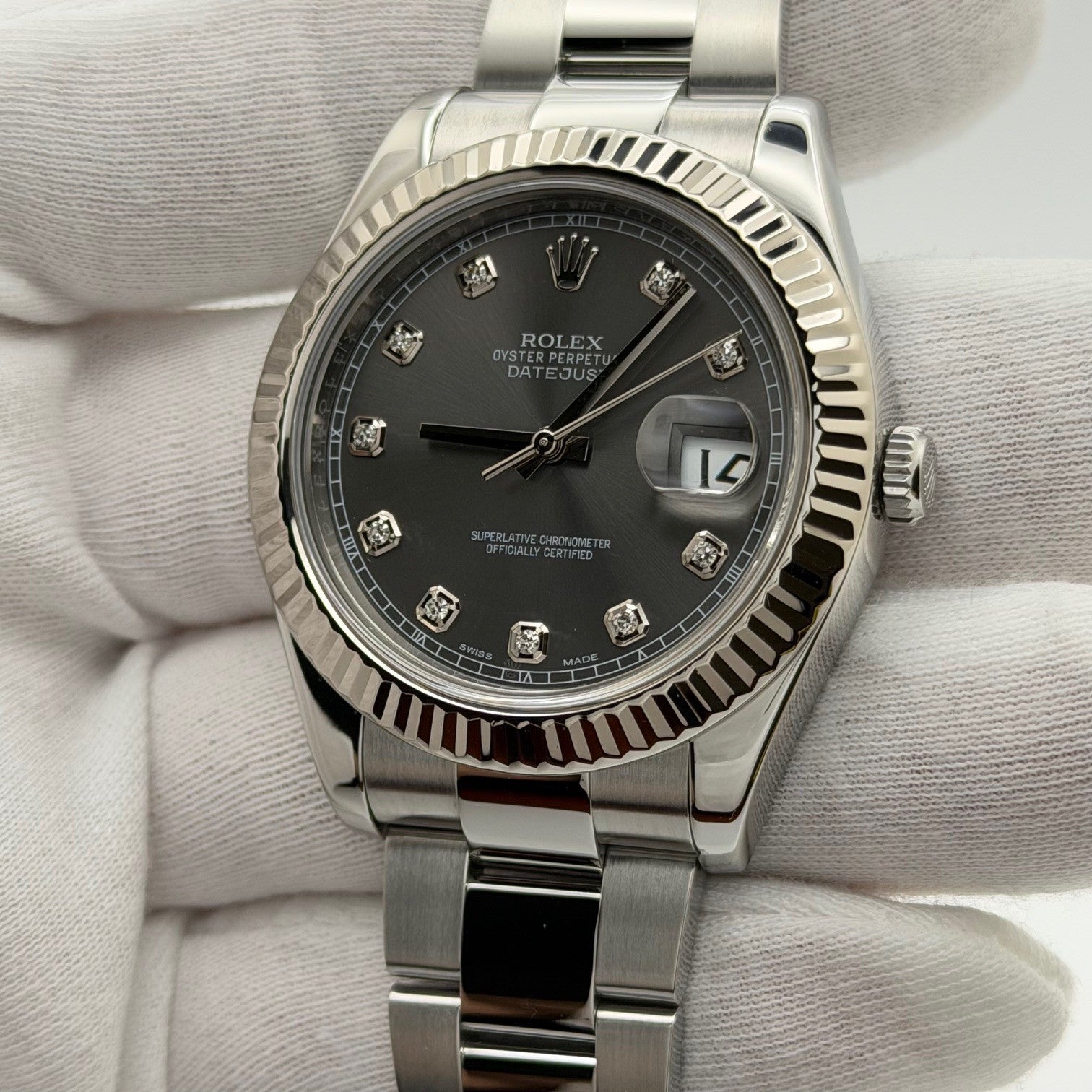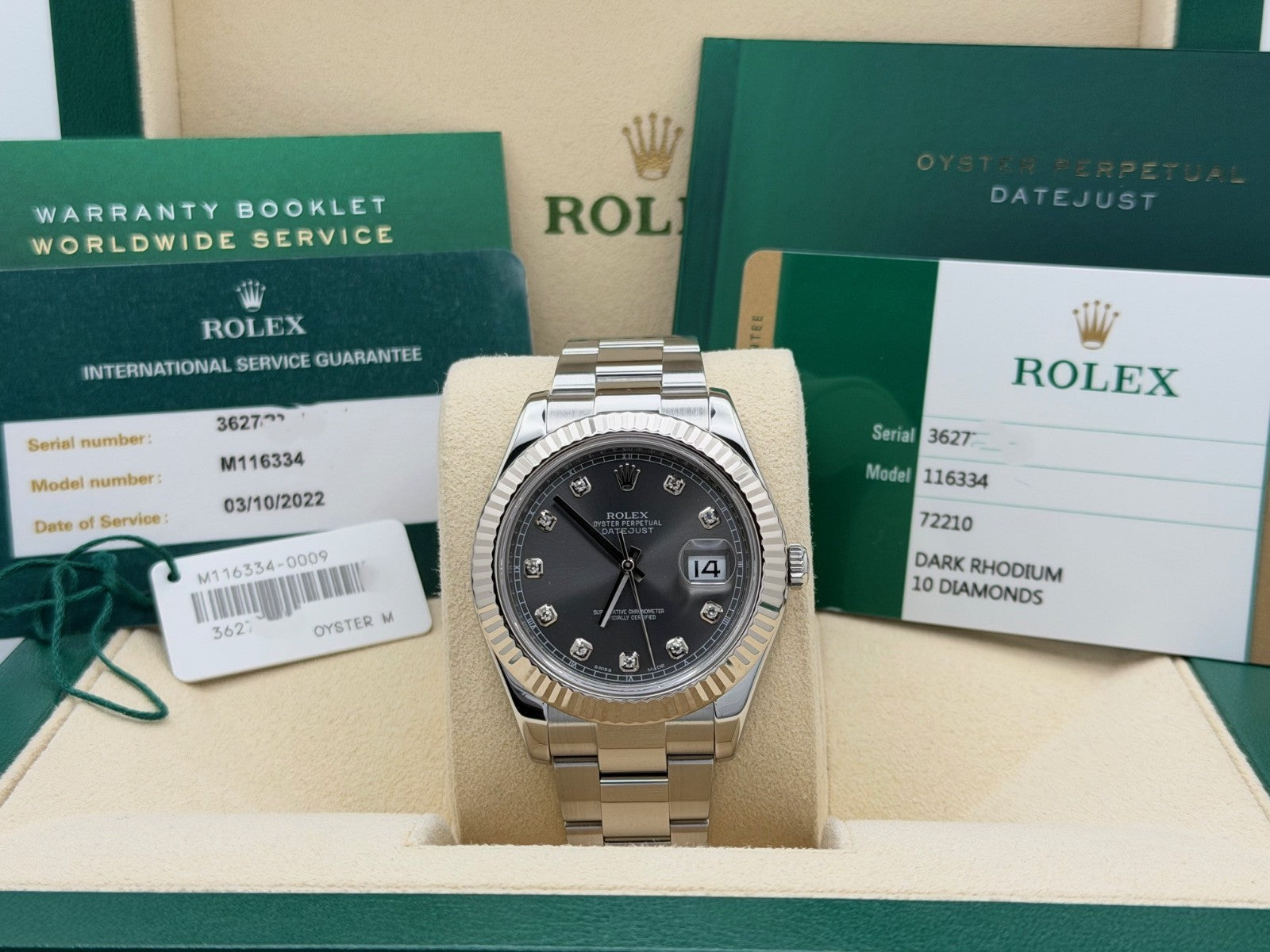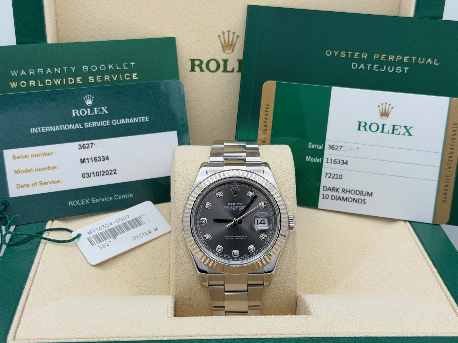 Rolex Datejust II 116334 41mm Rhodium Diamond Dial Steel Box Paper Service Card Rolex Sale! from 1249500 /per This item is a recurring or deferred purchase. By continuing, I agree to the cancellation policy and authorize you to charge my payment method at the prices, frequency and dates listed on this page until my order is fulfilled or I cancel, if permitted. +1 (619) 232-1273 This item is currently on backorder but you can still purchase it now and we'll ship as soon as more become available. Style Number: 116334Serial: 3627****Year: 2017 Model: Rolex Datejust II Case Material: Stainless Steel Band: Stainless Steel Bezel: 18k White Gold Fluted Dial: Factory Rhodium Diamond Dial Crystal: Sapphire Case Size: 41mm Includes: - Rolex Box & Papers + 2022 Rolex Service Card- Certified Appraisal - 1 Year Warranty SKU 23326 / 130390TBJ111225