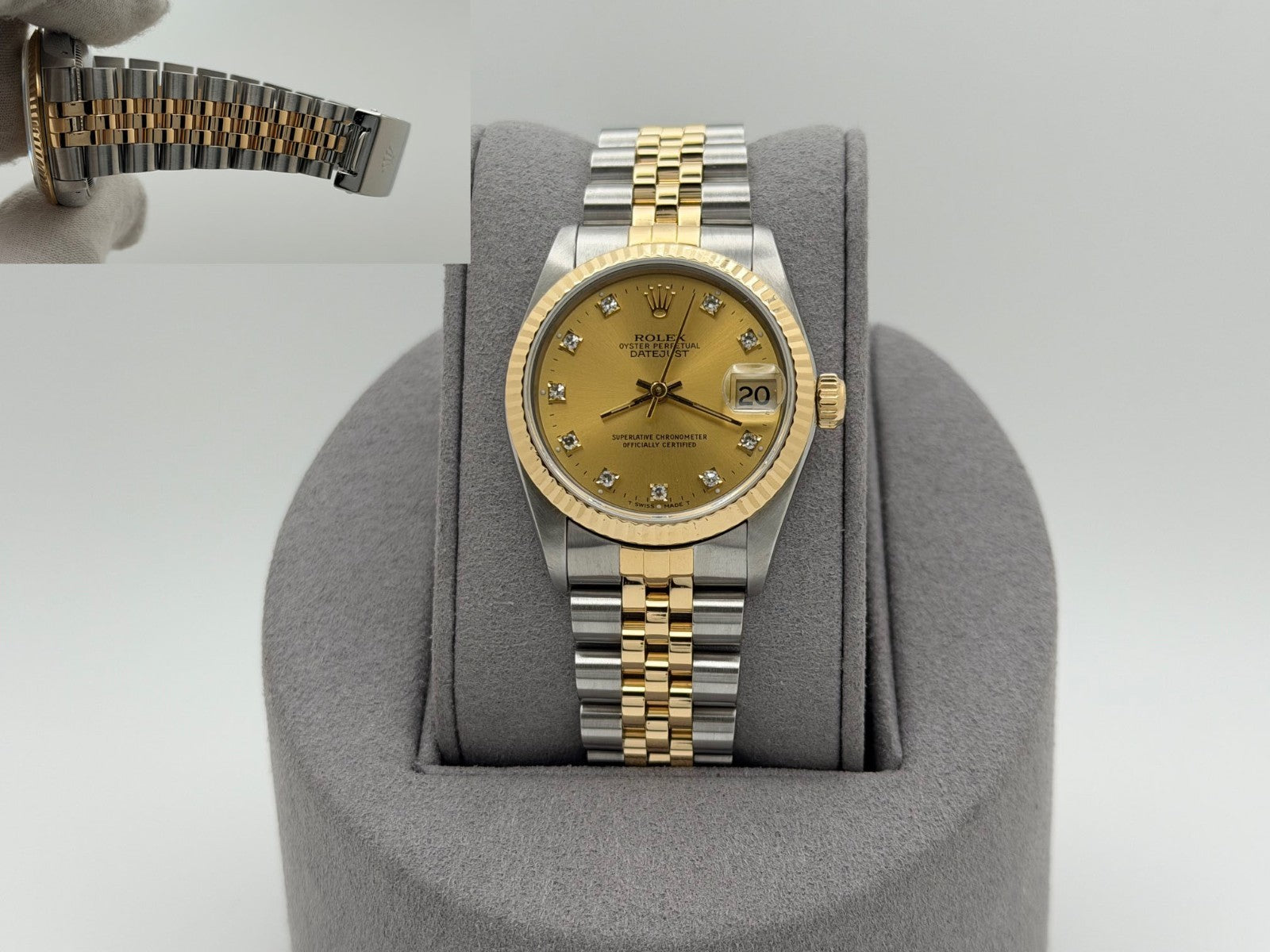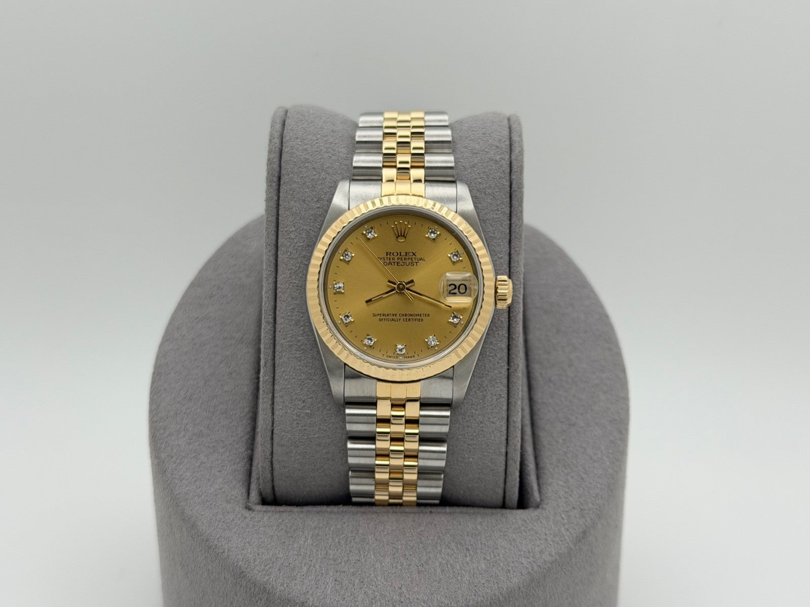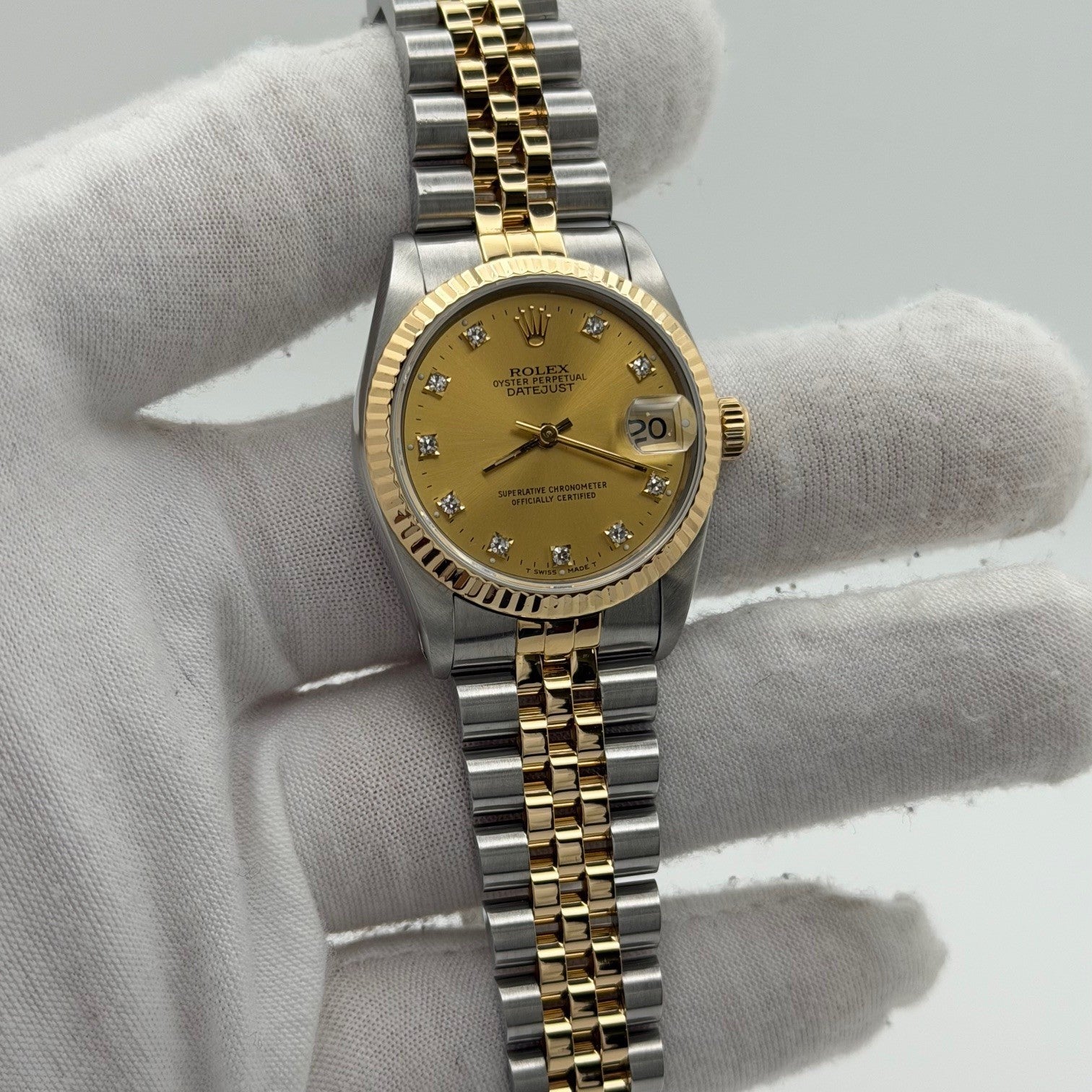 Rolex Datejust Midsize 68273 31mm Champagne Factory Diamond Dial 18k Gold Steel Rolex Sale! from 749500 /per This item is a recurring or deferred purchase. By continuing, I agree to the cancellation policy and authorize you to charge my payment method at the prices, frequency and dates listed on this page until my order is fulfilled or I cancel, if permitted. +1 (619) 232-1273 This item is currently on backorder but you can still purchase it now and we'll ship as soon as more become available. Style Number: 68273Serial: L92****Year: 1989 Model: Rolex Datejust Midsize Case Material: Stainless Steel Band: 18k Yellow Gold & Stainless Steel Jubilee Bezel: 18k Yellow Gold Fluted Dial: Factory Champagne Diamond Dial Crystal: Sapphire Case Size: 31mm Includes: - Elegant Watch Box- Certified Appraisal - One Year WarrantySKU 23475 / 111805TGC121225