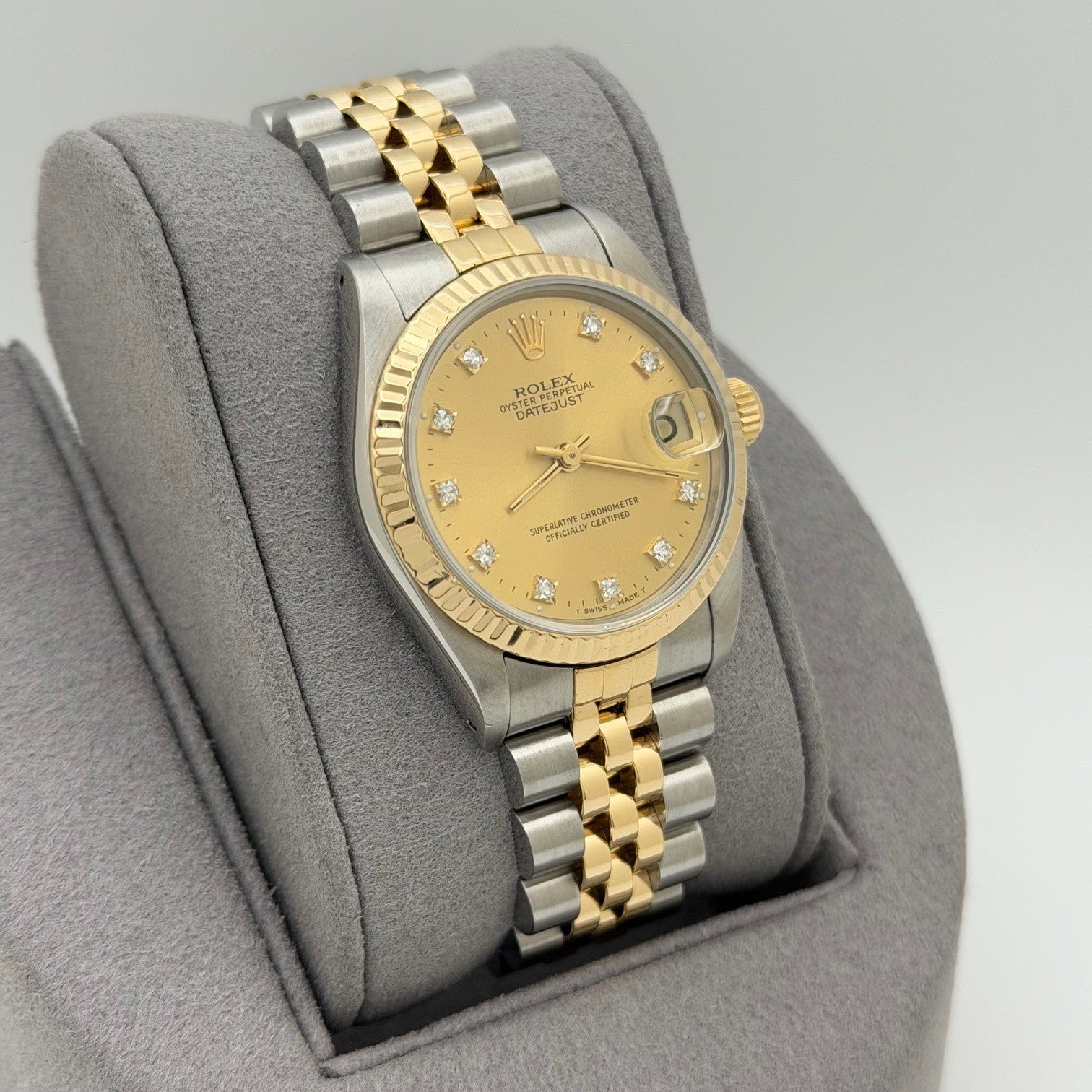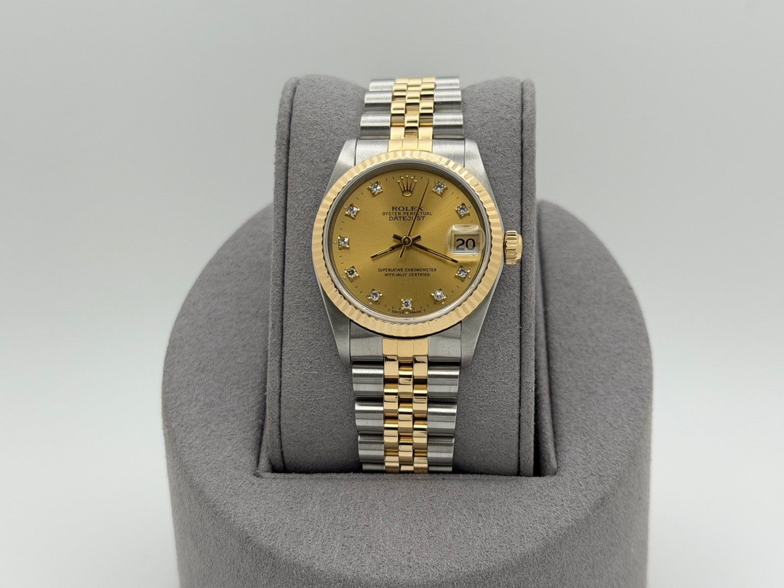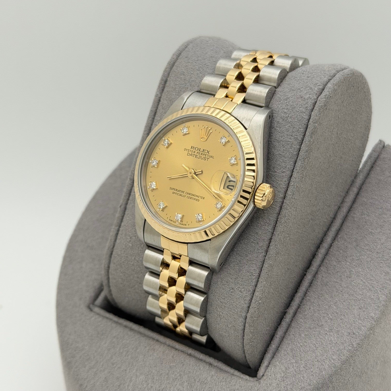 Rolex Datejust Midsize 68273 31mm Champagne Factory Diamond Dial 18k Gold Steel Rolex Sale! from 749500 /per This item is a recurring or deferred purchase. By continuing, I agree to the cancellation policy and authorize you to charge my payment method at the prices, frequency and dates listed on this page until my order is fulfilled or I cancel, if permitted. +1 (619) 232-1273 This item is currently on backorder but you can still purchase it now and we'll ship as soon as more become available. Style Number: 68273Serial: L92****Year: 1989 Model: Rolex Datejust Midsize Case Material: Stainless Steel Band: 18k Yellow Gold & Stainless Steel Jubilee Bezel: 18k Yellow Gold Fluted Dial: Factory Champagne Diamond Dial Crystal: Sapphire Case Size: 31mm Includes: - Elegant Watch Box- Certified Appraisal - One Year WarrantySKU 23475 / 111805TGC121225