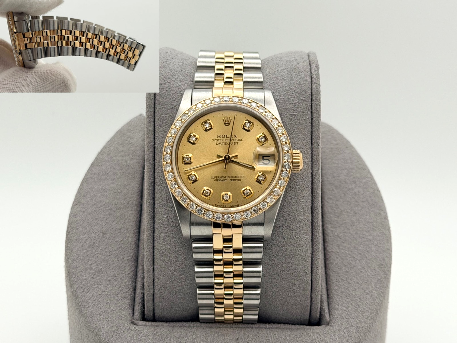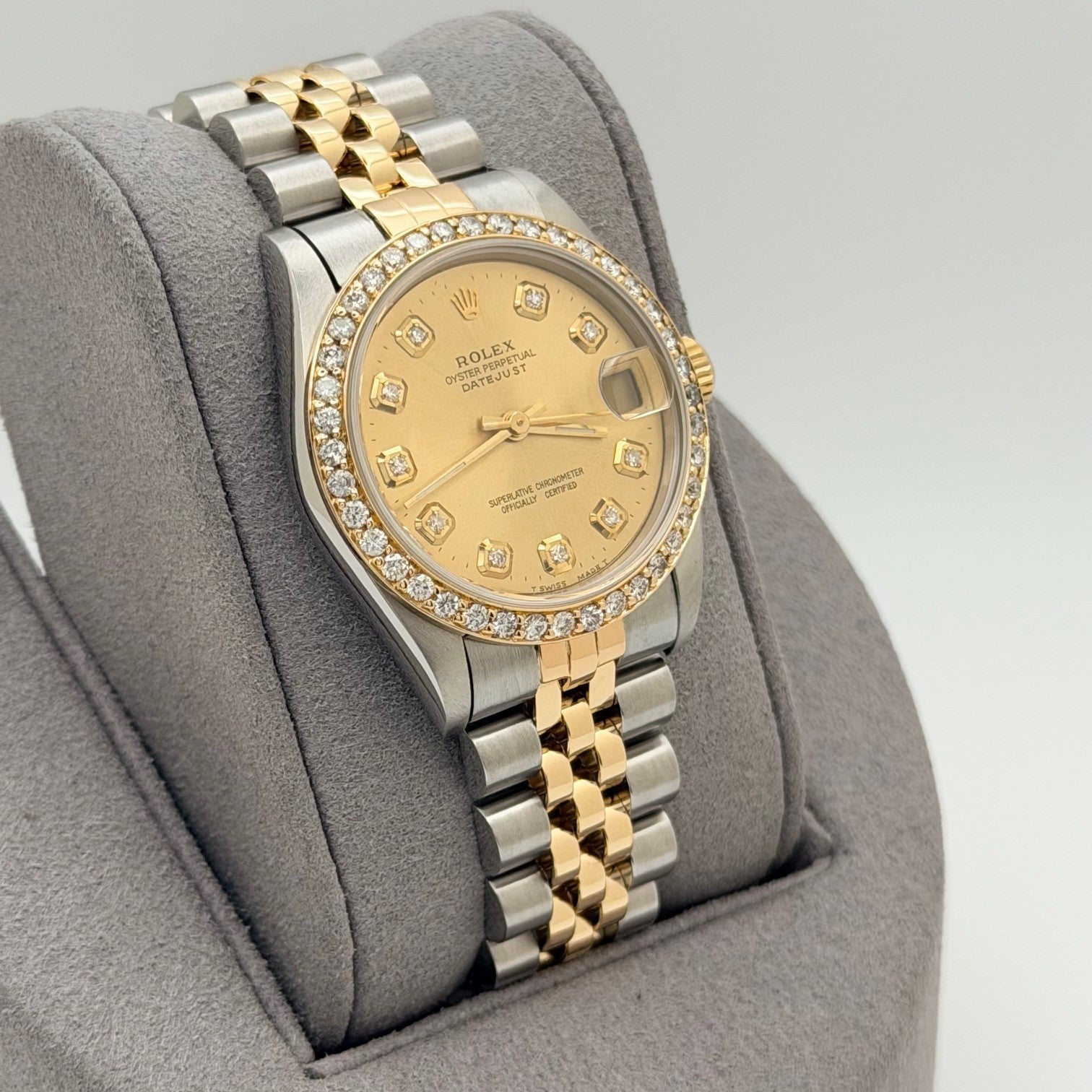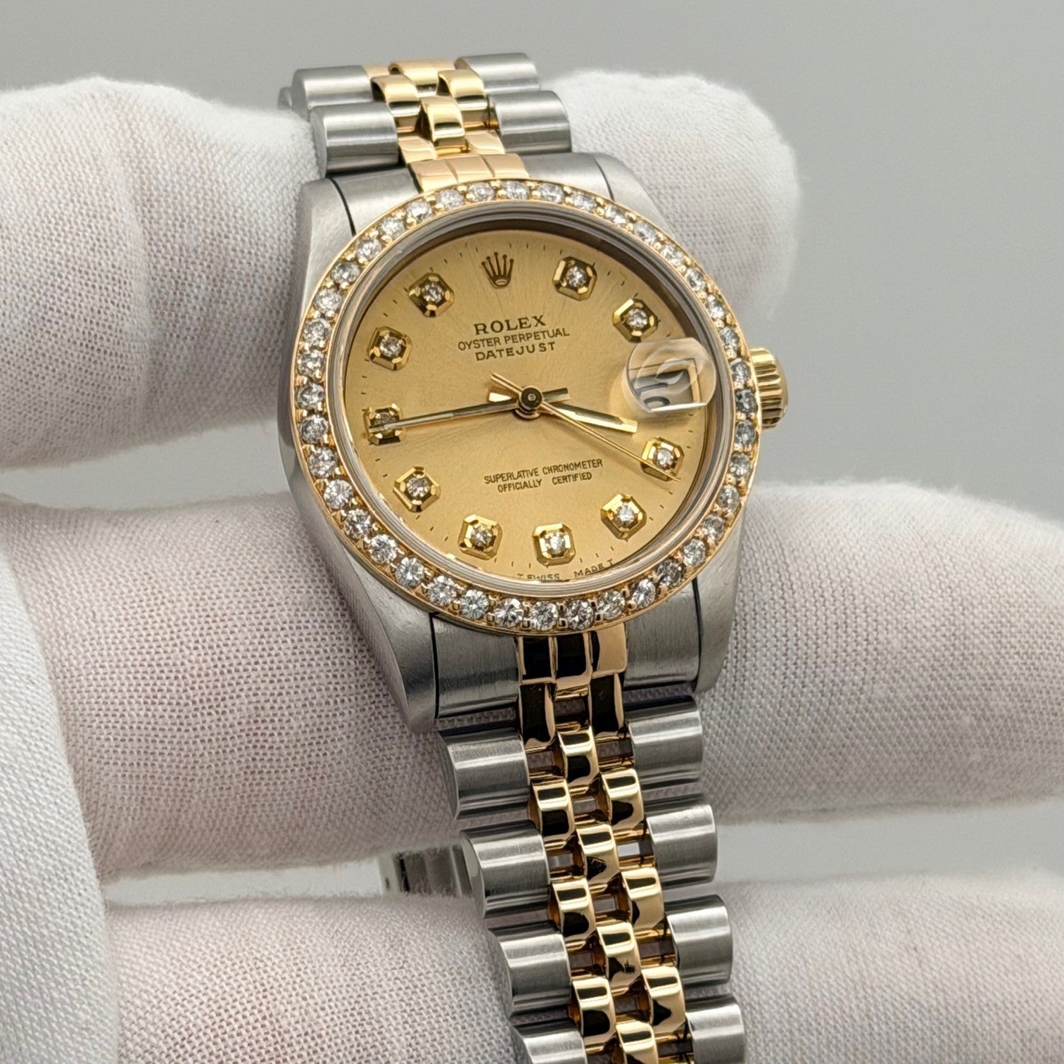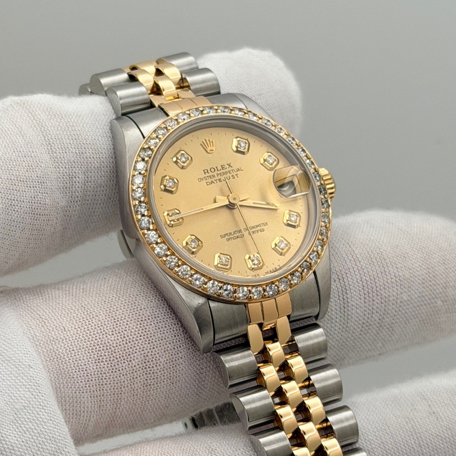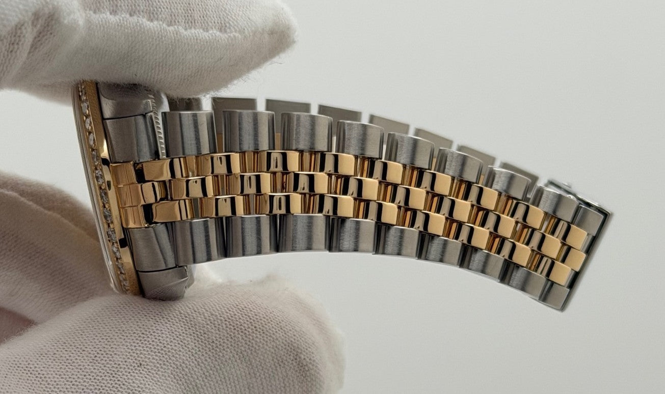 Rolex Datejust Midsize 68273 31mm Diamond Dial Diamond Bezel 18K Gold Steel Rolex Sale! from 839500 /per This item is a recurring or deferred purchase. By continuing, I agree to the cancellation policy and authorize you to charge my payment method at the prices, frequency and dates listed on this page until my order is fulfilled or I cancel, if permitted. +1 (619) 232-1273 This item is currently on backorder but you can still purchase it now and we'll ship as soon as more become available. Style Number: 68273Serial: W99****Year: 1995 Model: Rolex Datejust Midsize Case Material: Stainless Steel Band: 18K Yellow Gold and Stainless Steel Jubilee Bezel: Custom Diamond Bezel Dial: Custom Diamond Dial Crystal: Sapphire Case Size: 31mm Includes: - Elegant Watch Box- Certified Appraisal - One Year WarrantySKU 23589 / 116080TOC011026