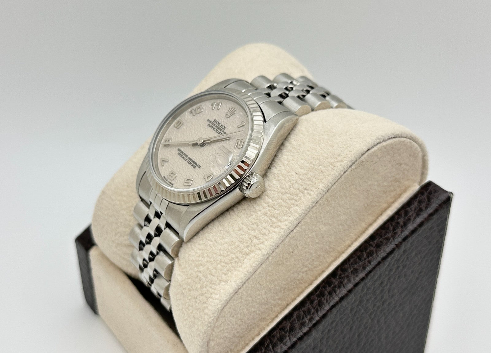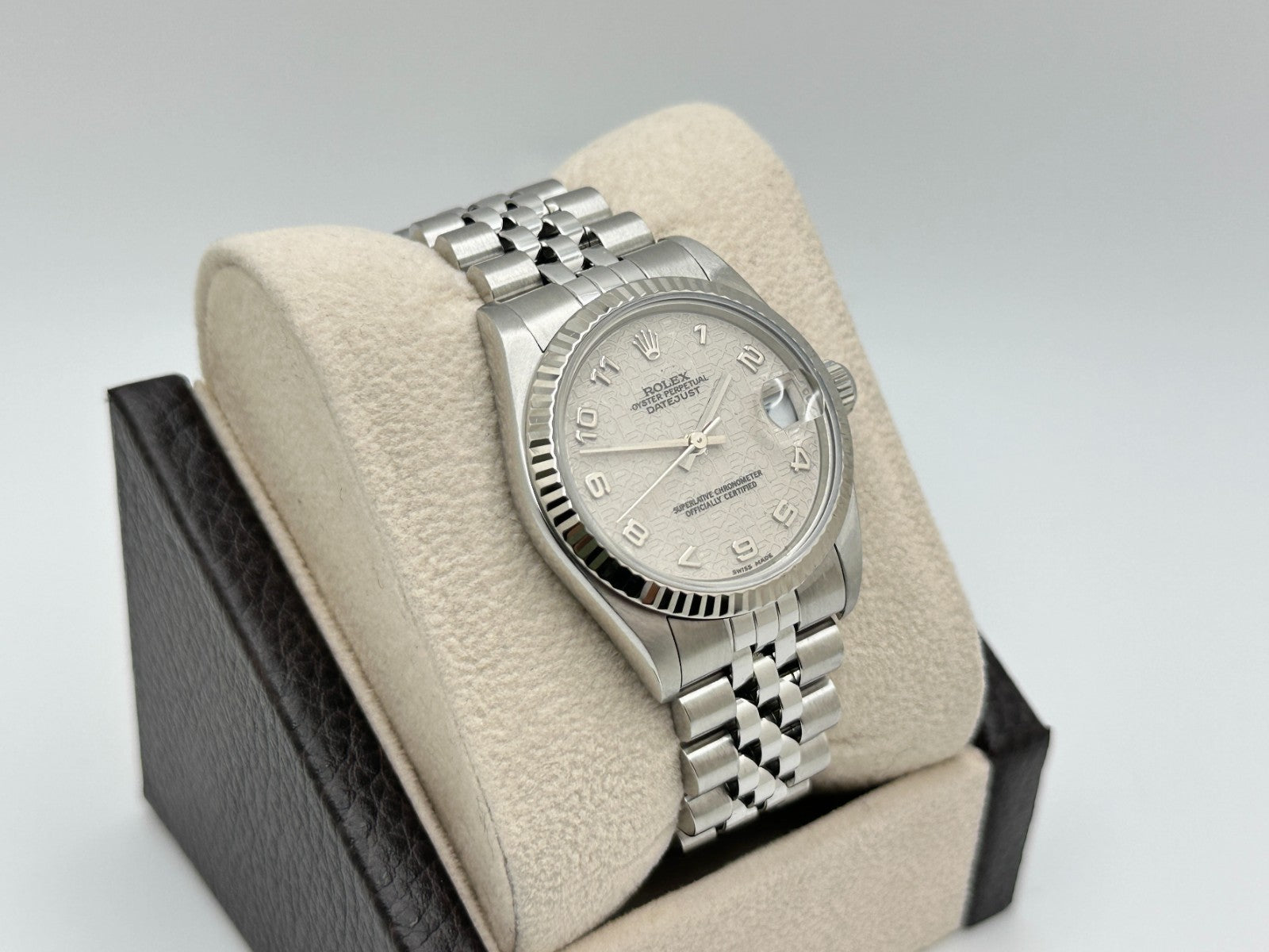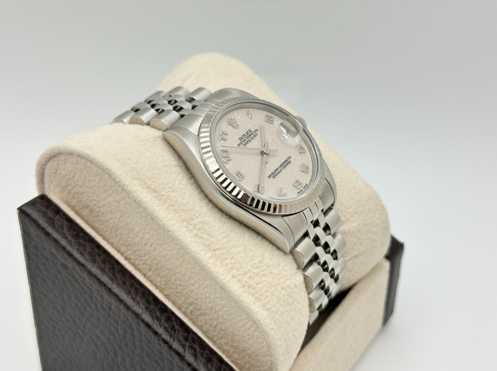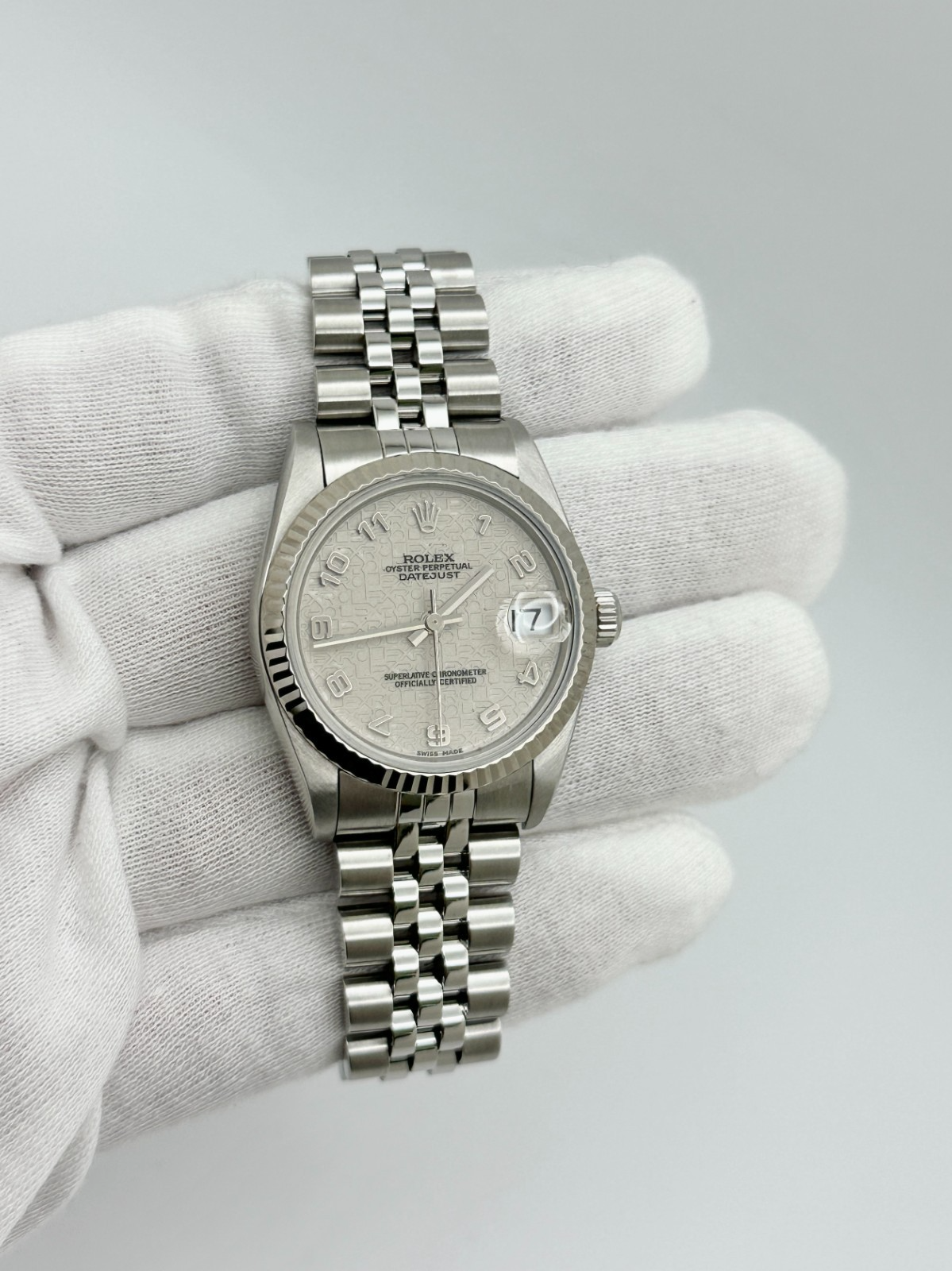 Rolex Datejust Midsize 68274 31mm Silver Jubilee Dial 18K White Gold Steel Rolex Sale! from 569500 /per This item is a recurring or deferred purchase. By continuing, I agree to the cancellation policy and authorize you to charge my payment method at the prices, frequency and dates listed on this page until my order is fulfilled or I cancel, if permitted. +1 (619) 232-1273 This item is currently on backorder but you can still purchase it now and we'll ship as soon as more become available. Style Number: 68274 Serial: T69**** Year: 1996 Model: Rolex Datejust Midsize Case Material: Stainless Steel Band: Stainless Steel Jubilee Bezel: 18K White Gold Fluted Dial: Silver Jubilee Arabic Numeral Dial Crystal: Sapphire Case Size: 31mm Includes: -Elegant Watch Box-Certified Appraisal -1 Year WarrantySKU 23480 / 17773TGC120825SF