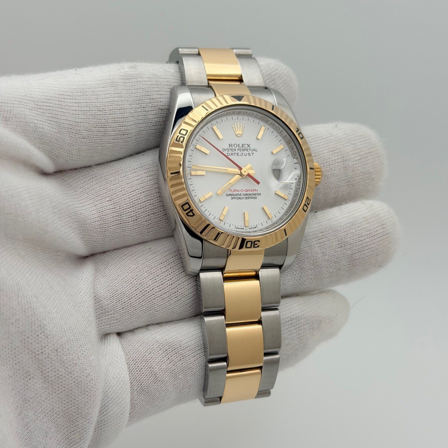 Rolex Datejust Turn-O-Graph Thunderbird 116263 White Index Dial 18k Steel Box Rolex Sale! from 939500 /per This item is a recurring or deferred purchase. By continuing, I agree to the cancellation policy and authorize you to charge my payment method at the prices, frequency and dates listed on this page until my order is fulfilled or I cancel, if permitted. +1 (619) 232-1273 This item is currently on backorder but you can still purchase it now and we'll ship as soon as more become available. Style Number: 116263Serial: F38****Year: 2004 Model: Datejust Turn-O-Graph "Thunderbird" Case Material: Stainless Steel Band: Stainless Steel & 18k Yellow Gold Bezel: 18k Yellow Gold Fluted Turn-O-Graph Dial: White Crystal: Sapphire Case Size: 36mm Includes: - Rolex Box & Booklet- Certified Appraisal - One Year WarrantySKU 23301 / 121525TOC103025