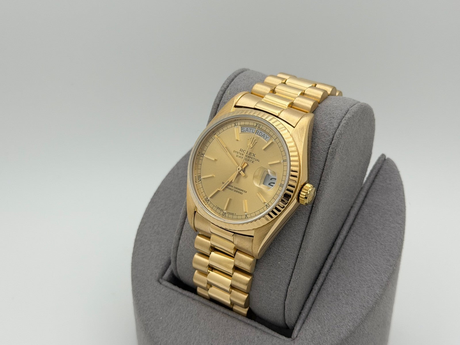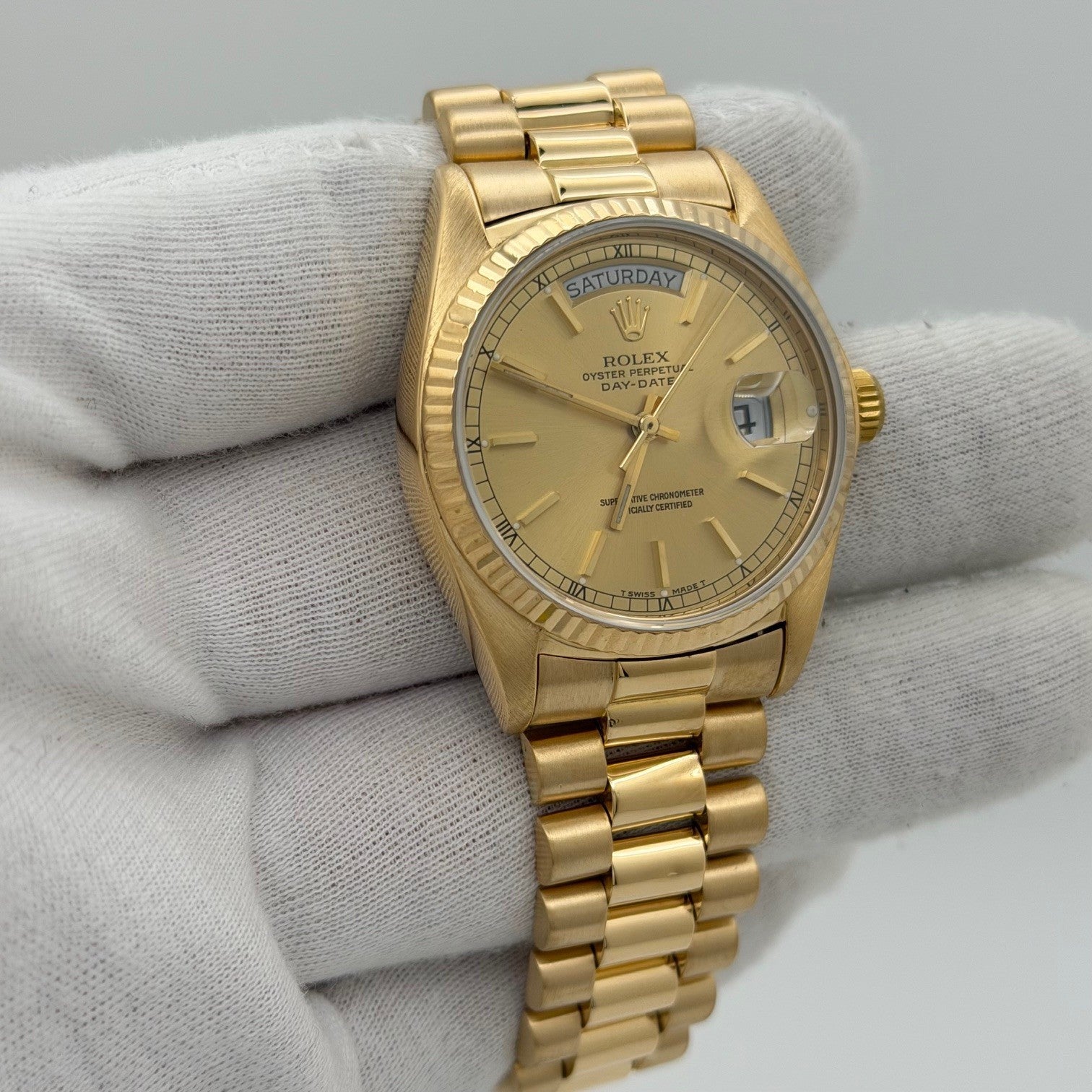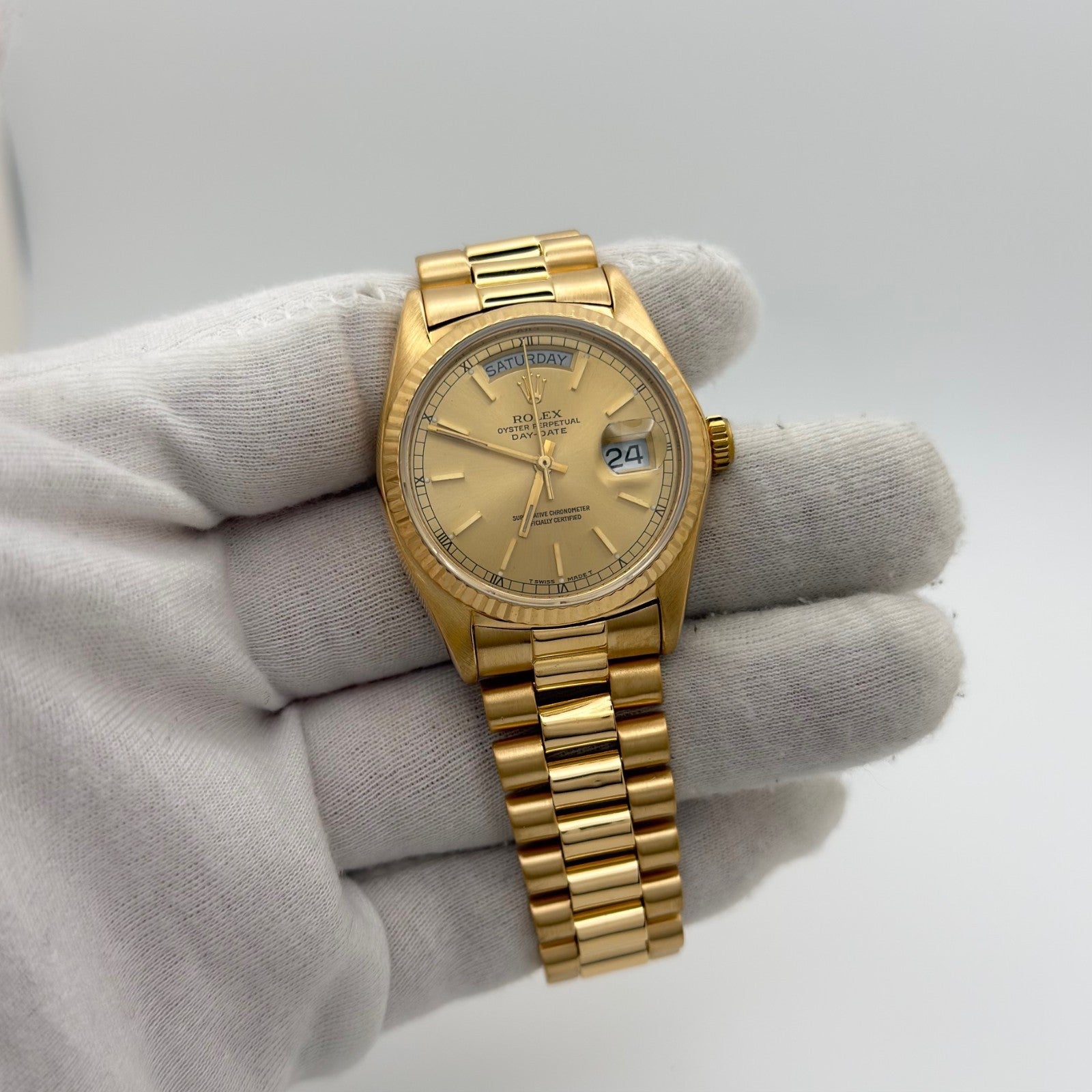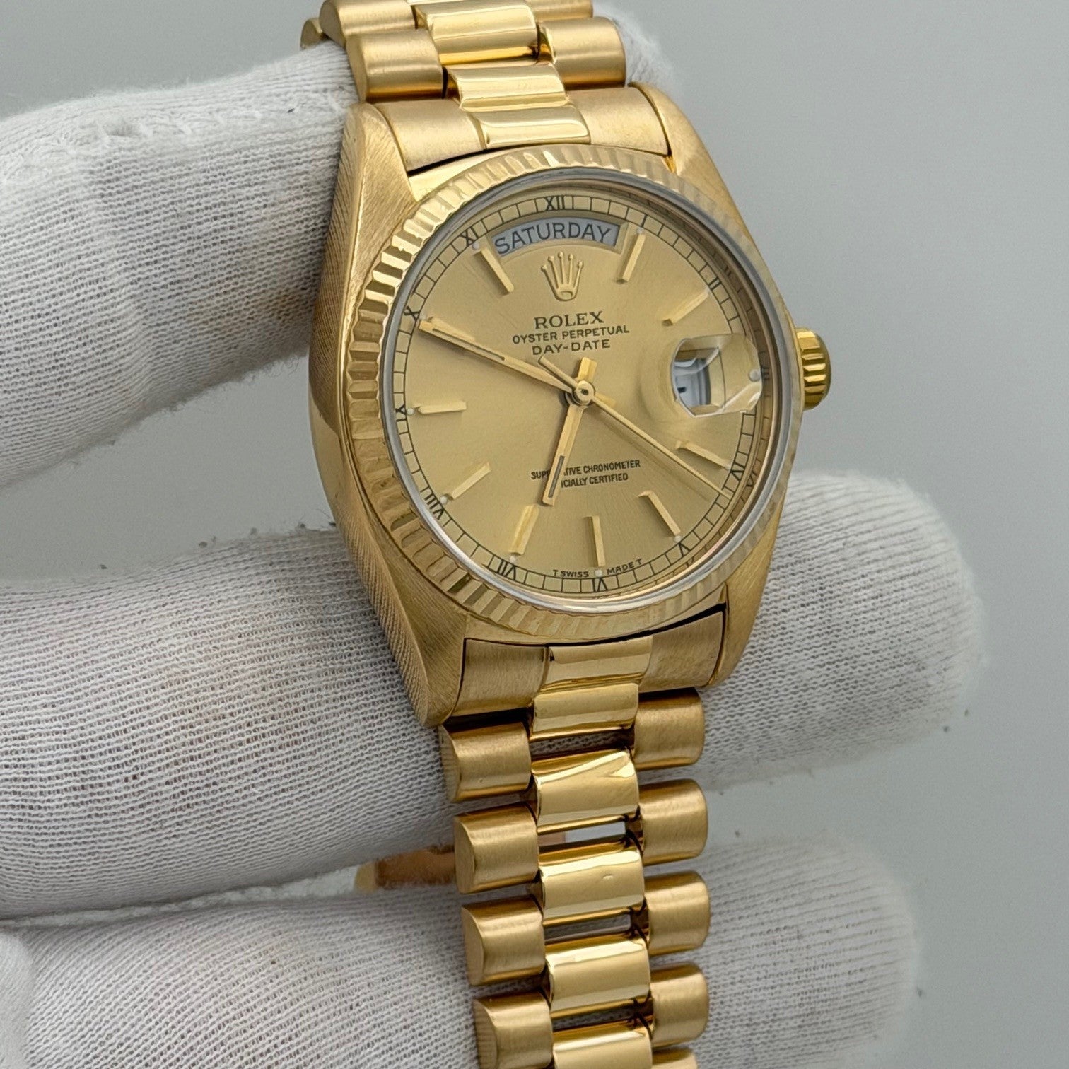 Rolex Day Date President 18038 36mm Champagne Dial Quickset 18k Yellow Gold Rolex Sale! from 1799500 /per This item is a recurring or deferred purchase. By continuing, I agree to the cancellation policy and authorize you to charge my payment method at the prices, frequency and dates listed on this page until my order is fulfilled or I cancel, if permitted. +1 (619) 232-1273 This item is currently on backorder but you can still purchase it now and we'll ship as soon as more become available. Style Number: 18038Serial: 644****Year: 1980 Model: Rolex Day-Date President Case Material: 18k Yellow Gold Band: 18k Yellow Gold President Bezel: 18k Yellow Gold Fluted Dial: Champagne Dial Crystal: Sapphire Case Size: 36mm Includes: - Elegant Watch Box- Certified Appraisal - 1 Year WarrantySKU 23453 / 145075TJD112025