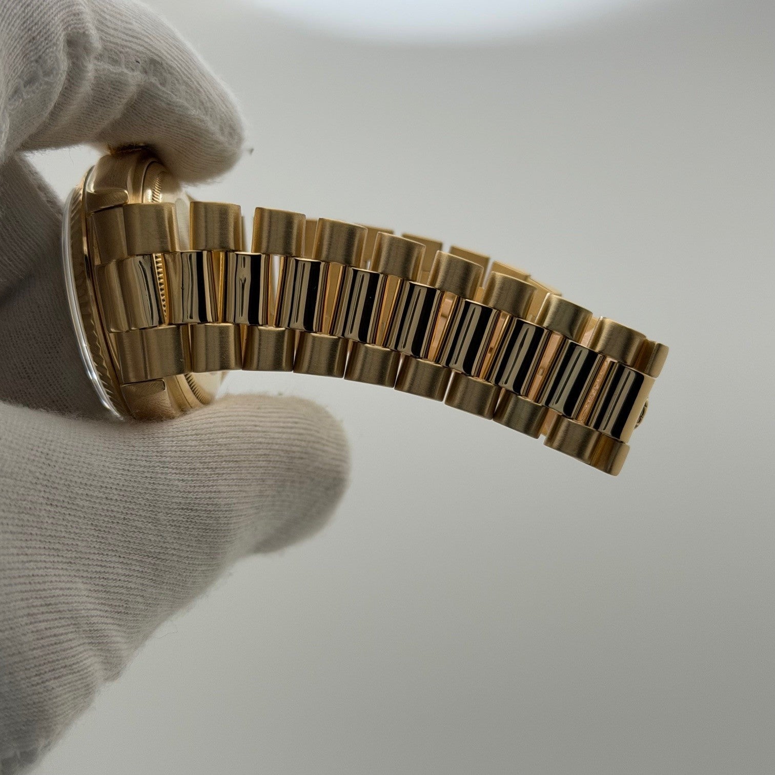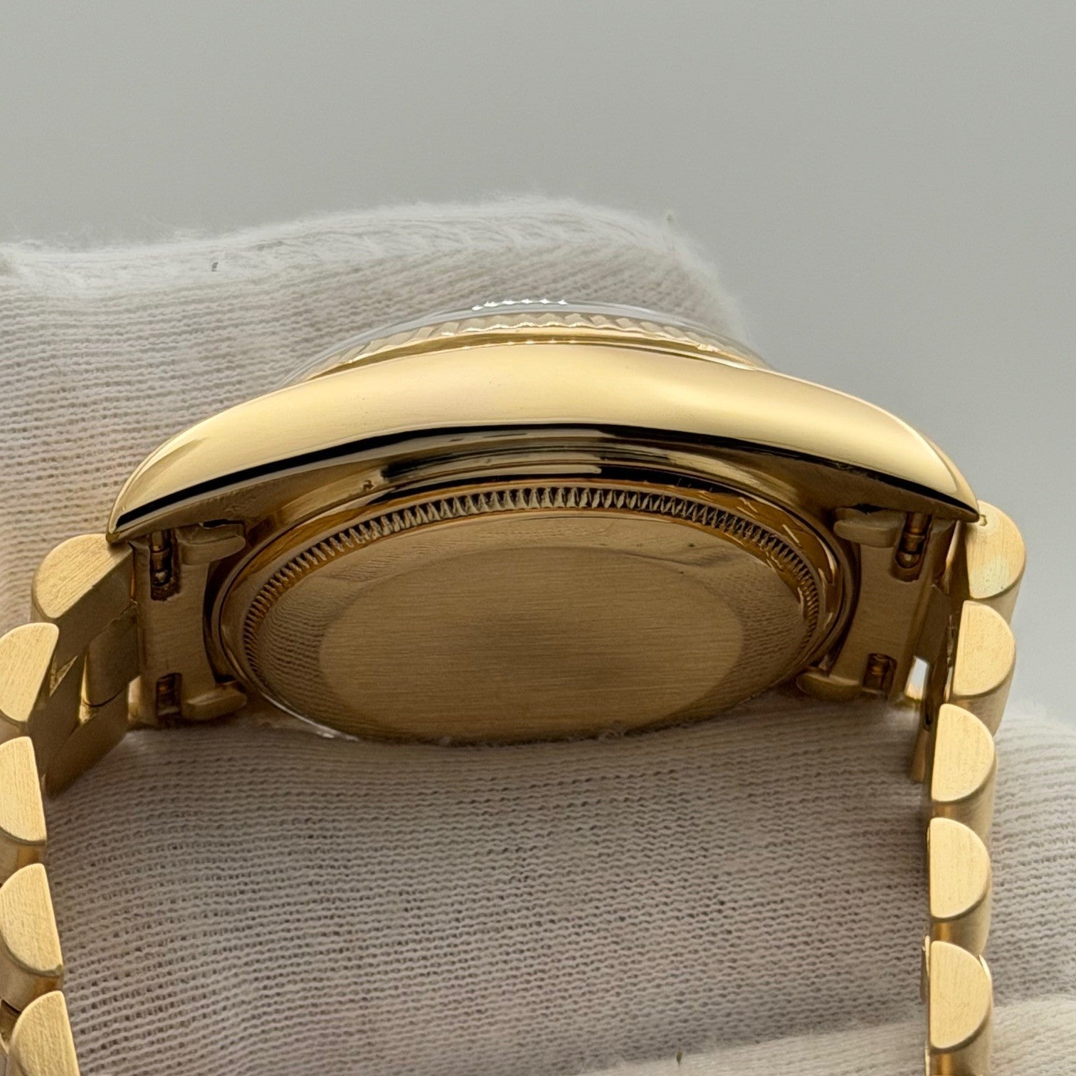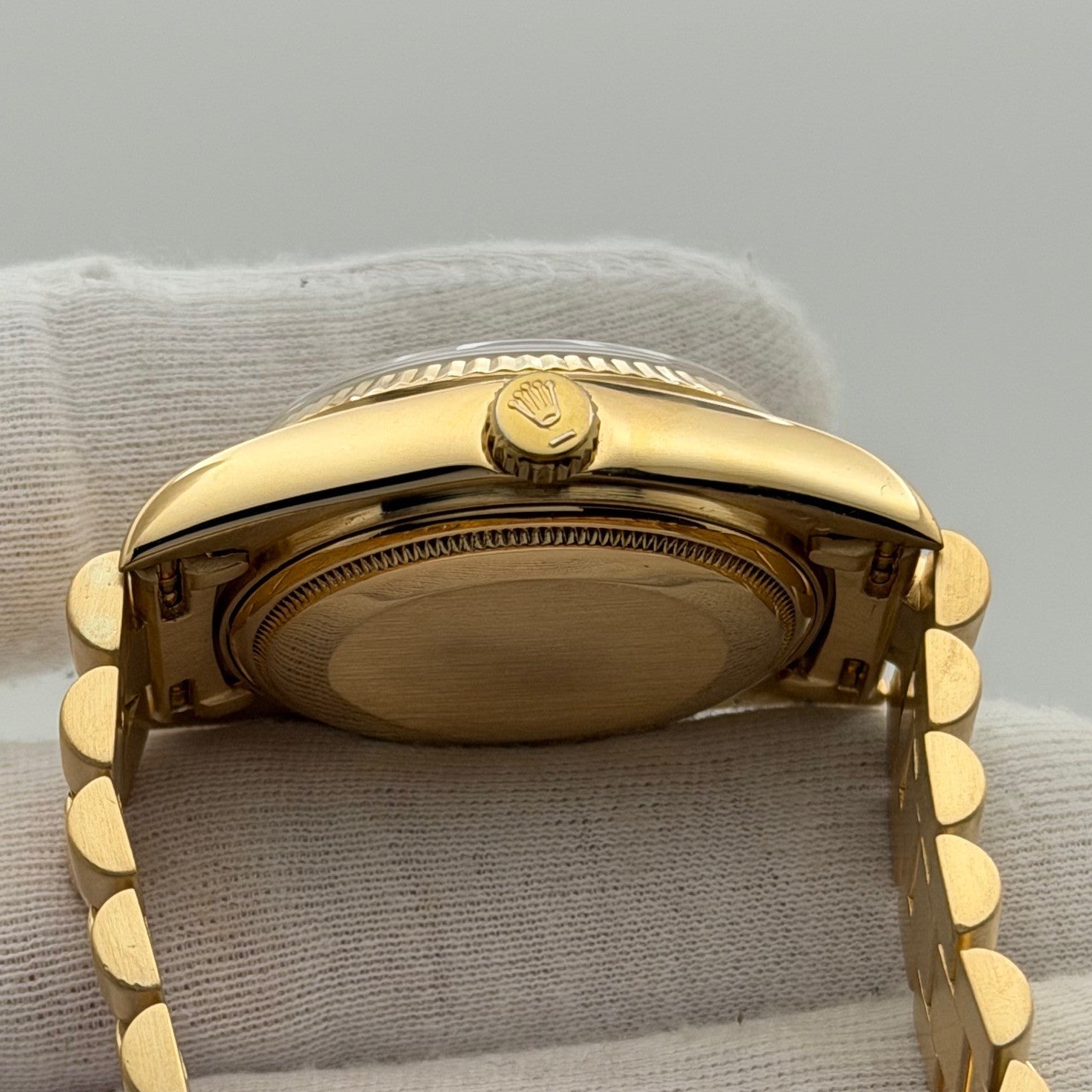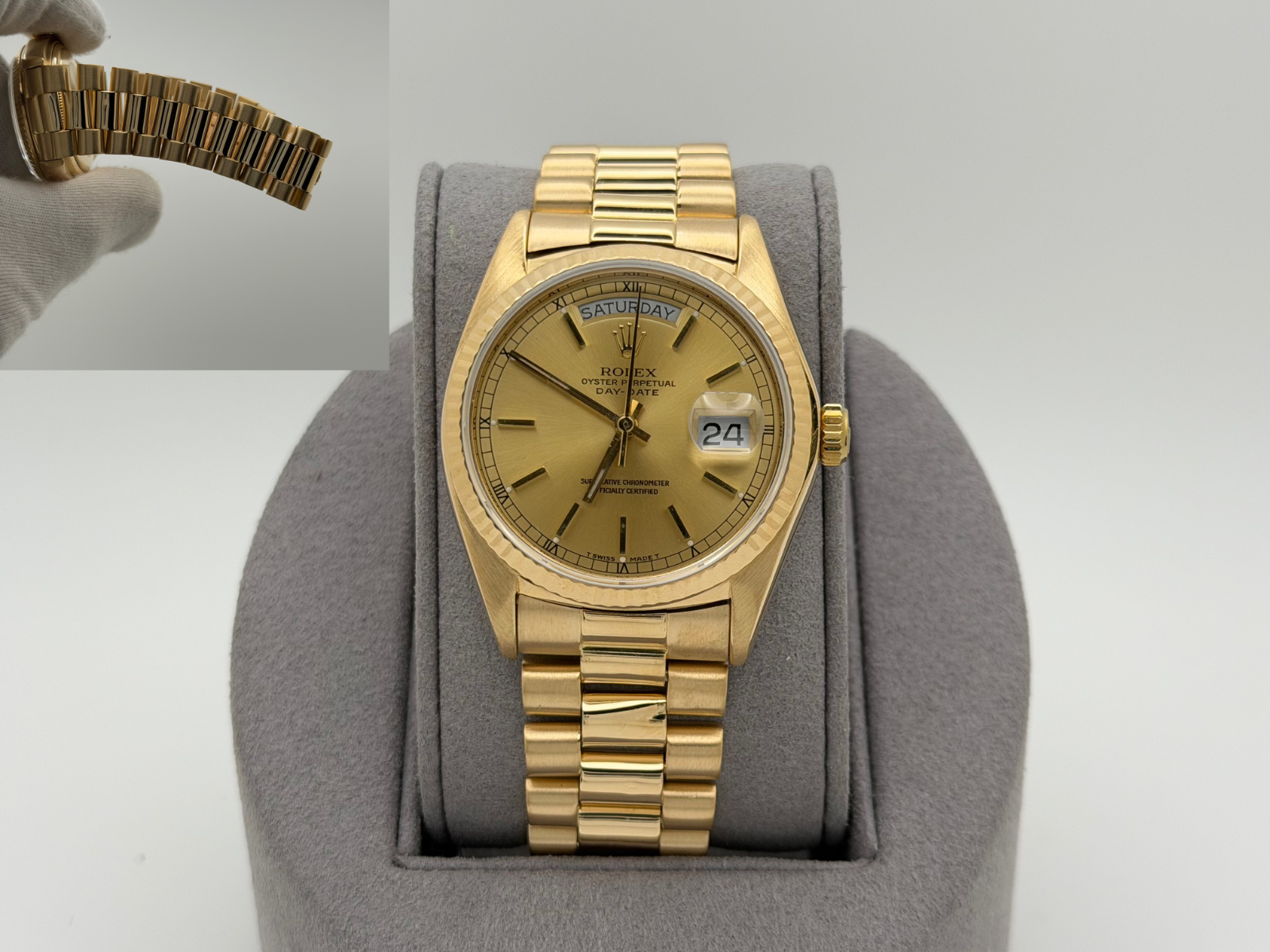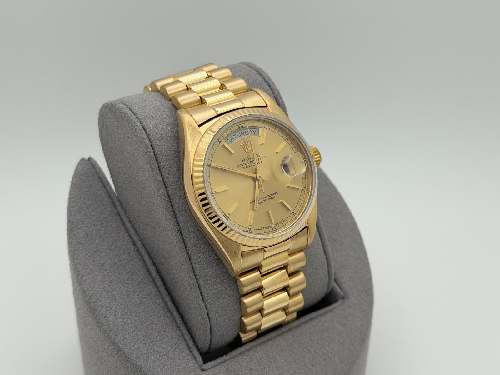Rolex Day Date President 18038 36mm Champagne Dial Quickset 18k Yellow Gold Rolex Sale! from 1799500 /per This item is a recurring or deferred purchase. By continuing, I agree to the cancellation policy and authorize you to charge my payment method at the prices, frequency and dates listed on this page until my order is fulfilled or I cancel, if permitted. +1 (619) 232-1273 This item is currently on backorder but you can still purchase it now and we'll ship as soon as more become available. Style Number: 18038Serial: 644****Year: 1980 Model: Rolex Day-Date President Case Material: 18k Yellow Gold Band: 18k Yellow Gold President Bezel: 18k Yellow Gold Fluted Dial: Champagne Dial Crystal: Sapphire Case Size: 36mm Includes: - Elegant Watch Box- Certified Appraisal - 1 Year WarrantySKU 23453 / 145075TJD112025