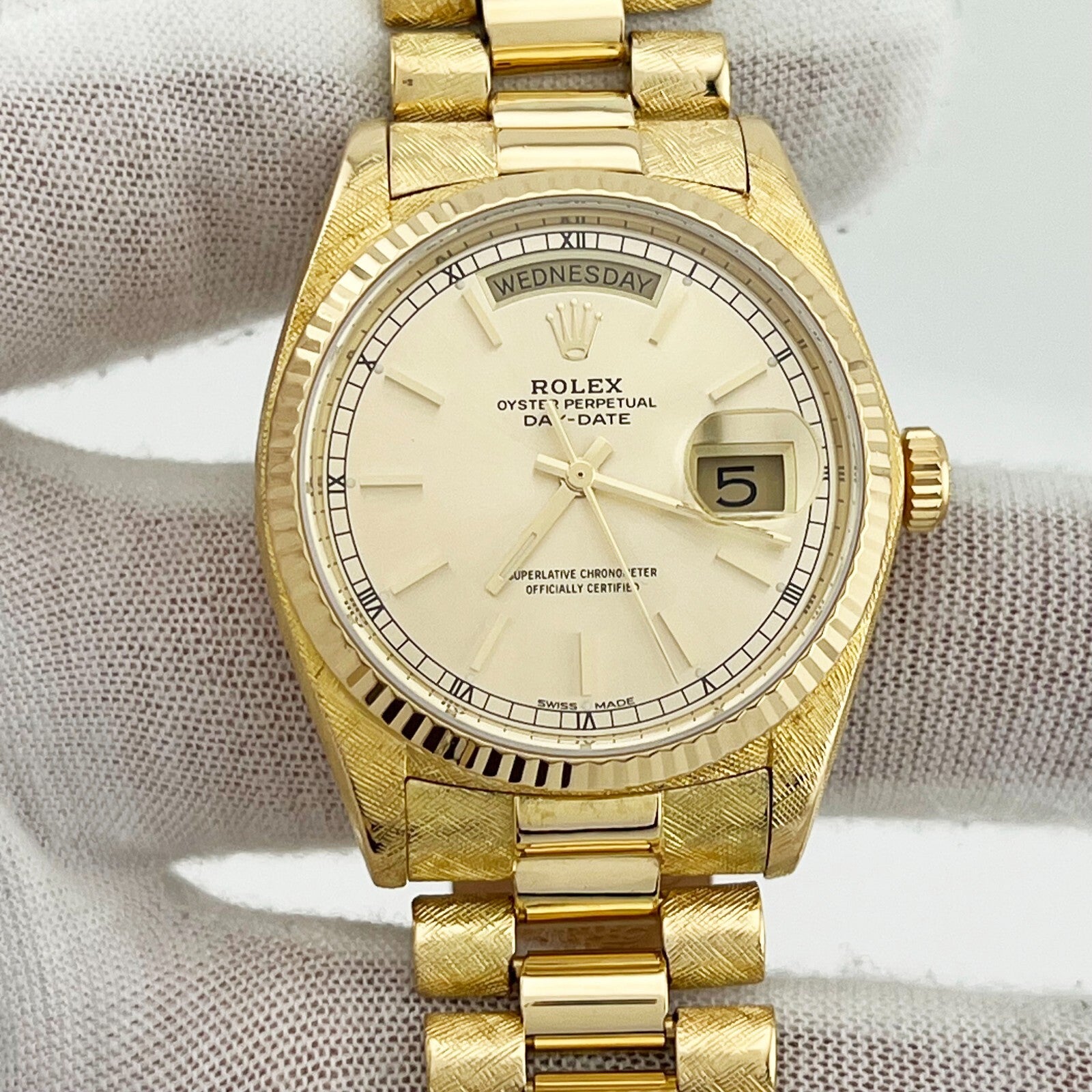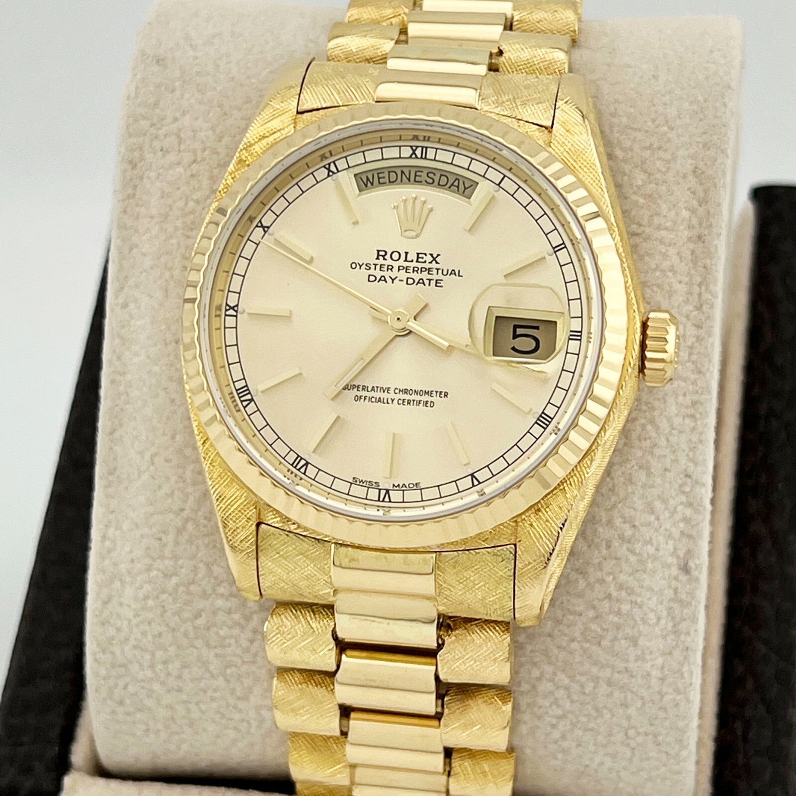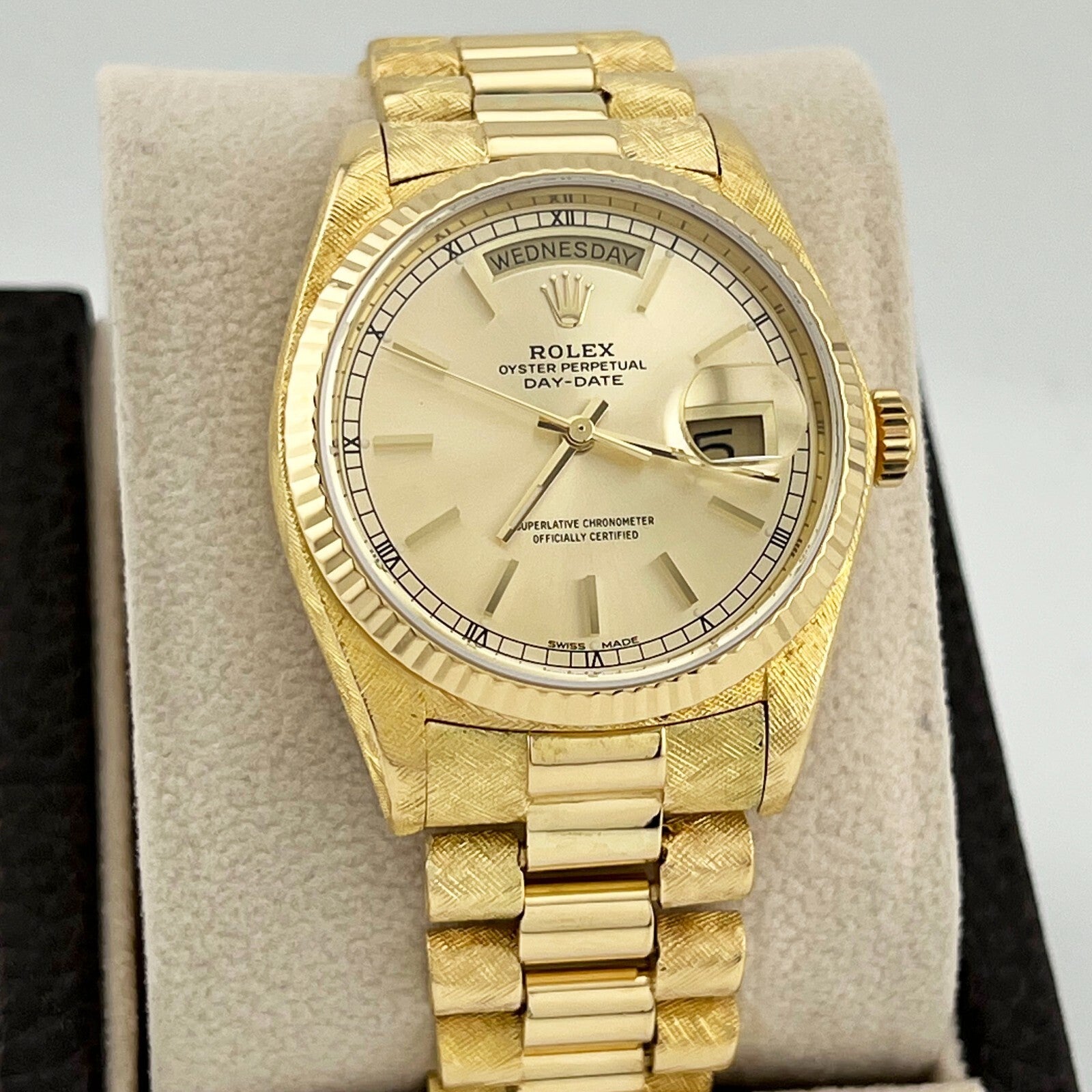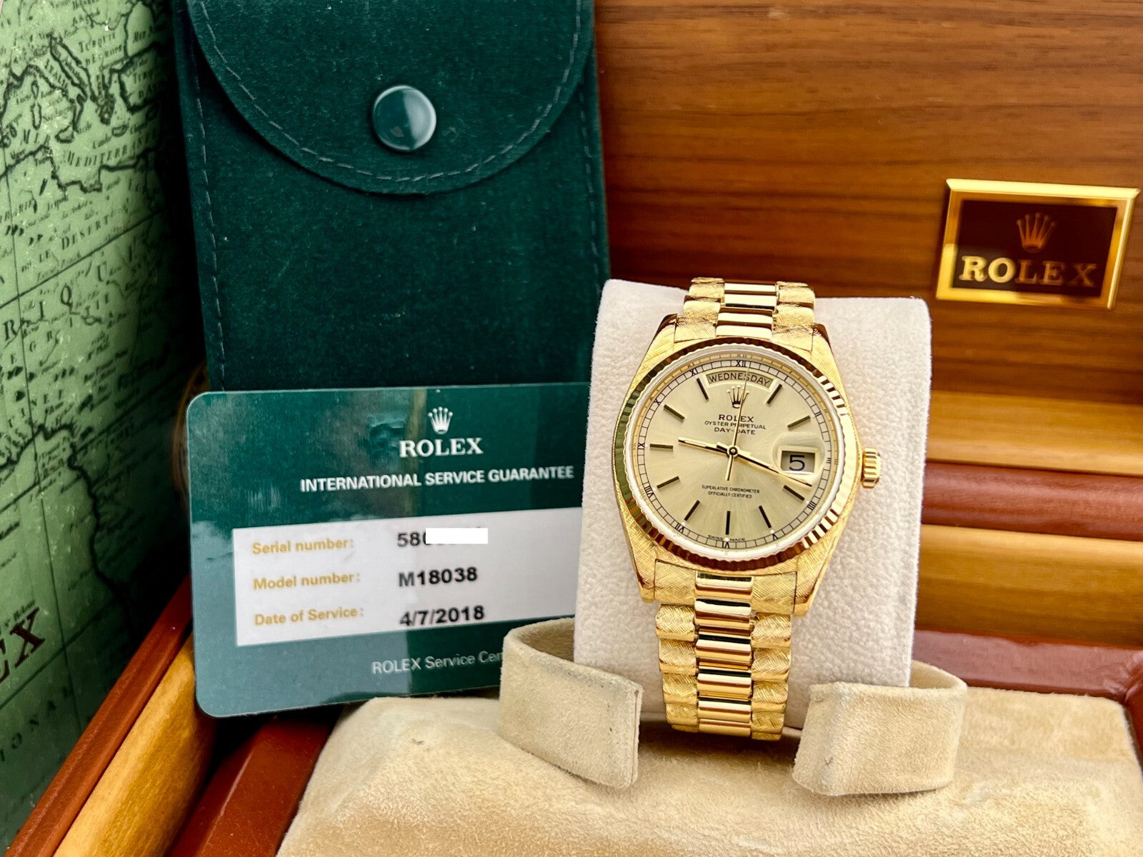 Rolex Day Date President 18038 Florentine 18K Yellow Gold Box Service Card Rolex Sale! from 1649500 /per This item is a recurring or deferred purchase. By continuing, I agree to the cancellation policy and authorize you to charge my payment method at the prices, frequency and dates listed on this page until my order is fulfilled or I cancel, if permitted. +1 (619) 232-1273 This item is currently on backorder but you can still purchase it now and we'll ship as soon as more become available. Style Number: 18038 Serial: 5803*** Year: 1979 Model: Rolex Day Date President - Florentine Finish Case Material: 18K Yellow Gold Florentine Band: 18K Yellow Gold Florentine Bezel: 18K Yellow Gold Dial: Champagne Dial Face: Sapphire Crystal Case Size: 36mm Includes: -Rolex Box & Service Card -Certified Appraisal -1 Year Warranty SKU 21957 / 136000TSD120424