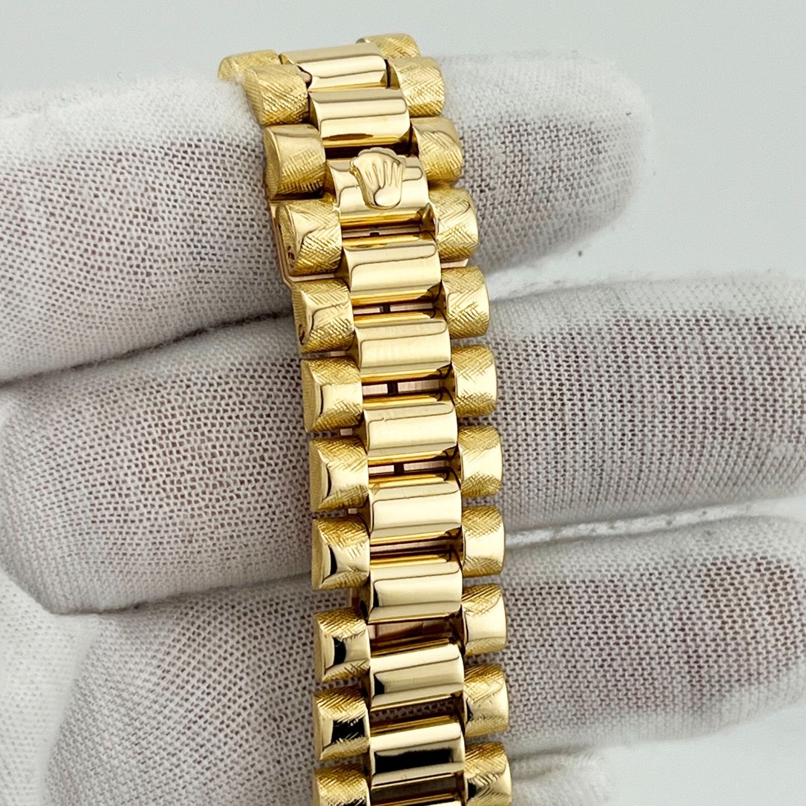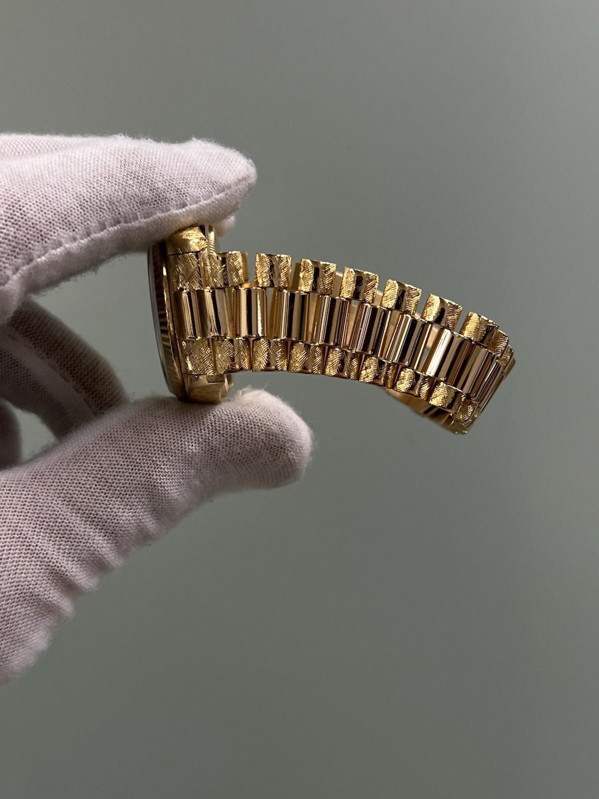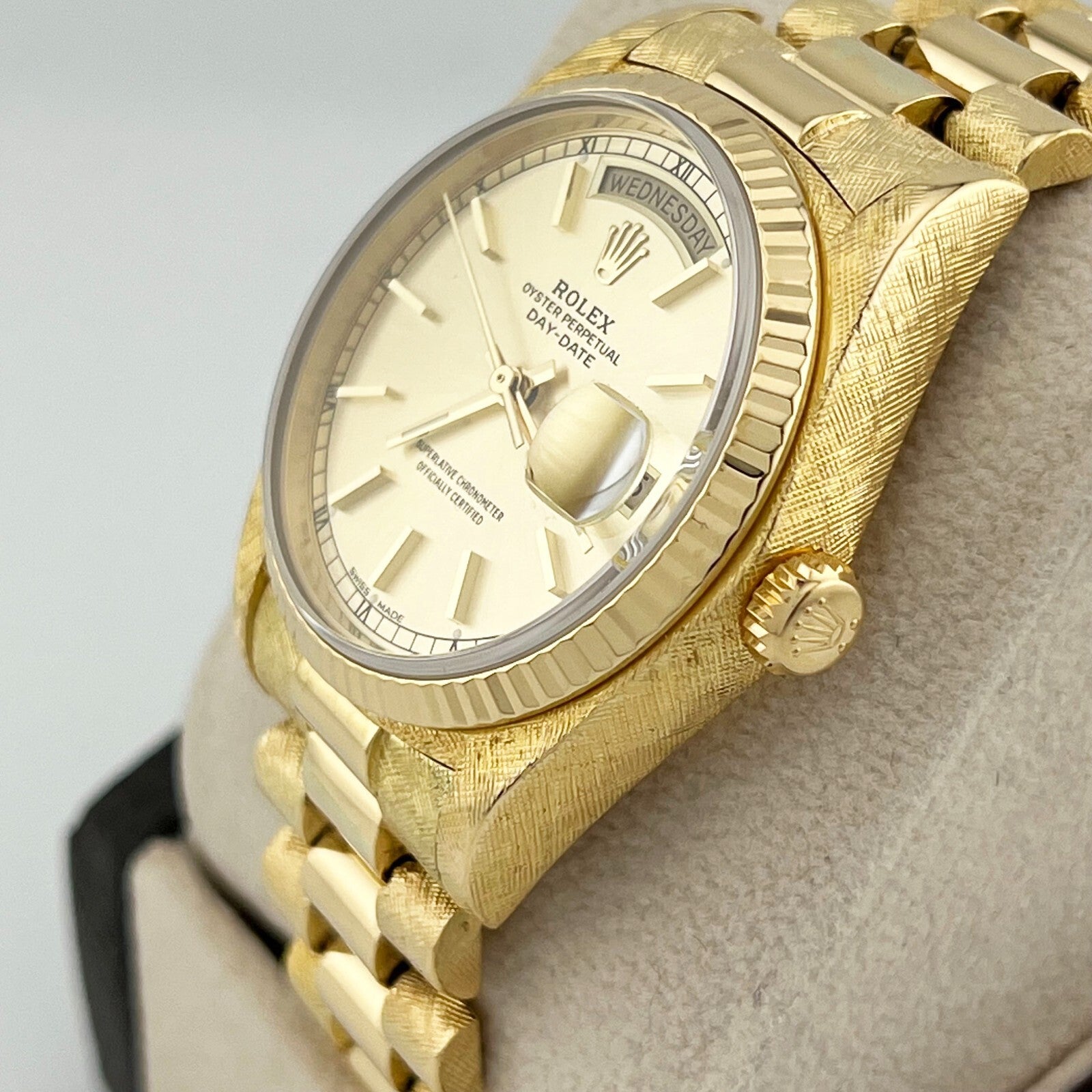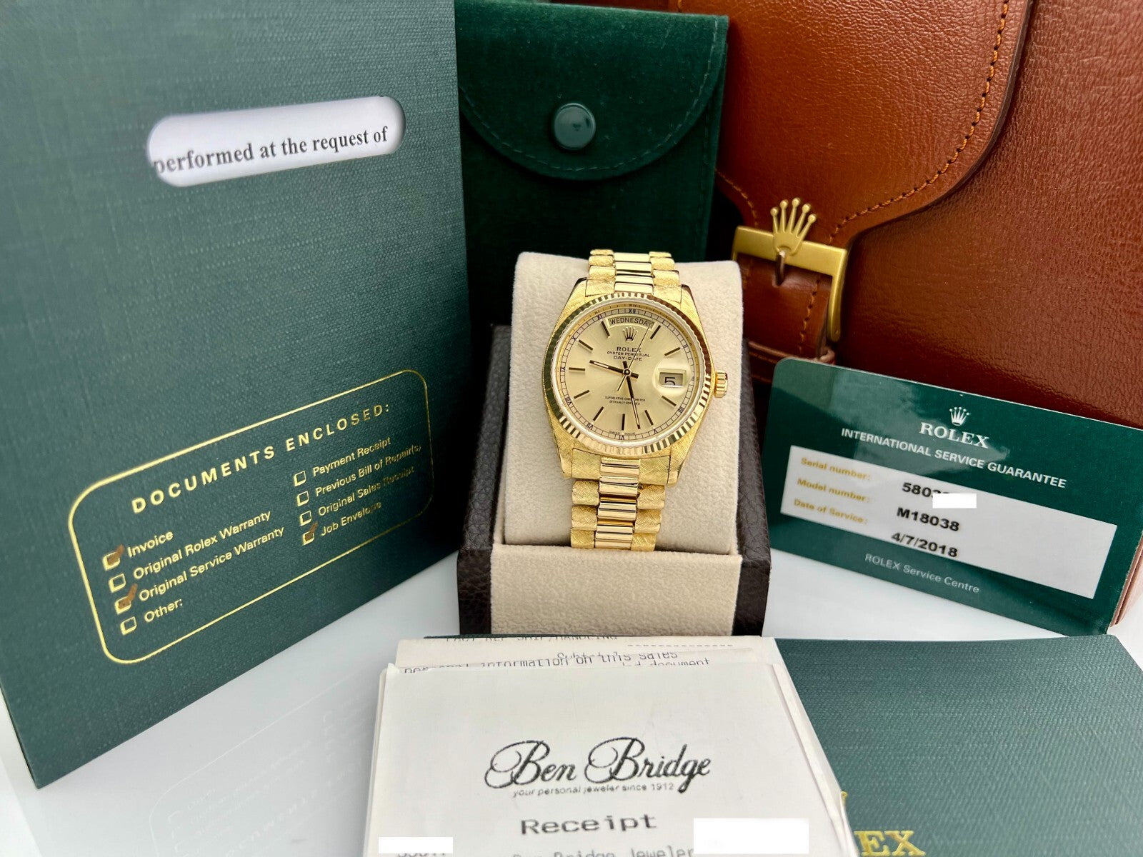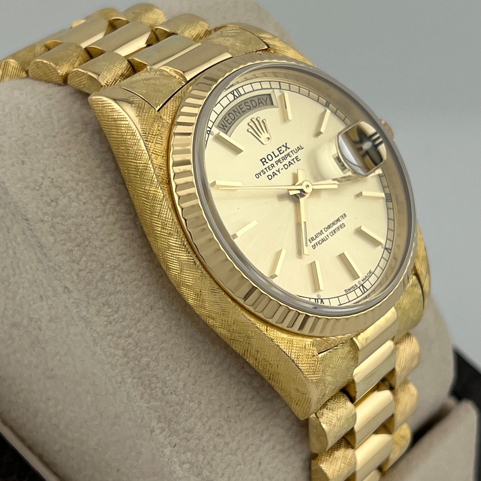 Rolex Day Date President 18038 Florentine 18K Yellow Gold Box Service Card Rolex Sale! from 1649500 /per This item is a recurring or deferred purchase. By continuing, I agree to the cancellation policy and authorize you to charge my payment method at the prices, frequency and dates listed on this page until my order is fulfilled or I cancel, if permitted. +1 (619) 232-1273 This item is currently on backorder but you can still purchase it now and we'll ship as soon as more become available. Style Number: 18038 Serial: 5803*** Year: 1979 Model: Rolex Day Date President - Florentine Finish Case Material: 18K Yellow Gold Florentine Band: 18K Yellow Gold Florentine Bezel: 18K Yellow Gold Dial: Champagne Dial Face: Sapphire Crystal Case Size: 36mm Includes: -Rolex Box & Service Card -Certified Appraisal -1 Year Warranty SKU 21957 / 136000TSD120424