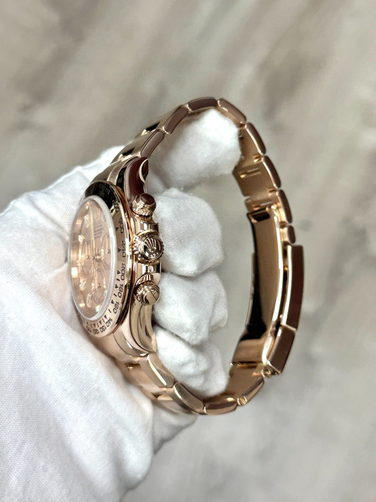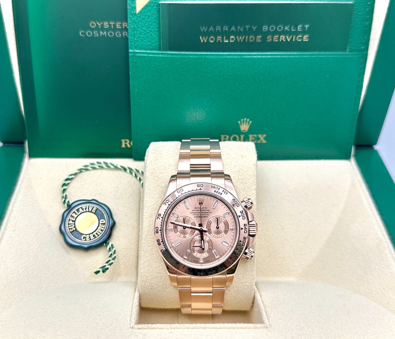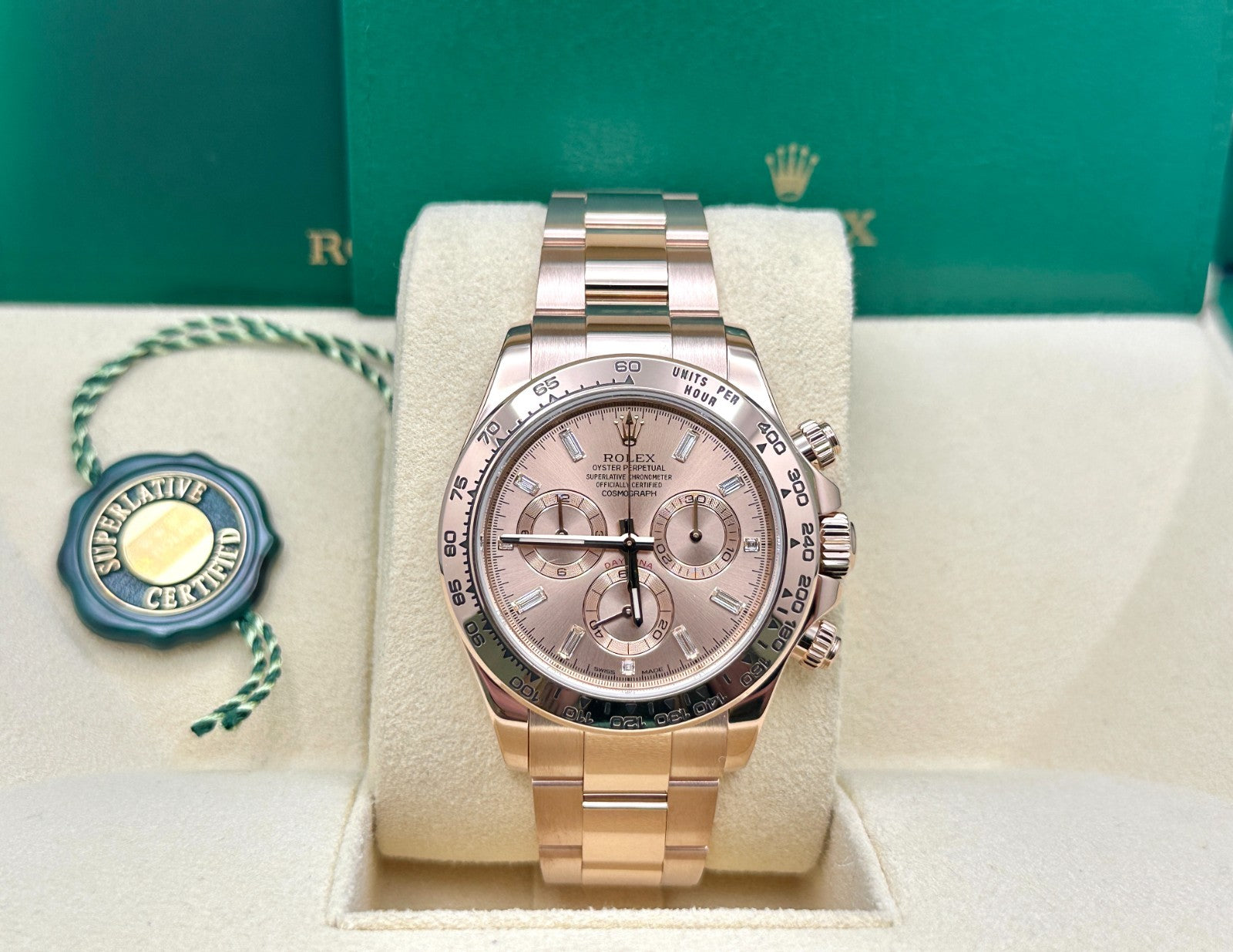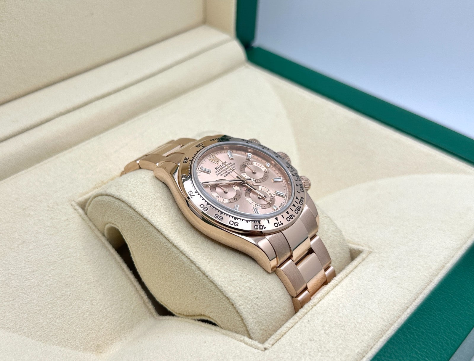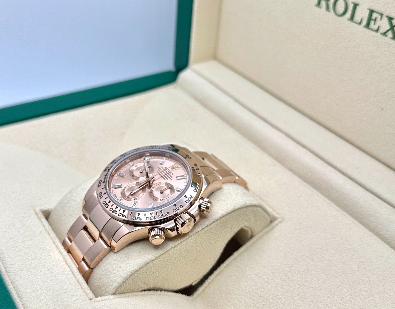 Rolex Daytona 116505 Sundust Baguette Diamond Dial 18K Rose Gold Box Booklets Rolex Sale! from 5399500 /per This item is a recurring or deferred purchase. By continuing, I agree to the cancellation policy and authorize you to charge my payment method at the prices, frequency and dates listed on this page until my order is fulfilled or I cancel, if permitted. +1 (619) 232-1273 This item is currently on backorder but you can still purchase it now and we'll ship as soon as more become available. Style Number: 116505Serial: 89720*** Model: Rolex Daytona Cosmograph Case Material: 18K Rose Gold Band: 18K Rose Gold Bezel: 18K Rose Gold Dial: Factory Sundust Baguette Diamond Dial Crystal: Sapphire Crystal Case Size: 40mm Includes: - Rolex Box & Booklets- Certified Appraisal - 2 Year WarrantySKU 23546 / 187750TJF010656