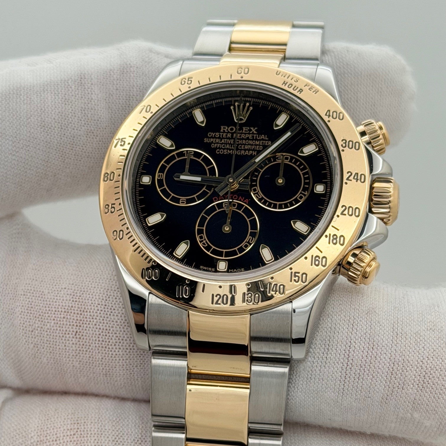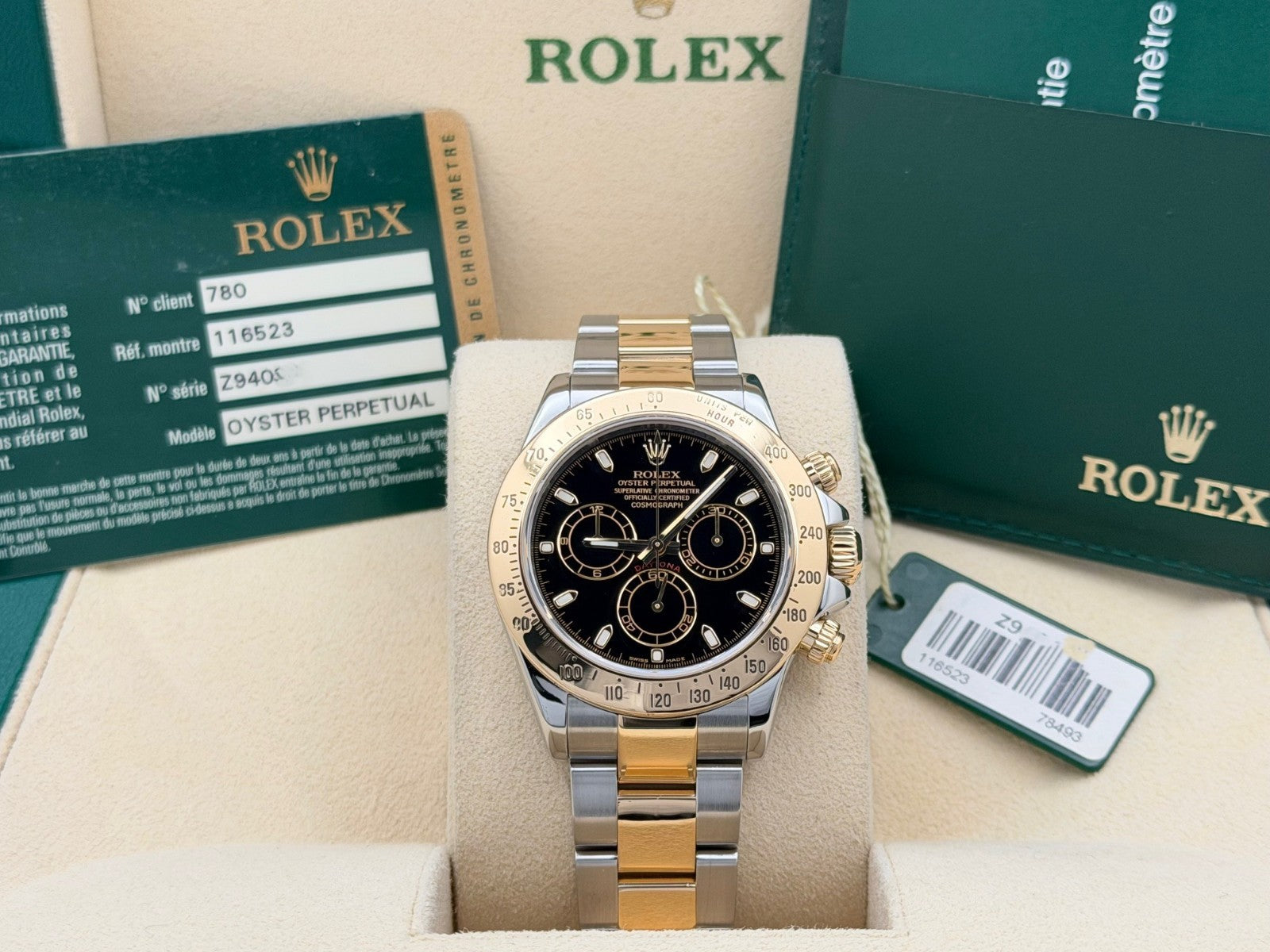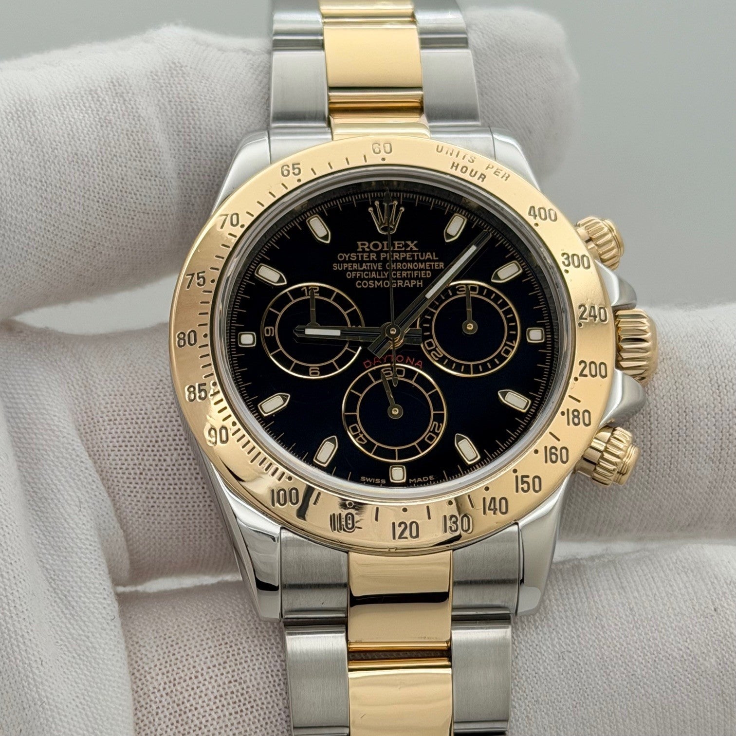 Rolex Daytona 116523 40mm Black Dial 18k Yellow Gold Stainless Steel Box Paper Rolex Sale! from 1959500 /per This item is a recurring or deferred purchase. By continuing, I agree to the cancellation policy and authorize you to charge my payment method at the prices, frequency and dates listed on this page until my order is fulfilled or I cancel, if permitted. +1 (619) 232-1273 This item is currently on backorder but you can still purchase it now and we'll ship as soon as more become available. Style Number: 116523Serial: Z94****Year: 2007 Model: Rolex Daytona Cosmograph Case Material: Stainless Steel Band: 18k Yellow Gold & Stainless Steel Bezel: 18k Yellow Gold Dial: Black Crystal: Sapphire Case Size: 40mm Includes: - Rolex Box & Paper- Certified Appraisal - 1 Year WarrantySKU 23398 / 147625TSD120225