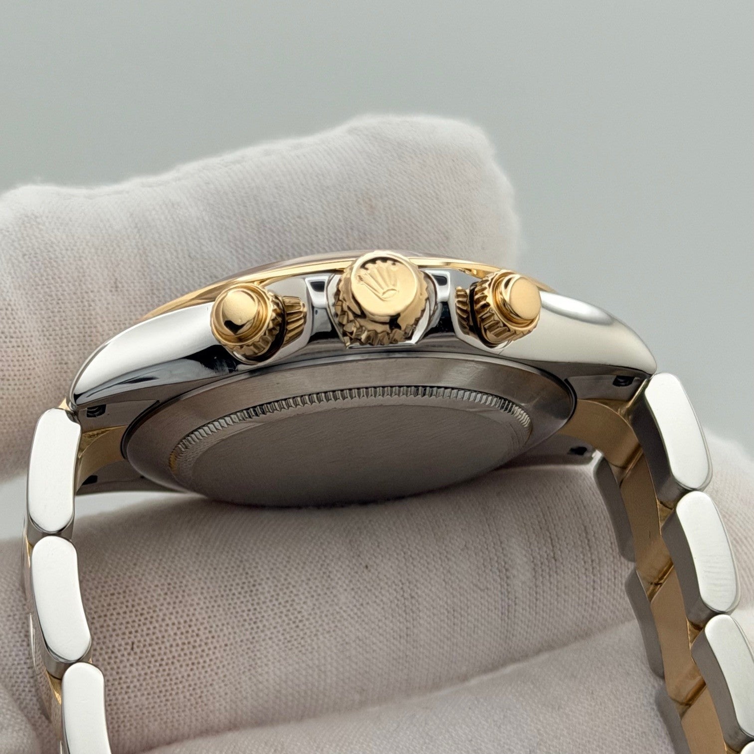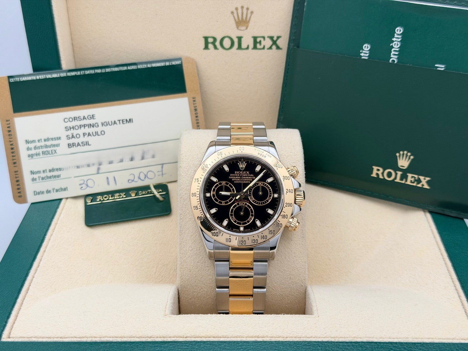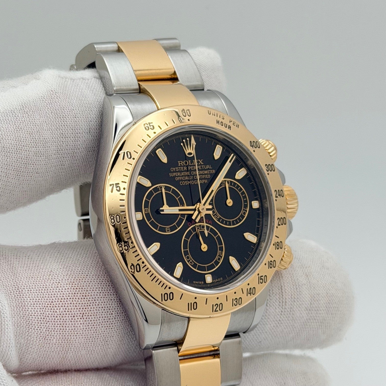 Rolex Daytona 116523 40mm Black Dial 18k Yellow Gold Stainless Steel Box Paper Rolex Sale! from 1959500 /per This item is a recurring or deferred purchase. By continuing, I agree to the cancellation policy and authorize you to charge my payment method at the prices, frequency and dates listed on this page until my order is fulfilled or I cancel, if permitted. +1 (619) 232-1273 This item is currently on backorder but you can still purchase it now and we'll ship as soon as more become available. Style Number: 116523Serial: Z94****Year: 2007 Model: Rolex Daytona Cosmograph Case Material: Stainless Steel Band: 18k Yellow Gold & Stainless Steel Bezel: 18k Yellow Gold Dial: Black Crystal: Sapphire Case Size: 40mm Includes: - Rolex Box & Paper- Certified Appraisal - 1 Year WarrantySKU 23398 / 147625TSD120225