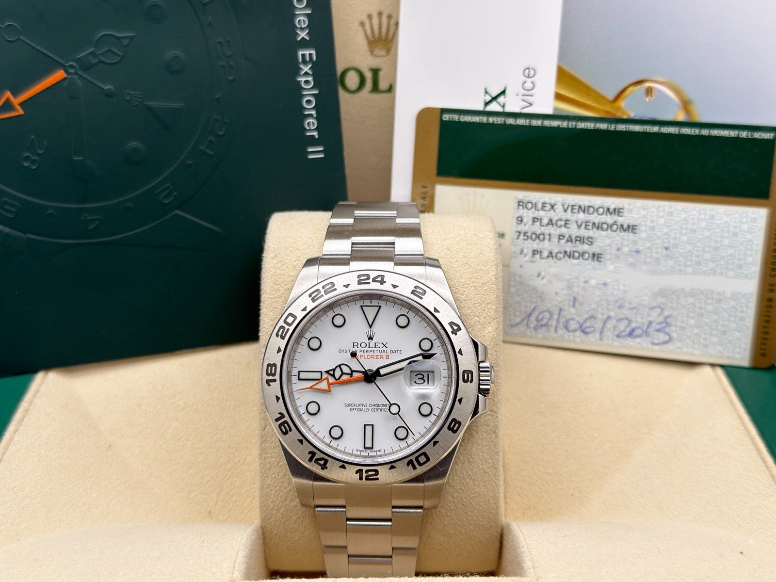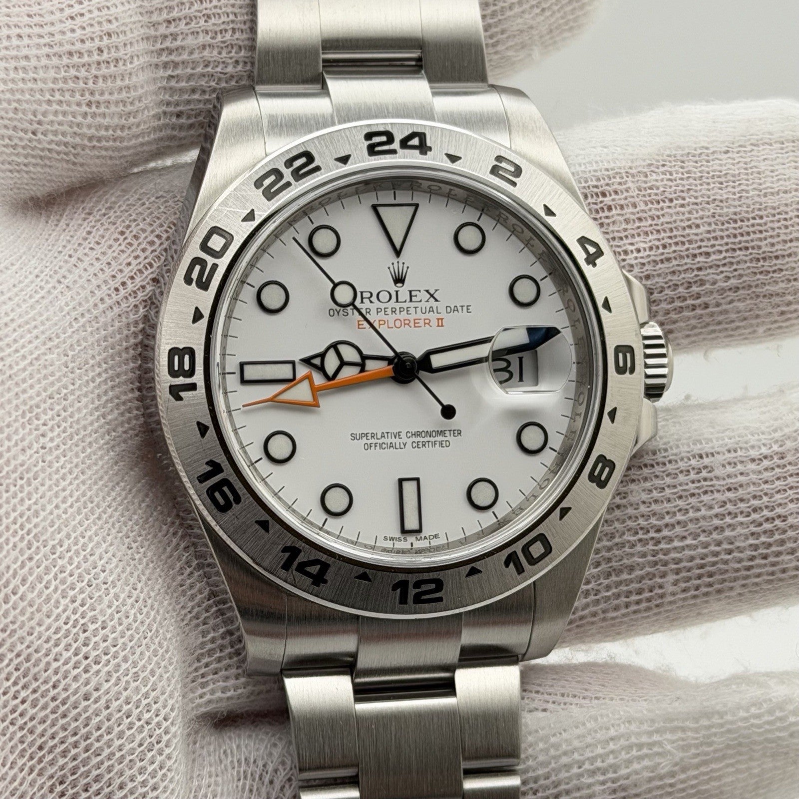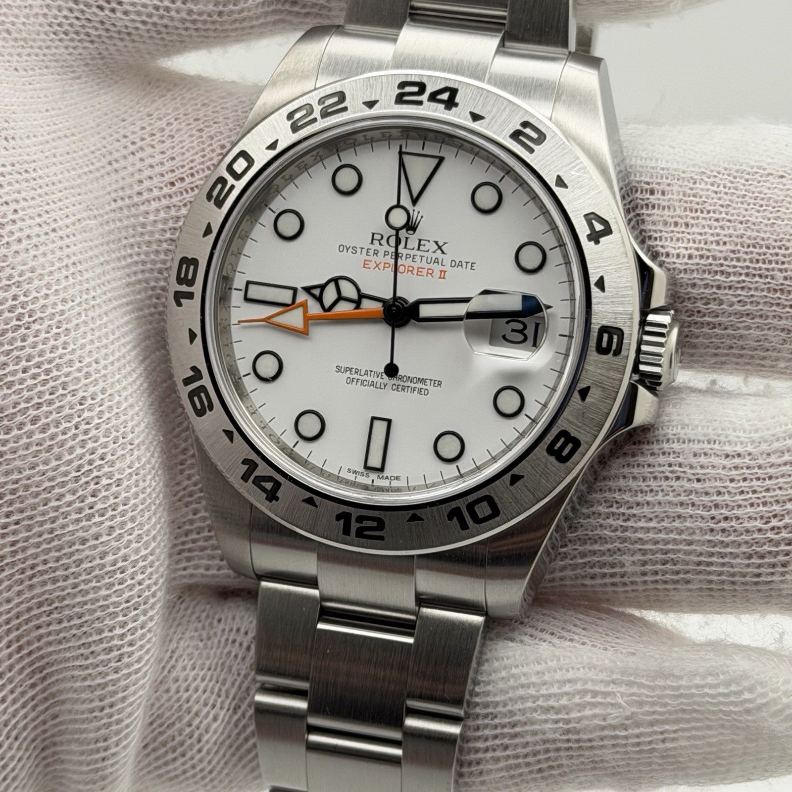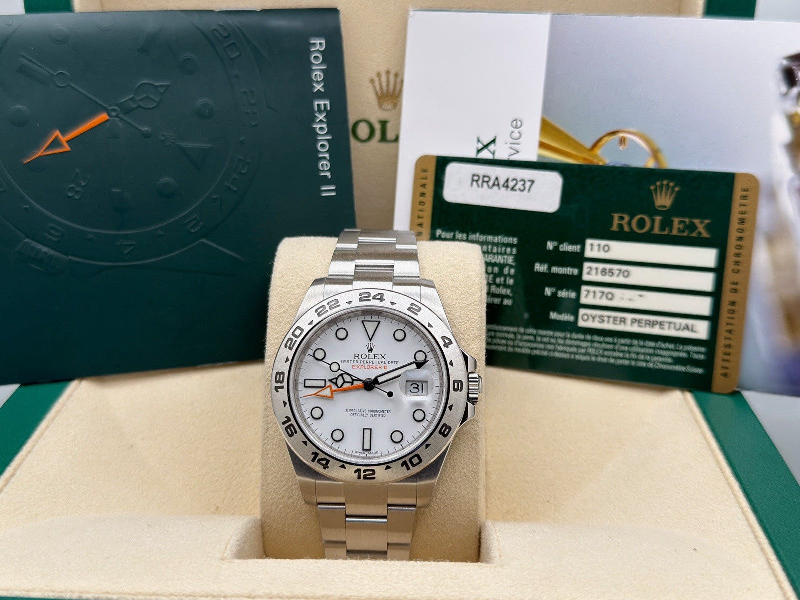 ROLEX Explorer II 216570 42mm Polar White Dial Stainless Steel Box Papers Rolex Sale! from 1039500 /per This item is a recurring or deferred purchase. By continuing, I agree to the cancellation policy and authorize you to charge my payment method at the prices, frequency and dates listed on this page until my order is fulfilled or I cancel, if permitted. +1 (619) 232-1273 This item is currently on backorder but you can still purchase it now and we'll ship as soon as more become available. Style Number: 216570Serial: 717Q****Year: 2013 Model: Rolex Explorer II Case Material: Stainless Steel Band: Stainless Steel Bezel: Stainless Steel Dial: White Polar Crystal: Sapphire Case Size: 42mm Includes: - Rolex Box & Papers- Certified Appraisal - One Year WarrantySKU 23421 / 118825TOFC121125