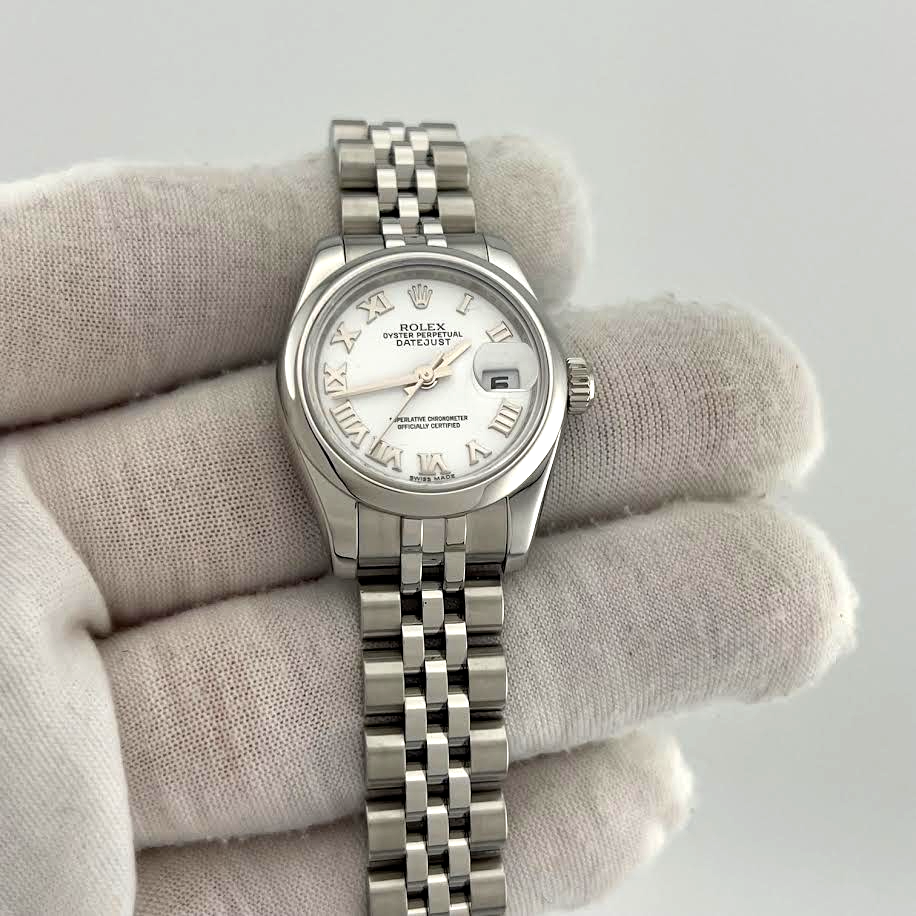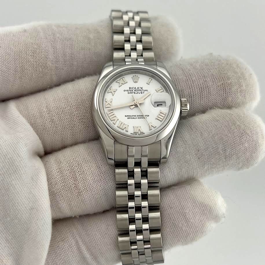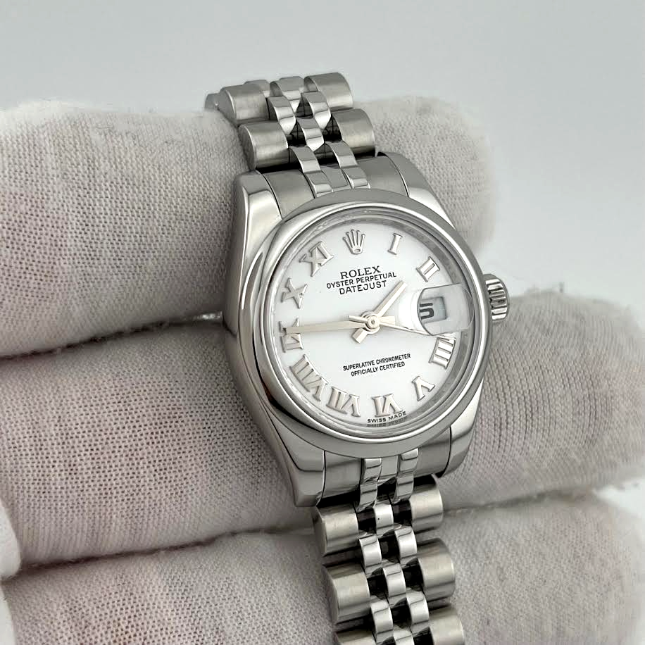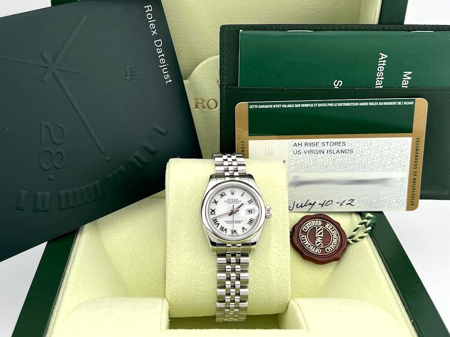 Rolex Ladies Datejust 179160 26mm White Roman Numeral Dial Steel Box Paper Rolex Sale! from 649500 /per This item is a recurring or deferred purchase. By continuing, I agree to the cancellation policy and authorize you to charge my payment method at the prices, frequency and dates listed on this page until my order is fulfilled or I cancel, if permitted. +1 (619) 232-1273 This item is currently on backorder but you can still purchase it now and we'll ship as soon as more become available. Style Number: 179160Serial: V02****Year: 2012 Model: Rolex Ladies Datejust Case Material: Stainless Steel Band: Stainless Steel Jubilee Bezel: Stainless Steel Dial: White Roman Numeral Dial Crystal: Sapphire Case Size: 26mm Includes: - Rolex Box & Paper- Certified Appraisal - 1 Year WarrantySKU 23197 / 113335TLK101325