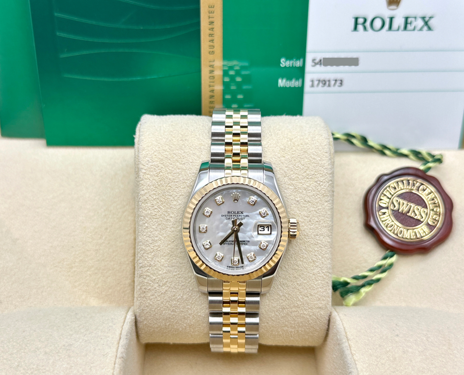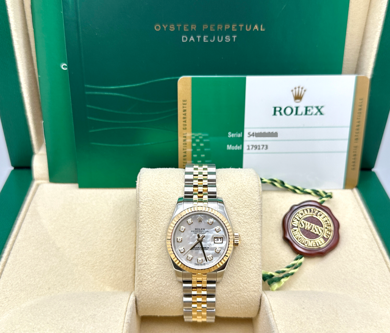 Rolex Ladies Datejust 179173 MOP Diamond Dial 18k Yellow Gold Steel Box Paper