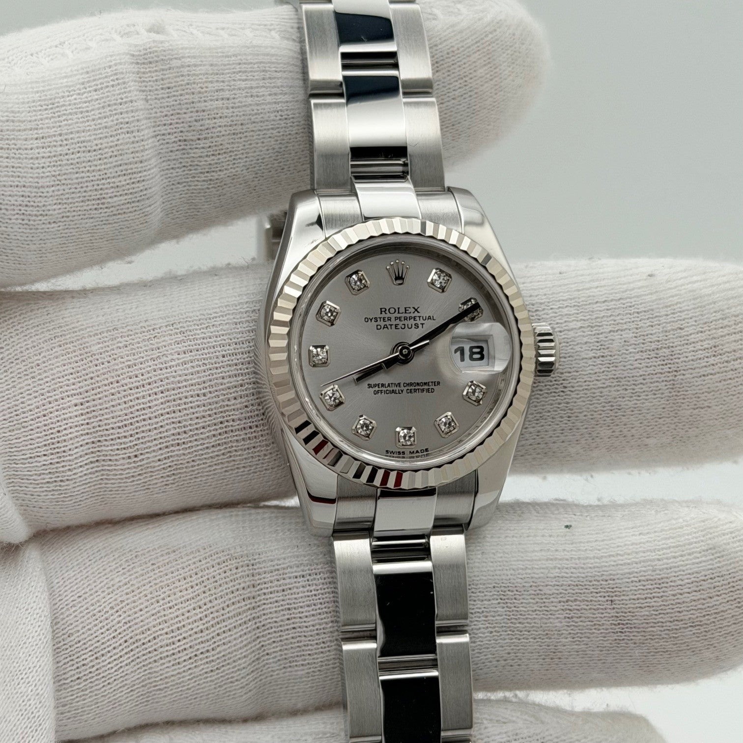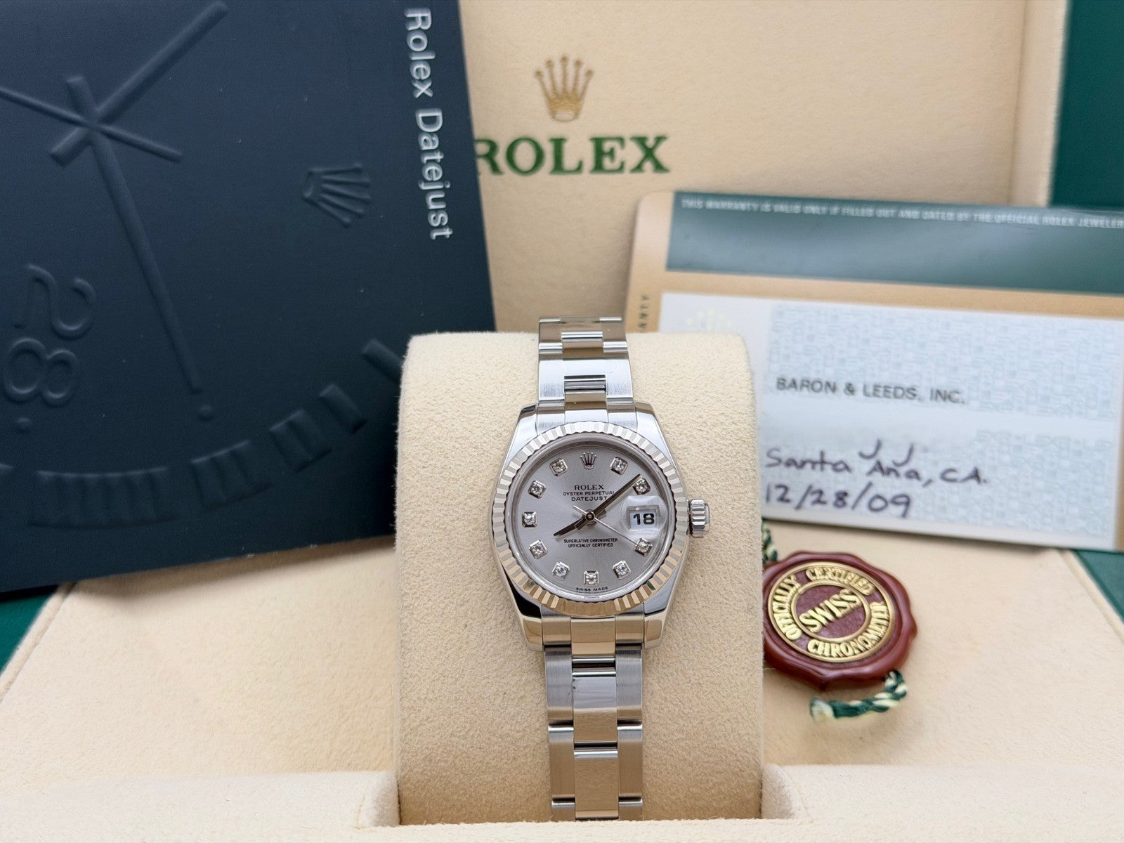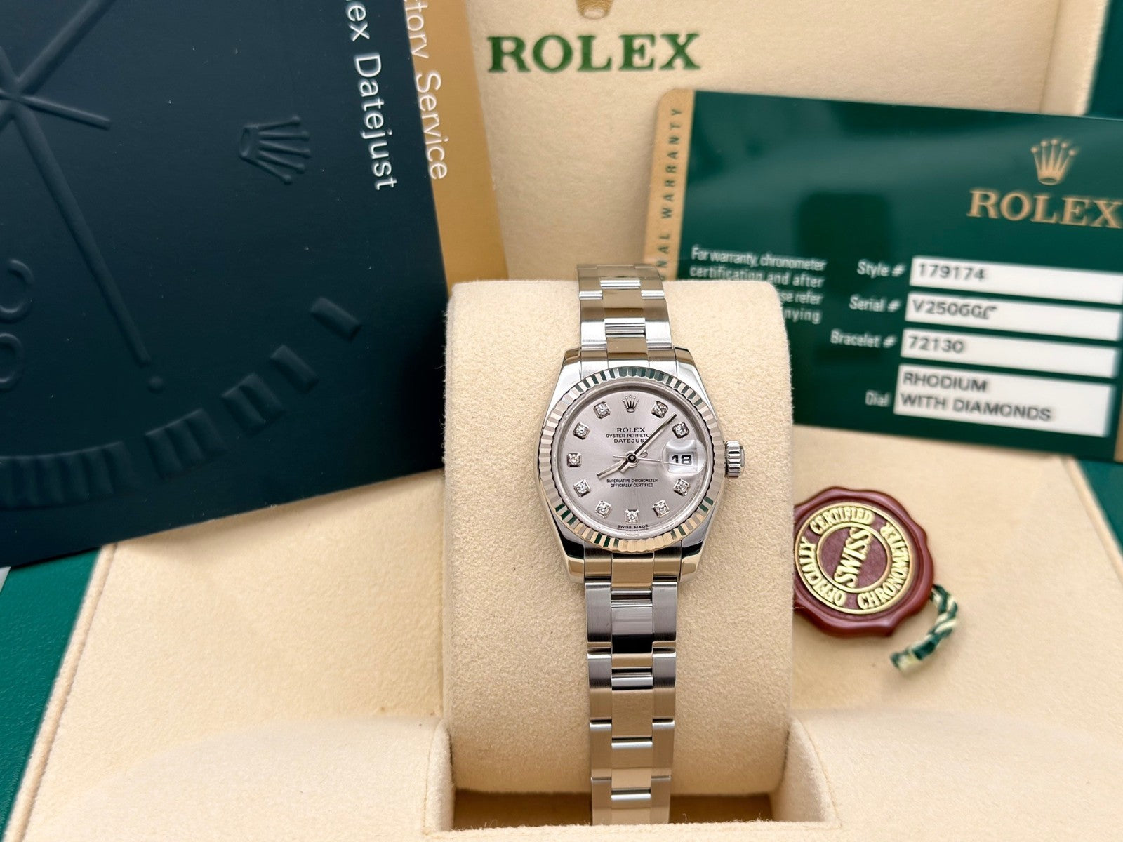 Rolex Ladies Datejust 179174 26mm Silver Diamond Dial 18k Gold Steel Box Paper Rolex Sale! from 829500 /per This item is a recurring or deferred purchase. By continuing, I agree to the cancellation policy and authorize you to charge my payment method at the prices, frequency and dates listed on this page until my order is fulfilled or I cancel, if permitted. +1 (619) 232-1273 This item is currently on backorder but you can still purchase it now and we'll ship as soon as more become available. Style Number: 179174Serial: V25*****Year: 2009 Model: Rolex Ladies Datejust Case Material: Stainless Steel Band: Stainless Steel Bezel: 18k White Gold Fluted Dial: Factory Silver Diamond Dial Crystal: Sapphire Case Size: 26mm Includes: - Rolex Box & Paper- Certified Appraisal - 1 Year WarrantySKU 23367 / 116155TOC111725
