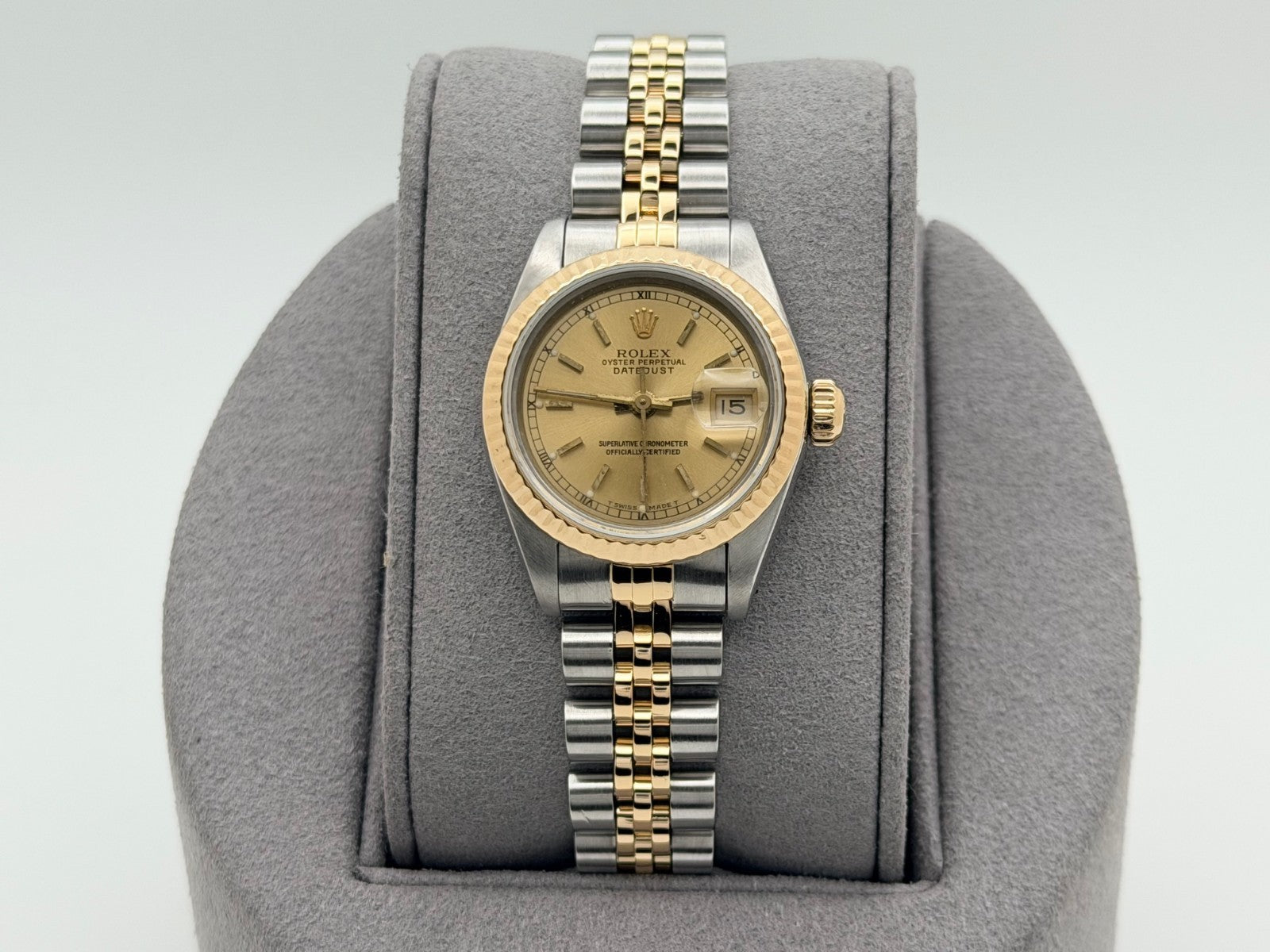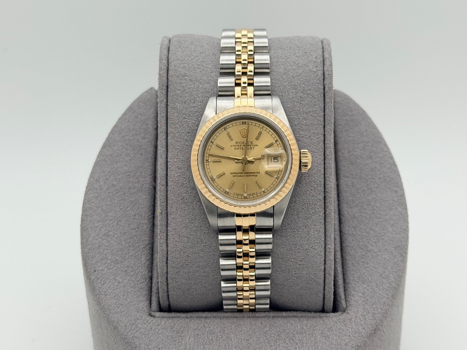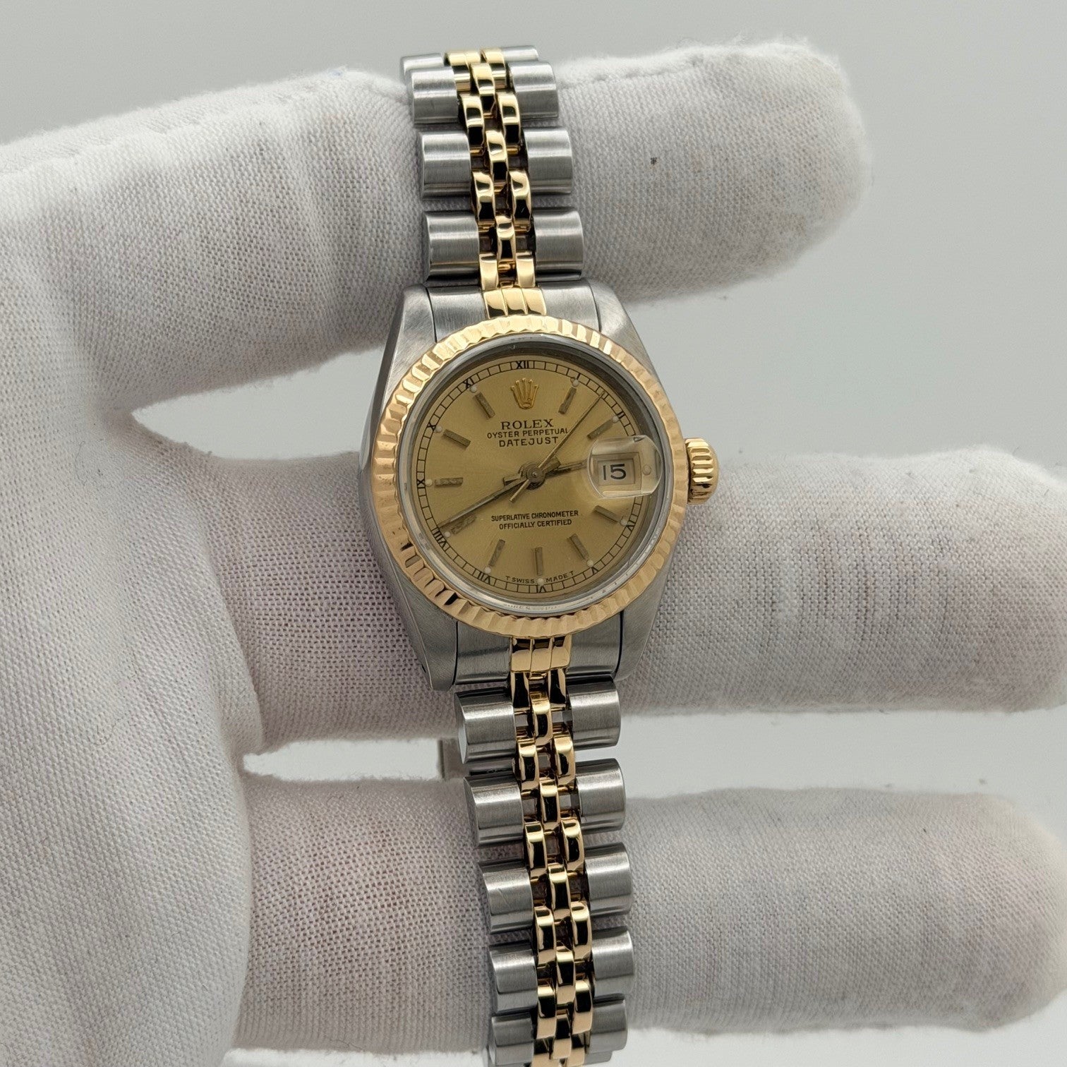 Rolex Ladies Datejust 69173 26mm Champagne Dial 18k Yellow Gold Stainless Steel Rolex Sale! from 489500 /per This item is a recurring or deferred purchase. By continuing, I agree to the cancellation policy and authorize you to charge my payment method at the prices, frequency and dates listed on this page until my order is fulfilled or I cancel, if permitted. +1 (619) 232-1273 This item is currently on backorder but you can still purchase it now and we'll ship as soon as more become available. Style Number: 69173Serial: L71****Year: 1989 Model: Rolex Ladies Datejust Case Material: Stainless Steel Band: 18k Yellow Gold & Stainless Steel Jubilee Bezel: 18k Yellow Gold Fluted Dial: Champagne Index Crystal: Sapphire Case Size: 26mm Includes: - Elegant Watch Box- Certified Appraisal - 1 Year WarrantySKU 23463 / 16015TBB120925
