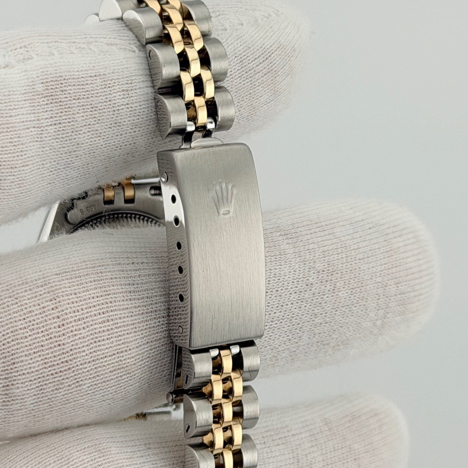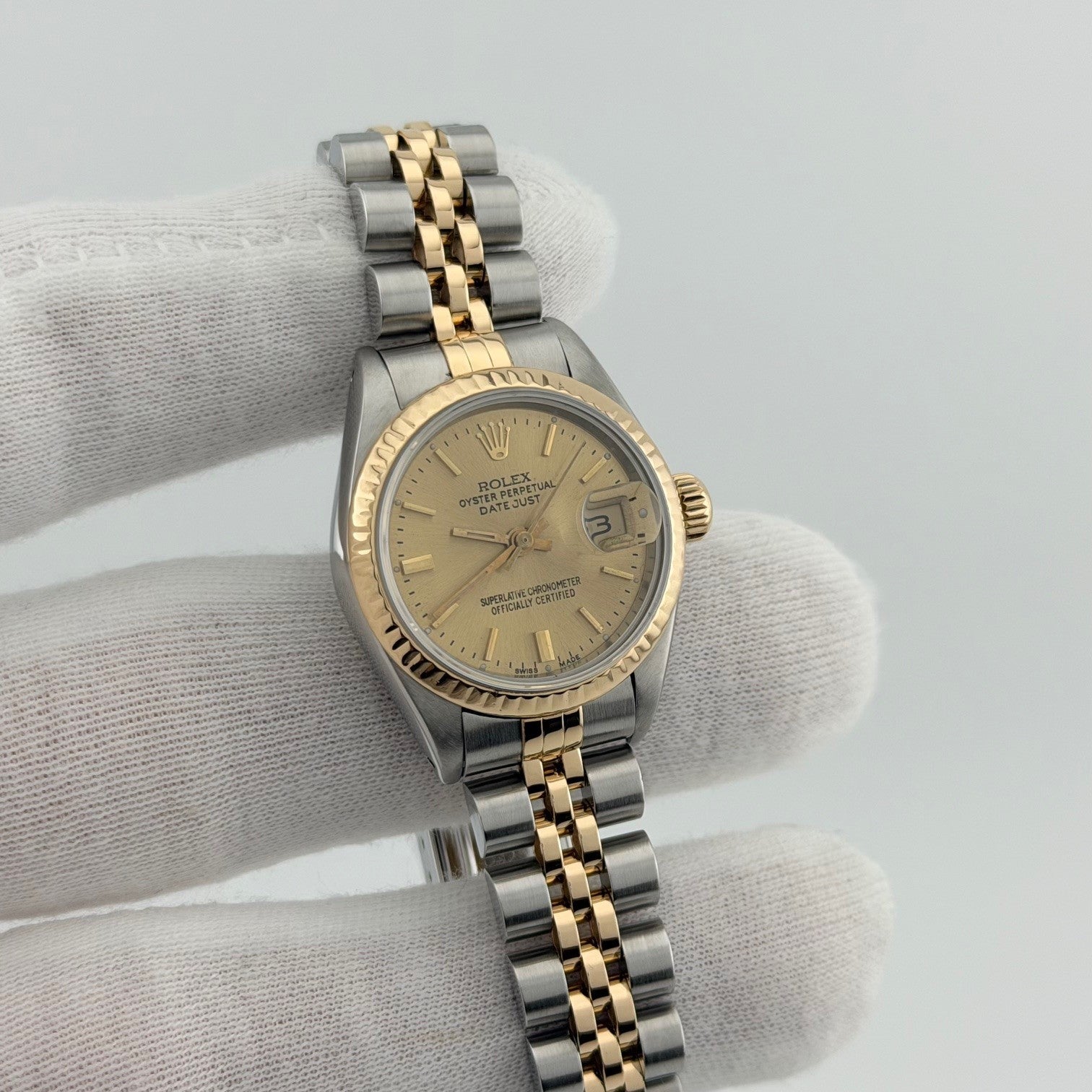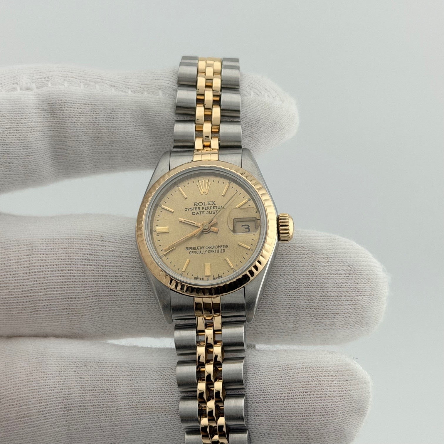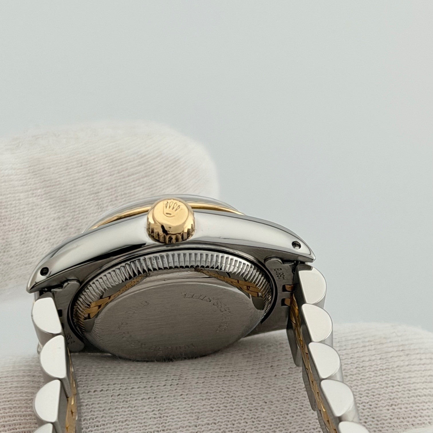 Rolex Ladies Datejust 69173 26mm Champagne Dial 18k Yellow Gold Steel Box Paper Rolex Sale! from 569500 /per This item is a recurring or deferred purchase. By continuing, I agree to the cancellation policy and authorize you to charge my payment method at the prices, frequency and dates listed on this page until my order is fulfilled or I cancel, if permitted. +1 (619) 232-1273 This item is currently on backorder but you can still purchase it now and we'll ship as soon as more become available. Style Number: 69173Serial: 907****Year: 1986 Model: Rolex Ladies Datejust Case Material: Stainless Steel Band: 18k Yellow Gold & Stainless Steel Jubilee Bezel: 18k Yellow Gold Fluted Dial: Champagne Dial Crystal: Sapphire Case Size: 26mm Includes: - Rolex Box & Paper- Certified Appraisal - 1 Year WarrantySKU 22840 / 16600TOFCSD