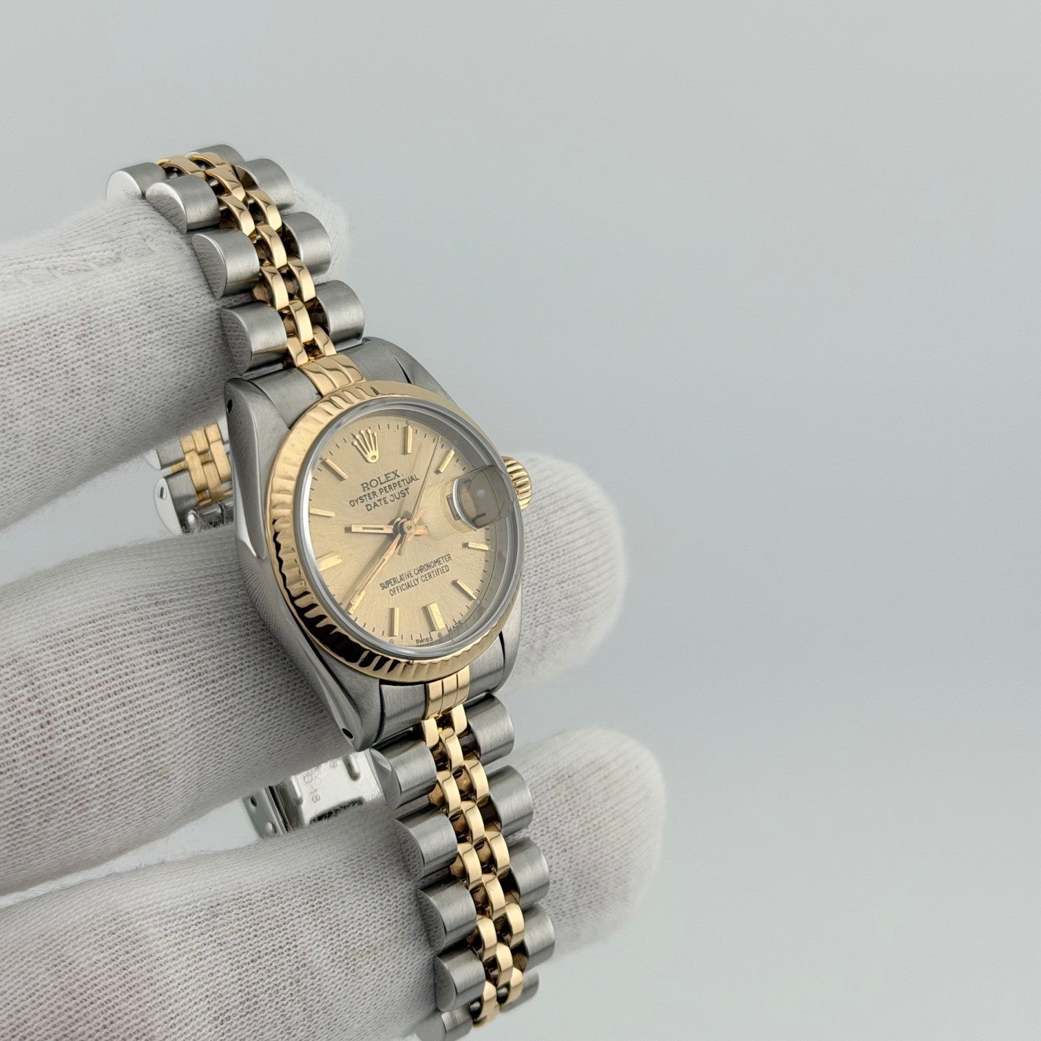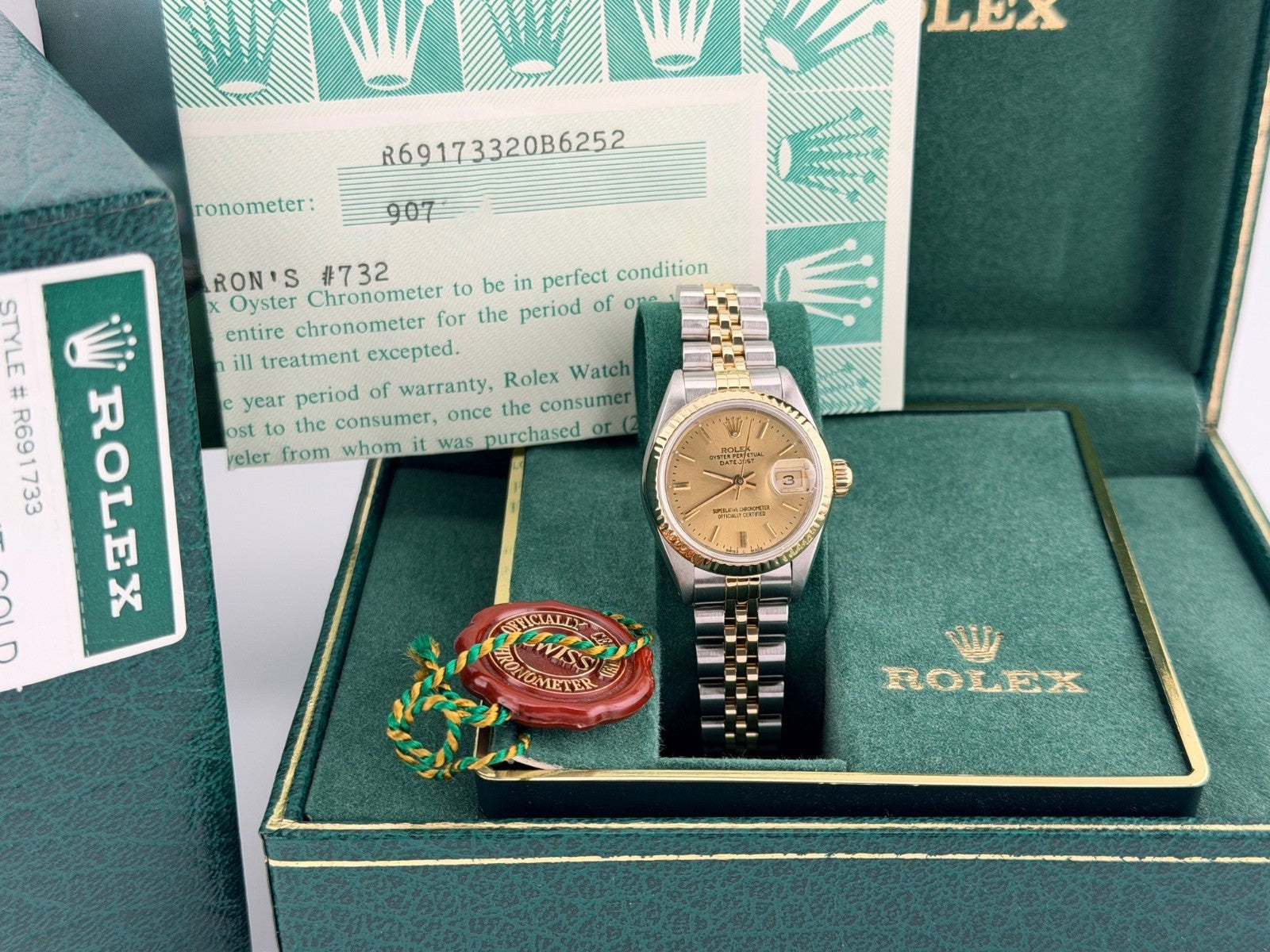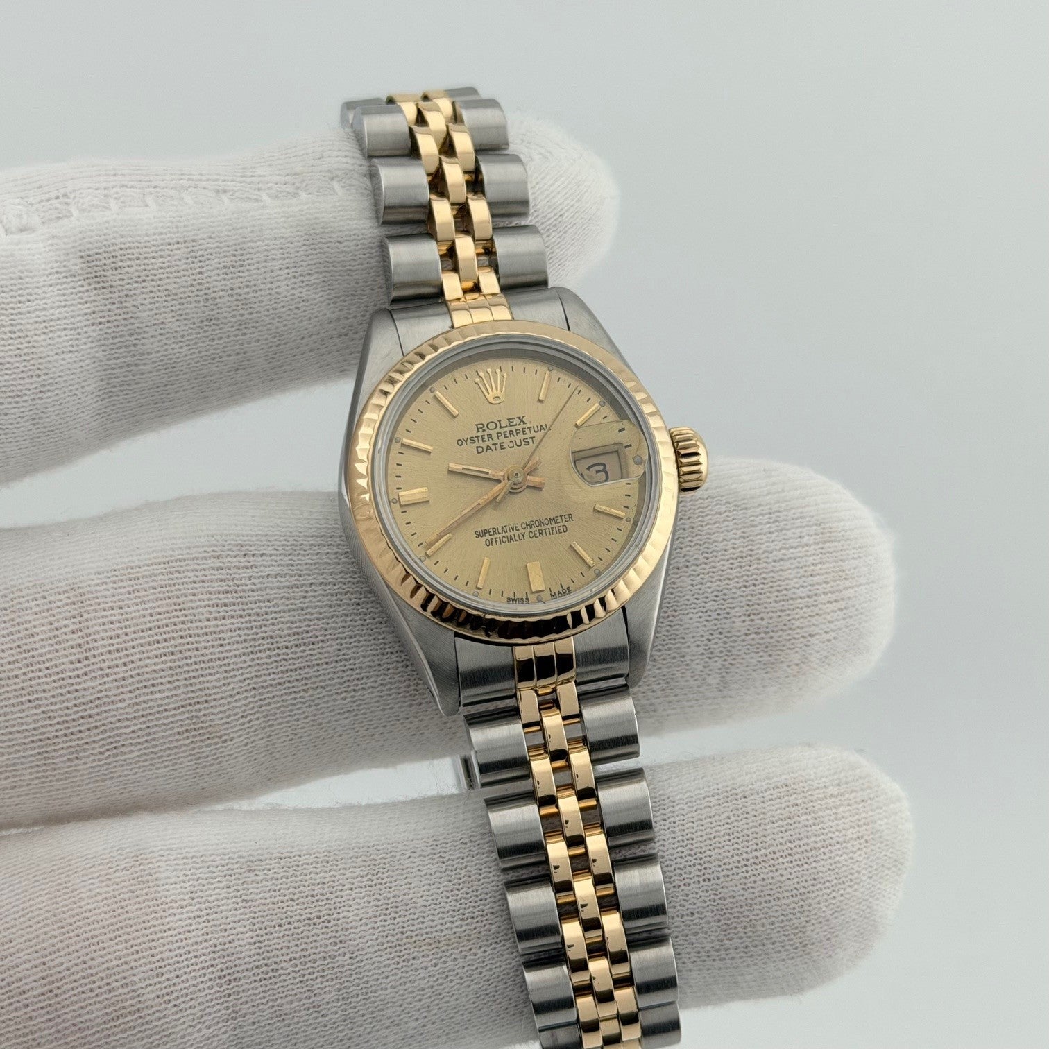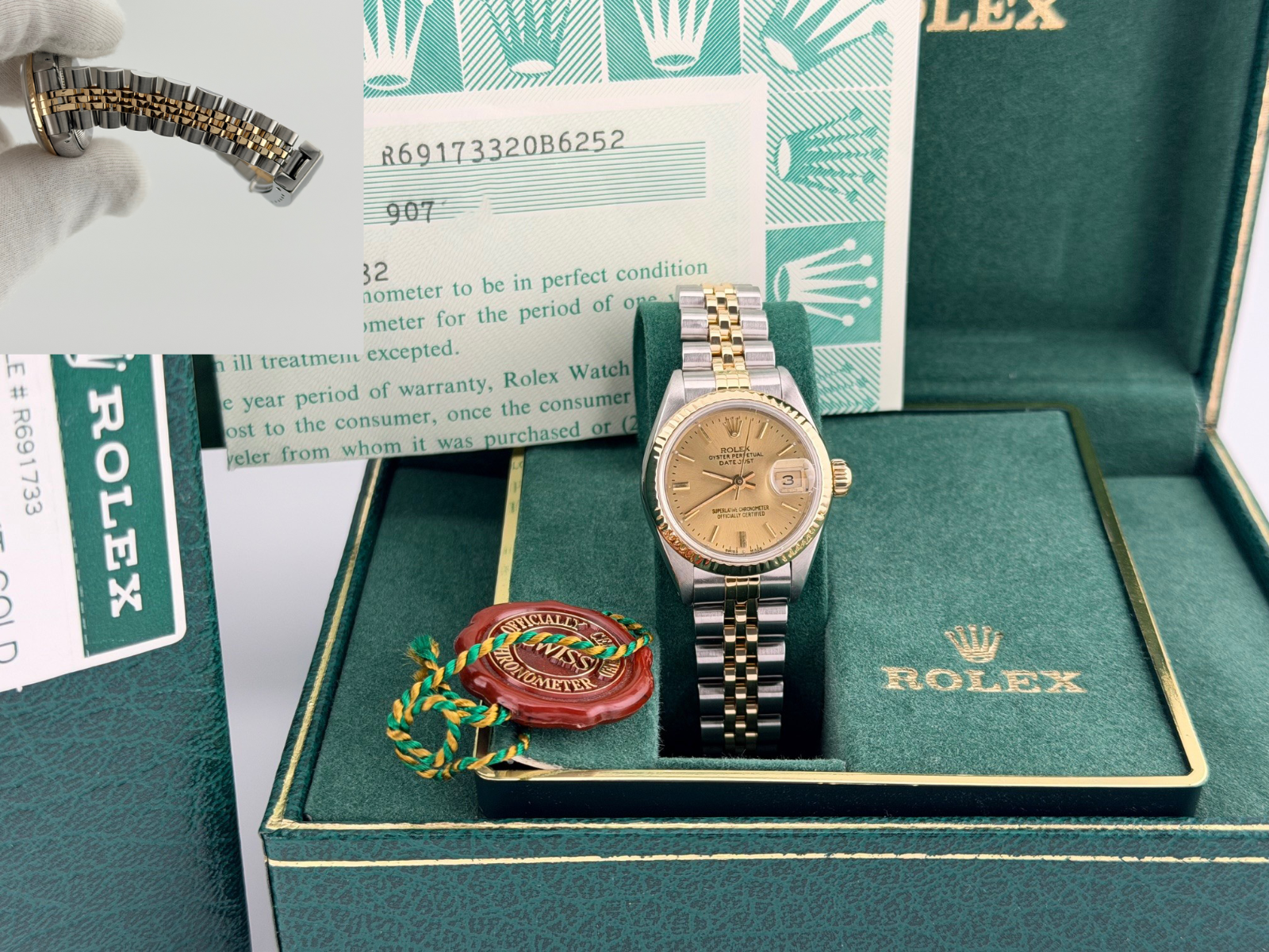 Rolex Ladies Datejust 69173 26mm Champagne Dial 18k Yellow Gold Steel Box Paper Rolex Sale! from 569500 /per This item is a recurring or deferred purchase. By continuing, I agree to the cancellation policy and authorize you to charge my payment method at the prices, frequency and dates listed on this page until my order is fulfilled or I cancel, if permitted. +1 (619) 232-1273 This item is currently on backorder but you can still purchase it now and we'll ship as soon as more become available. Style Number: 69173Serial: 907****Year: 1986 Model: Rolex Ladies Datejust Case Material: Stainless Steel Band: 18k Yellow Gold & Stainless Steel Jubilee Bezel: 18k Yellow Gold Fluted Dial: Champagne Dial Crystal: Sapphire Case Size: 26mm Includes: - Rolex Box & Paper- Certified Appraisal - 1 Year WarrantySKU 22840 / 16600TOFCSD