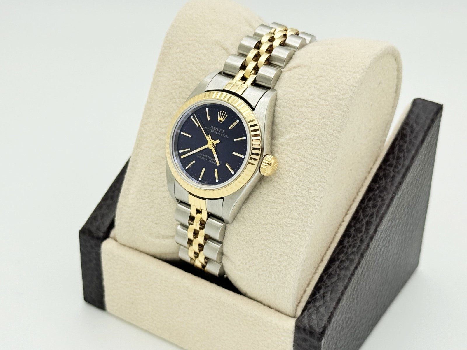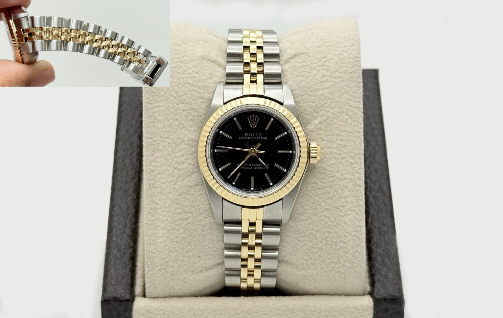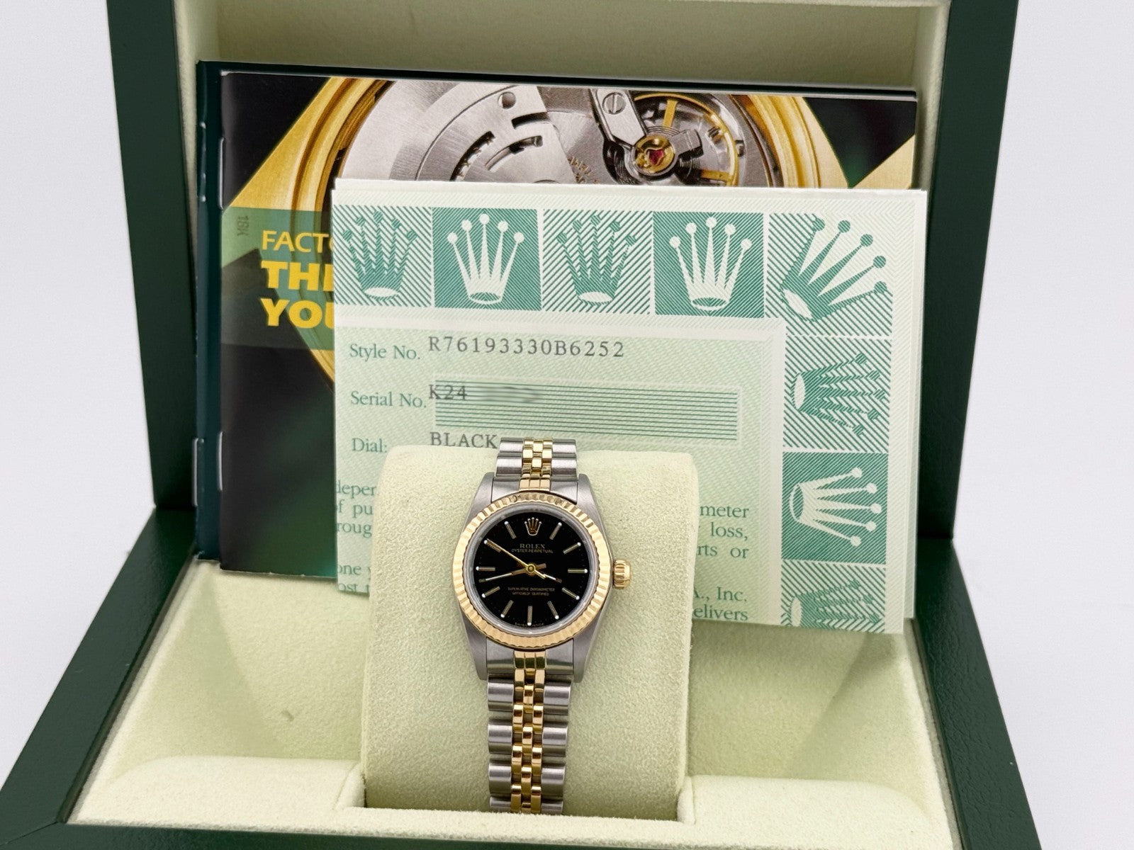 Rolex Ladies Oyster Perpetual 76193 Black Dial 18k Yellow Gold Steel Rolex Sale! from 599500 /per This item is a recurring or deferred purchase. By continuing, I agree to the cancellation policy and authorize you to charge my payment method at the prices, frequency and dates listed on this page until my order is fulfilled or I cancel, if permitted. +1 (619) 232-1273 This item is currently on backorder but you can still purchase it now and we'll ship as soon as more become available. Style Number: 76193Serial: K24****Year: 2001 Model: Rolex Ladies Oyster Perpetual Case Material: Stainless Steel Band: 18k Yellow Gold & Stainless Steel Jubilee Bezel: 18k Yellow Gold Fluted Dial: Black Dial Crystal: Sapphire Crystal Case Size: 26mm Includes: - Rolex Box & Papers- Certified Appraisal - 1 Year WarrantySKU 22786 / 15640TJD071125SF