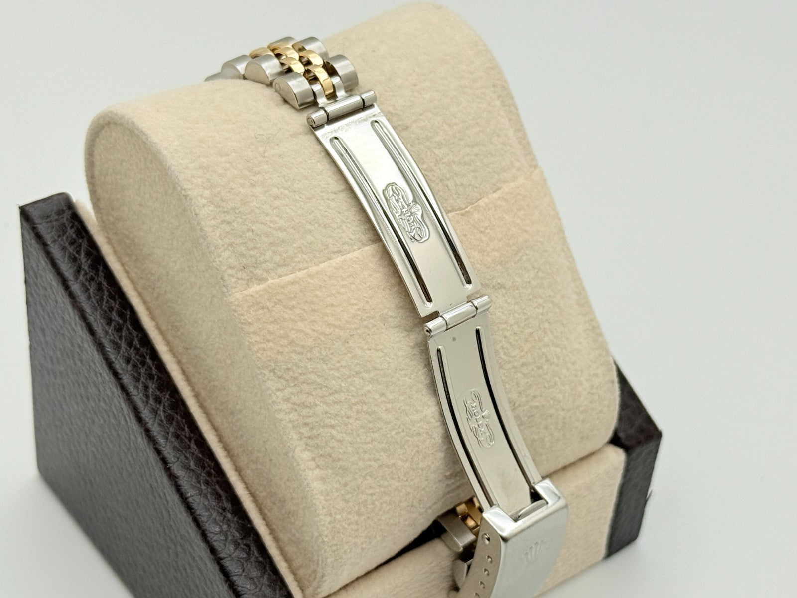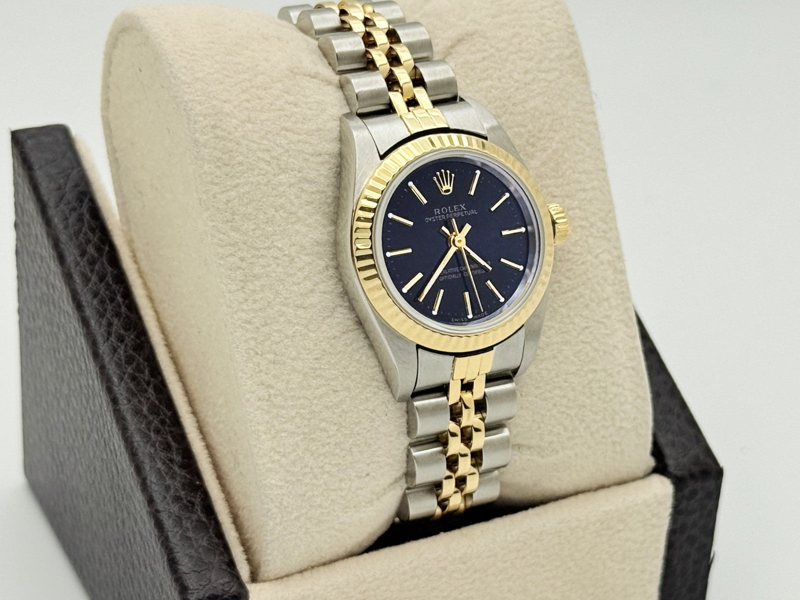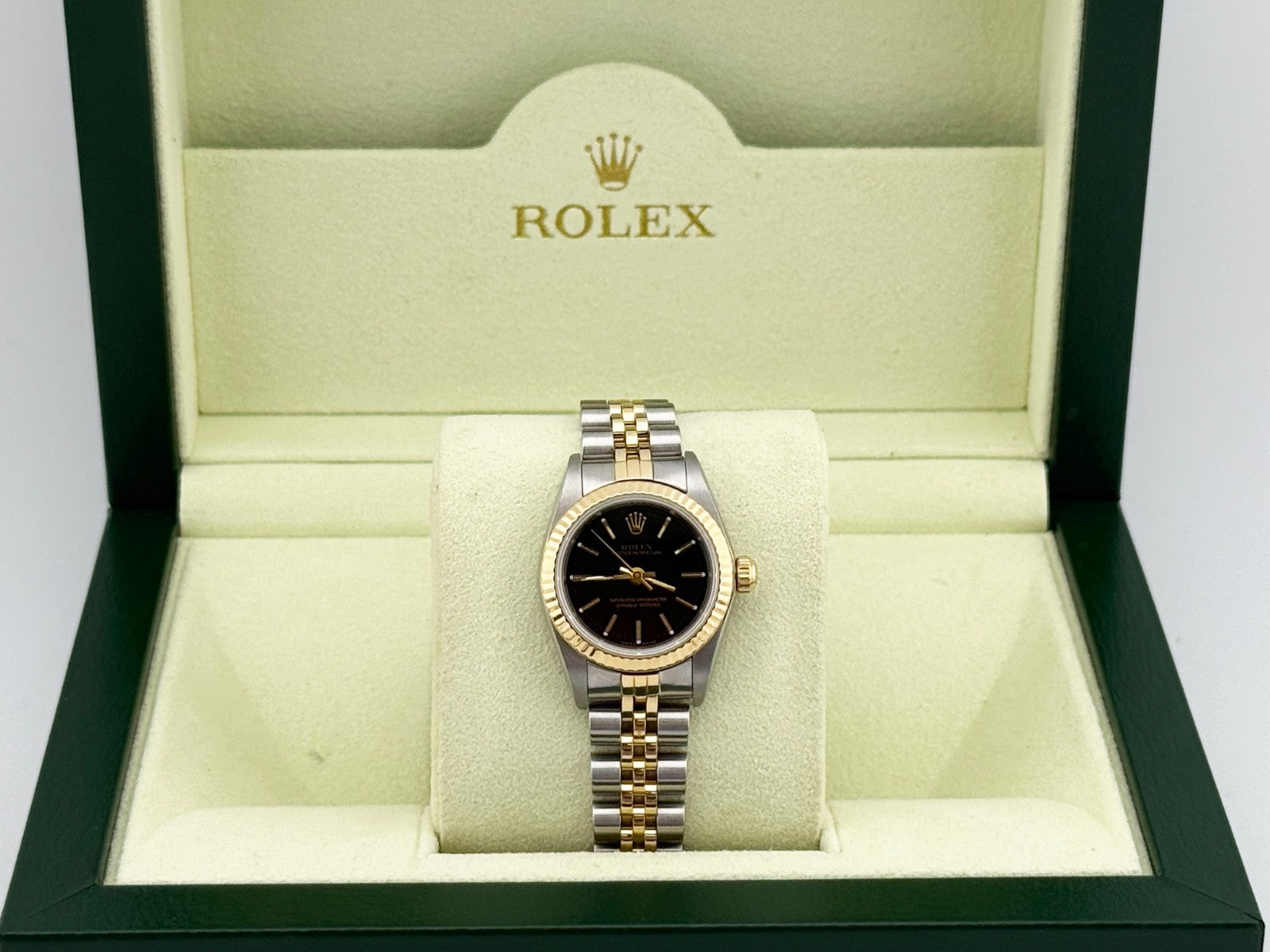 Rolex Ladies Oyster Perpetual 76193 Black Dial 18k Yellow Gold Steel Rolex Sale! from 599500 /per This item is a recurring or deferred purchase. By continuing, I agree to the cancellation policy and authorize you to charge my payment method at the prices, frequency and dates listed on this page until my order is fulfilled or I cancel, if permitted. +1 (619) 232-1273 This item is currently on backorder but you can still purchase it now and we'll ship as soon as more become available. Style Number: 76193Serial: K24****Year: 2001 Model: Rolex Ladies Oyster Perpetual Case Material: Stainless Steel Band: 18k Yellow Gold & Stainless Steel Jubilee Bezel: 18k Yellow Gold Fluted Dial: Black Dial Crystal: Sapphire Crystal Case Size: 26mm Includes: - Rolex Box & Papers- Certified Appraisal - 1 Year WarrantySKU 22786 / 15640TJD071125SF