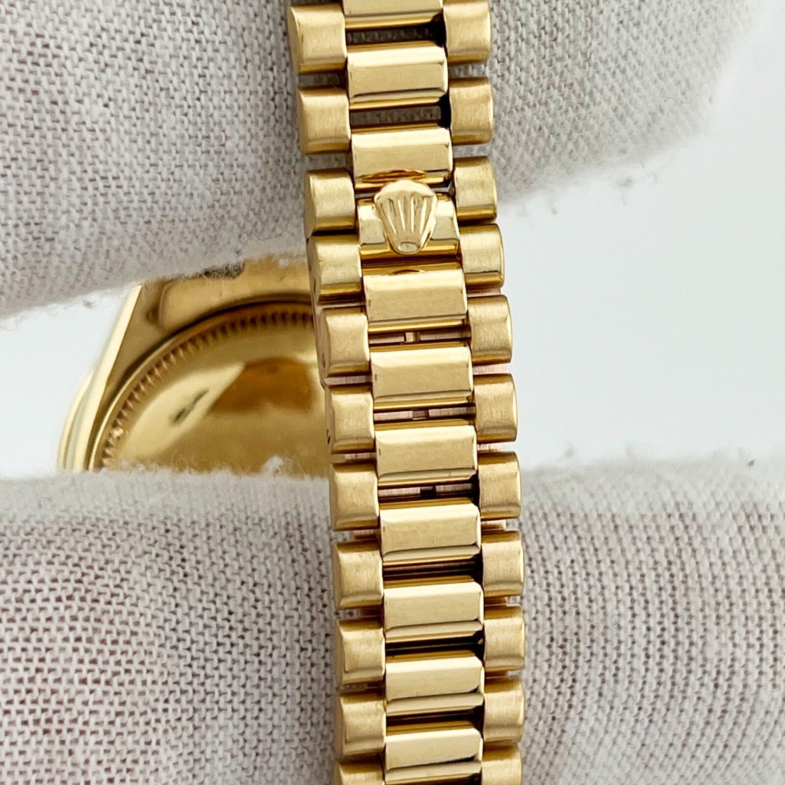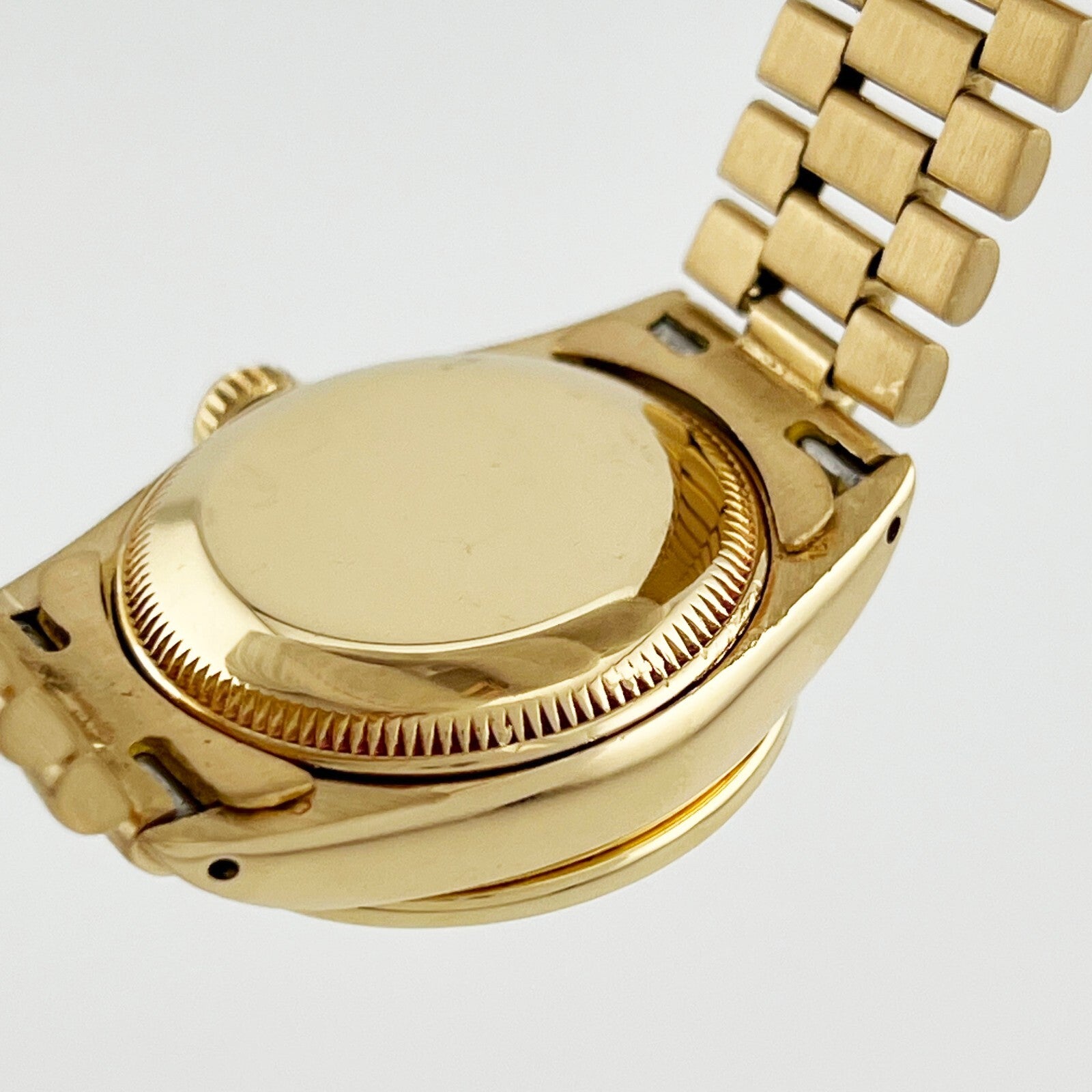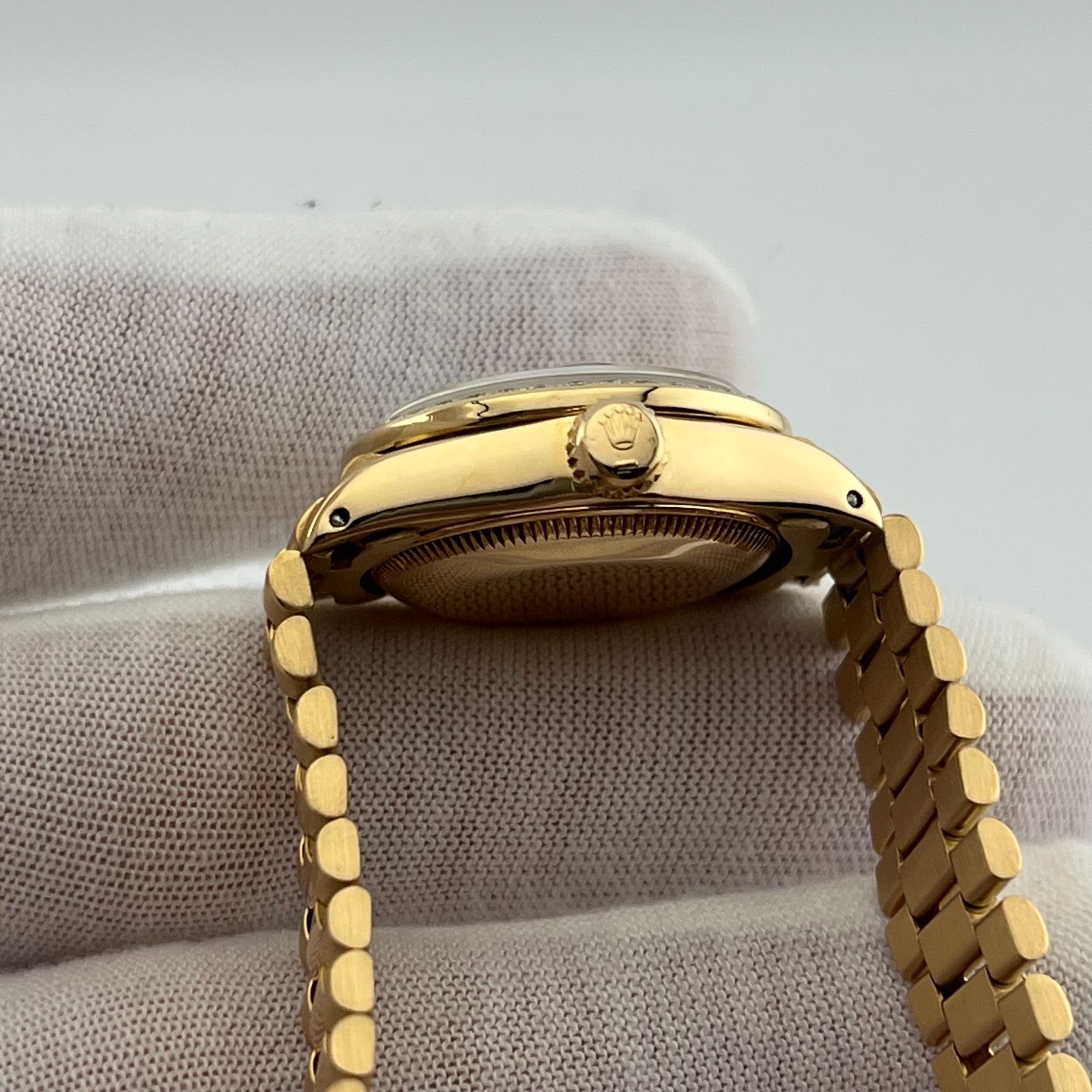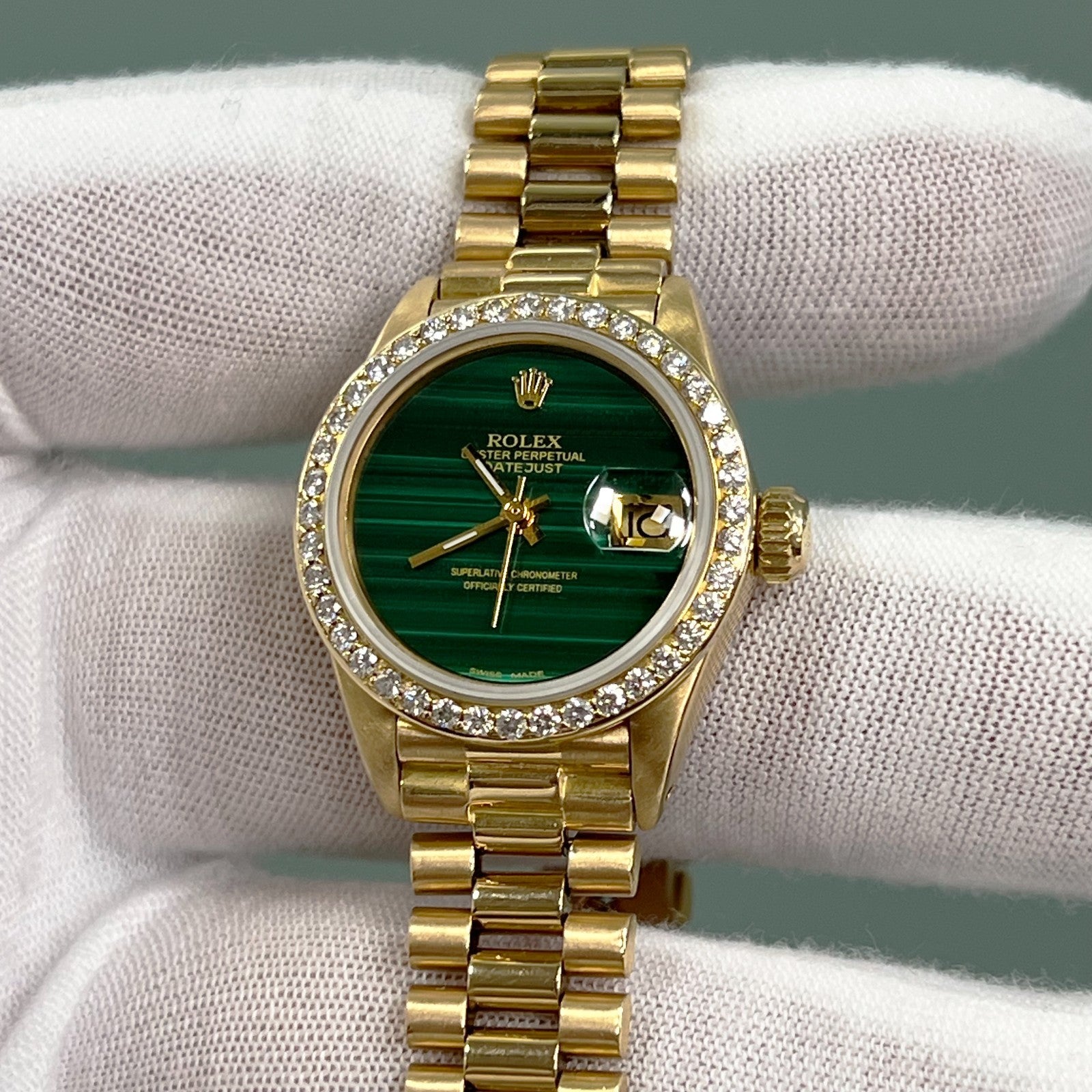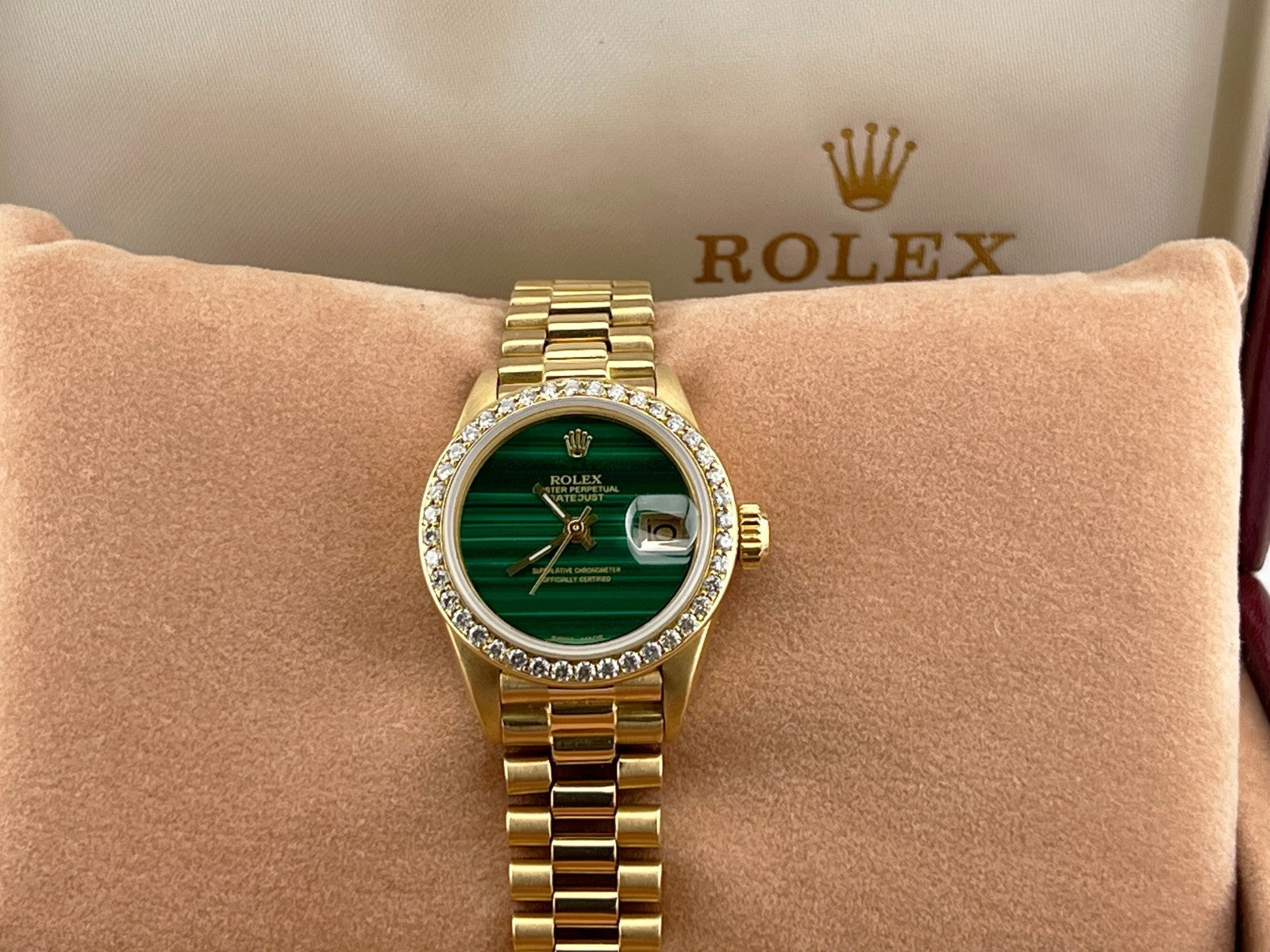 Rolex Ladies President 6917 Malachite Dial Diamond Bezel 18K Yellow Gold Rolex Sale! from 939500 /per This item is a recurring or deferred purchase. By continuing, I agree to the cancellation policy and authorize you to charge my payment method at the prices, frequency and dates listed on this page until my order is fulfilled or I cancel, if permitted. +1 (619) 232-1273 This item is currently on backorder but you can still purchase it now and we'll ship as soon as more become available. Style Number: 6917Serial: 7567***Year: 1983 Model: Rolex Ladies President Case Material: 18K Yellow Gold Band: 18K Yellow Gold Bezel: Custom Diamond Bezel Dial: Green Malachite Dial Face: Sapphire Crystal Case Size: 26mm Includes: -Elegant Watch Box-Certified Appraisal -1 Year WarrantySKU 21645 / 111910TJD091124