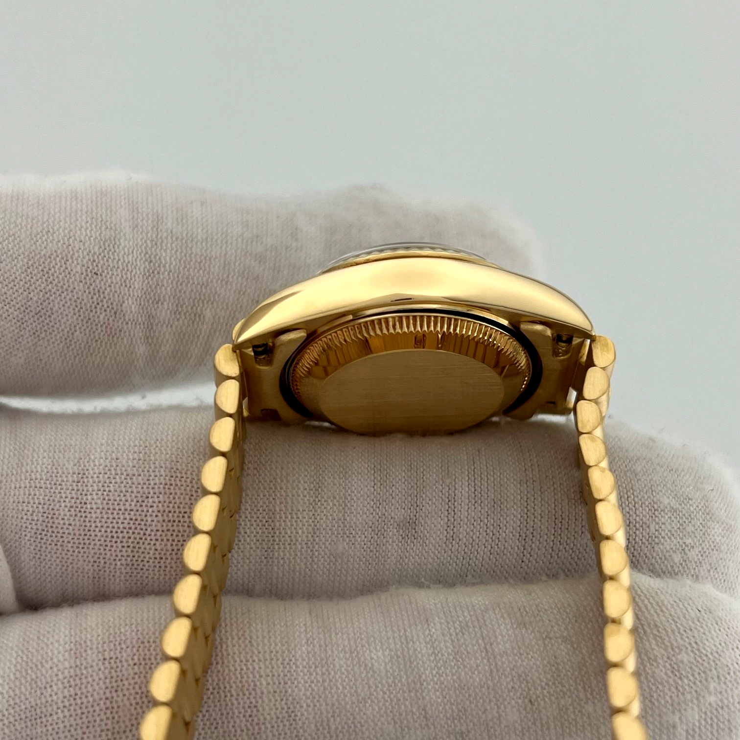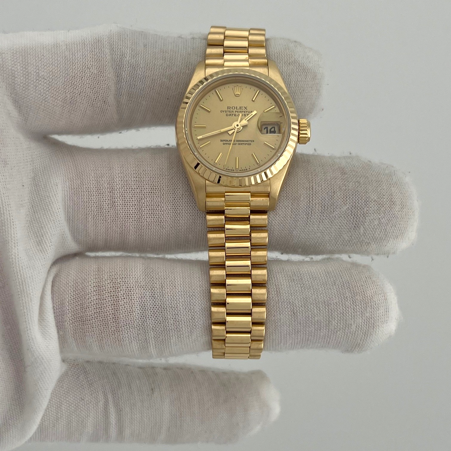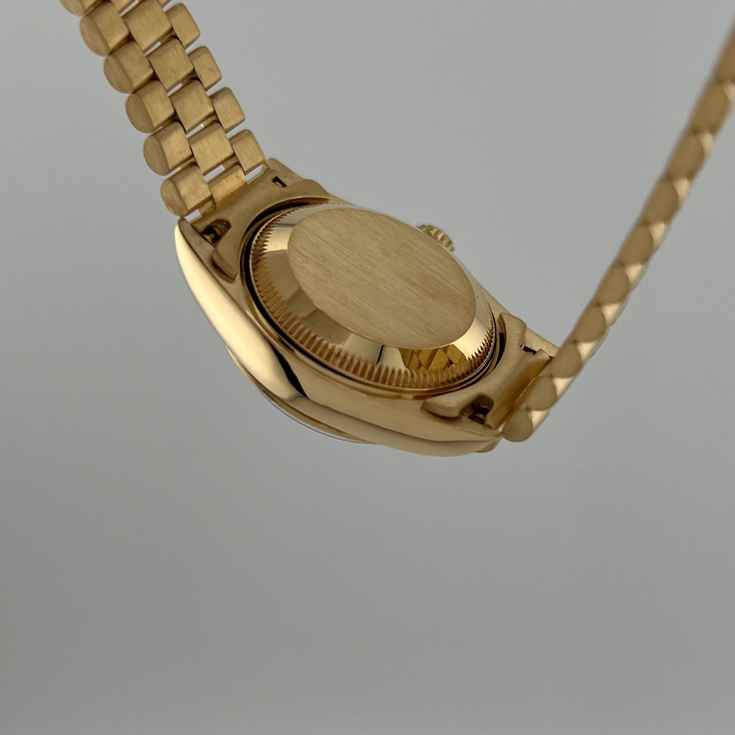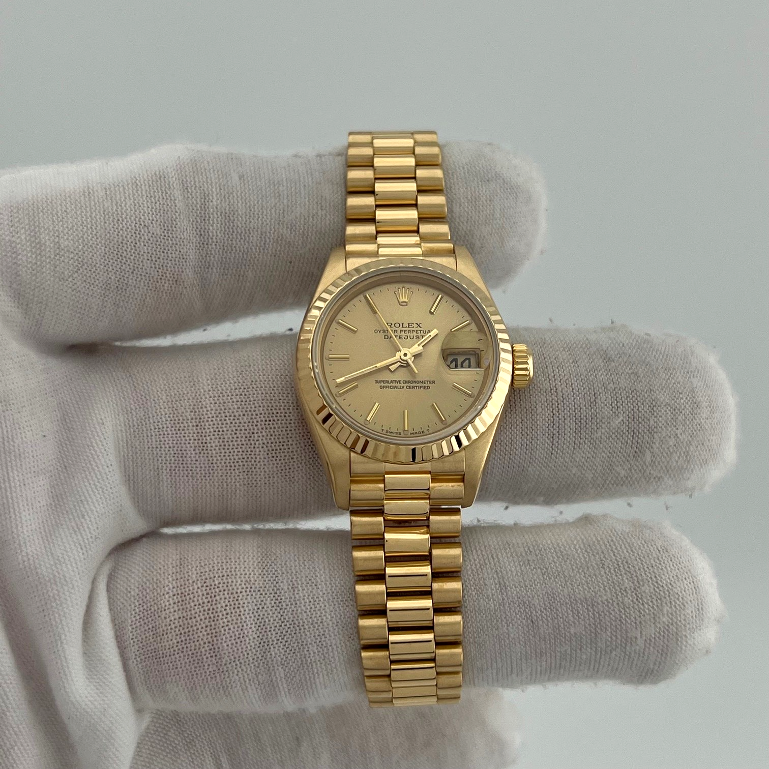 Rolex Ladies President Datejust 69178 26mm Champagne Dial 18k Gold Box Paper Rolex Sale! from 1149500 /per This item is a recurring or deferred purchase. By continuing, I agree to the cancellation policy and authorize you to charge my payment method at the prices, frequency and dates listed on this page until my order is fulfilled or I cancel, if permitted. +1 (619) 232-1273 This item is currently on backorder but you can still purchase it now and we'll ship as soon as more become available. Style Number: 69178Serial: S84****Year: 1993 Model: Rolex Ladies President Datejust Case Material: 18k Yellow Gold Band: 18k Yellow Gold President Bezel: 18k Yellow Gold Fluted Dial: Champagne Dial Crystal: Sapphire Case Size: 26mm Includes: - Rolex Box & Paper- Certified Appraisal - 1 Year WarrantySKU 23142 / 125545TOC100225