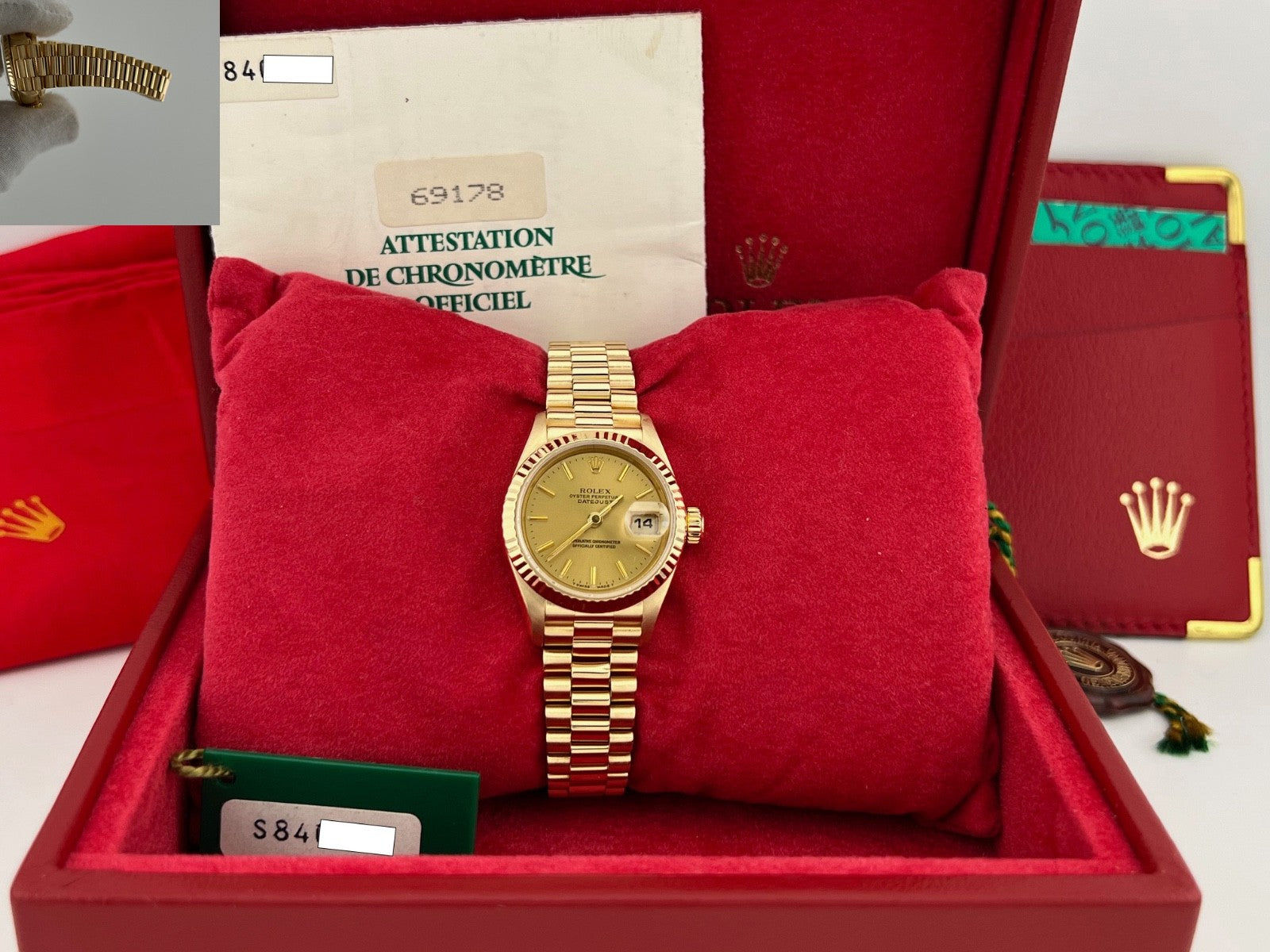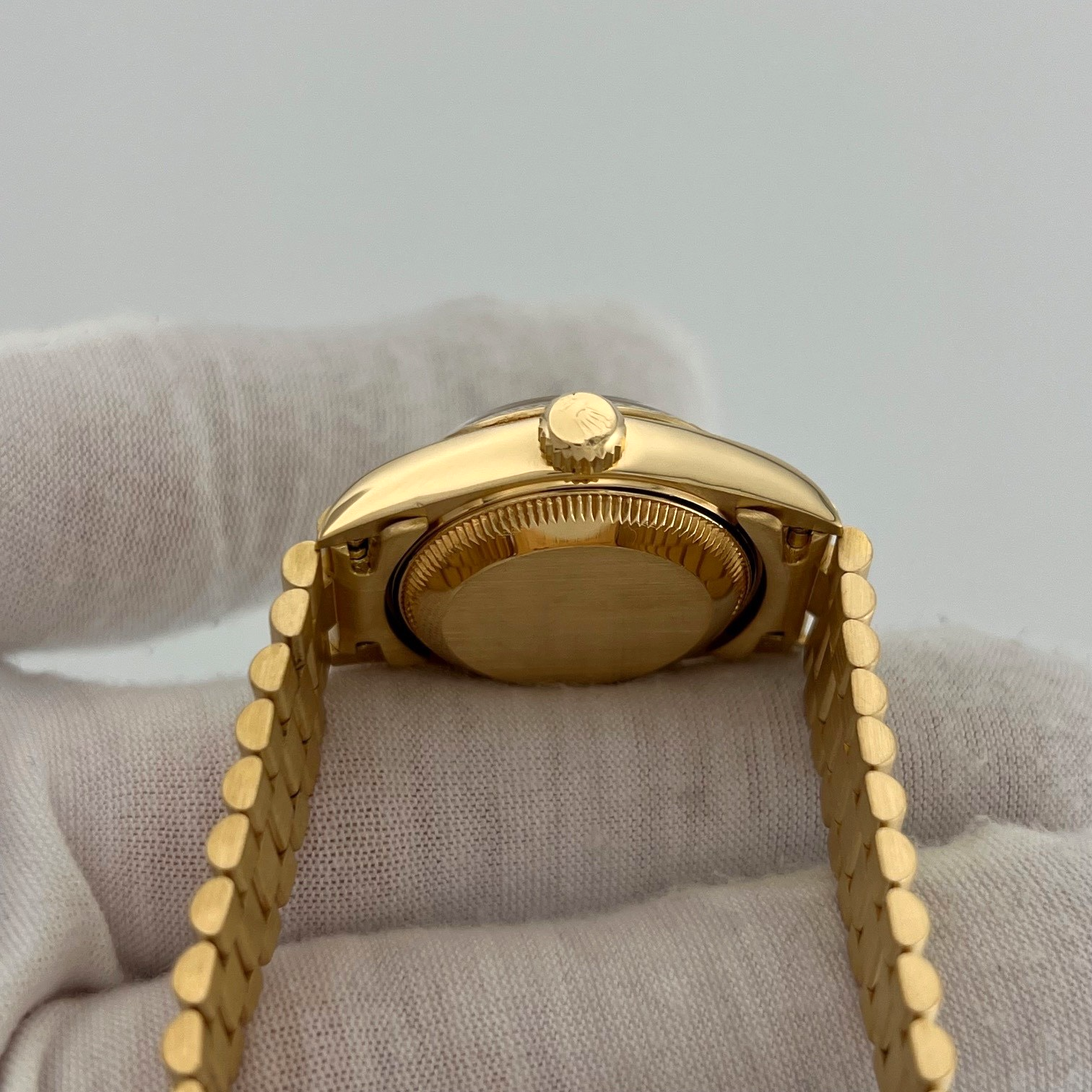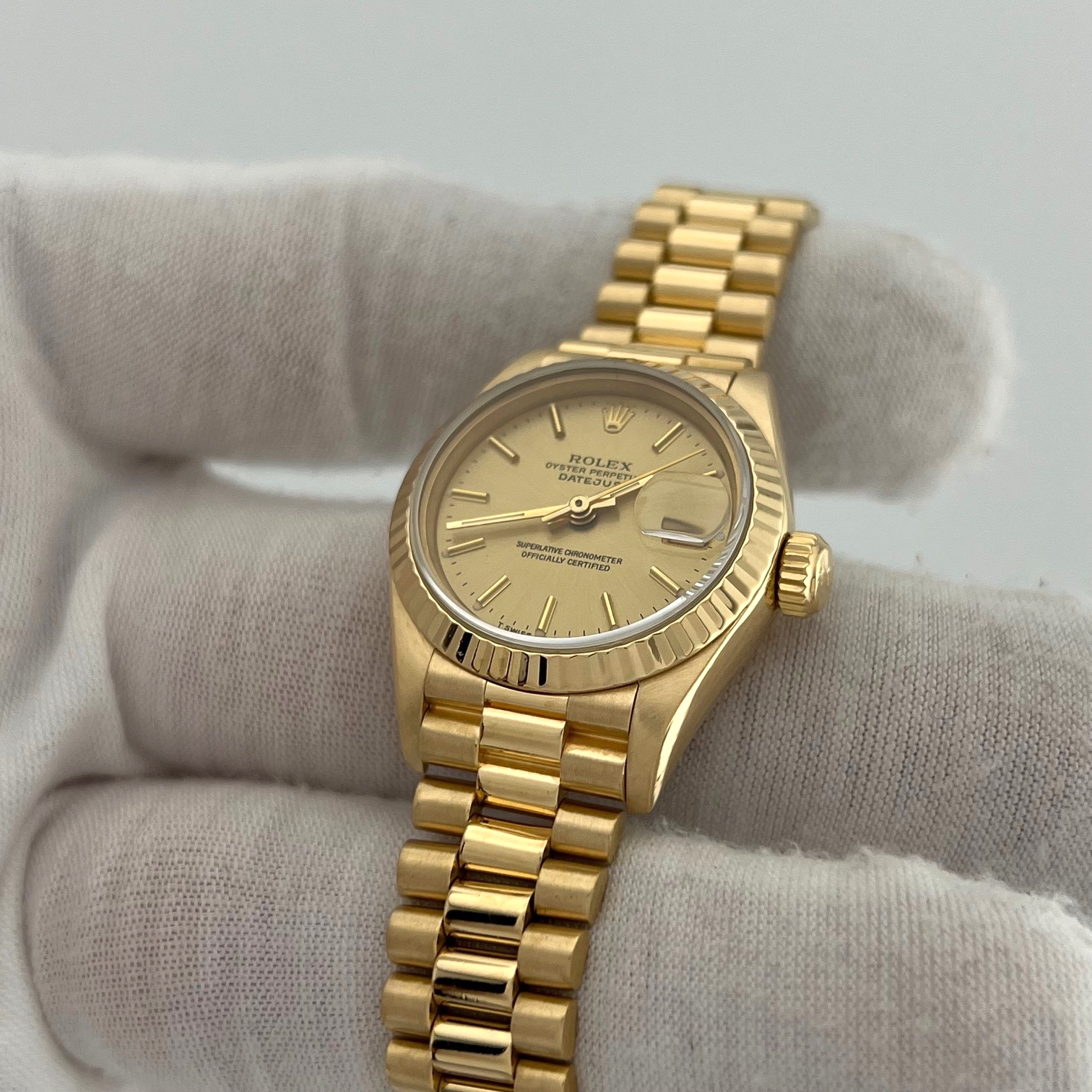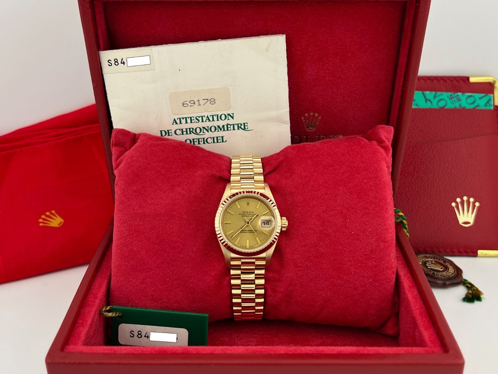 Rolex Ladies President Datejust 69178 26mm Champagne Dial 18k Gold Box Paper Rolex Sale! from 1149500 /per This item is a recurring or deferred purchase. By continuing, I agree to the cancellation policy and authorize you to charge my payment method at the prices, frequency and dates listed on this page until my order is fulfilled or I cancel, if permitted. +1 (619) 232-1273 This item is currently on backorder but you can still purchase it now and we'll ship as soon as more become available. Style Number: 69178Serial: S84****Year: 1993 Model: Rolex Ladies President Datejust Case Material: 18k Yellow Gold Band: 18k Yellow Gold President Bezel: 18k Yellow Gold Fluted Dial: Champagne Dial Crystal: Sapphire Case Size: 26mm Includes: - Rolex Box & Paper- Certified Appraisal - 1 Year WarrantySKU 23142 / 125545TOC100225