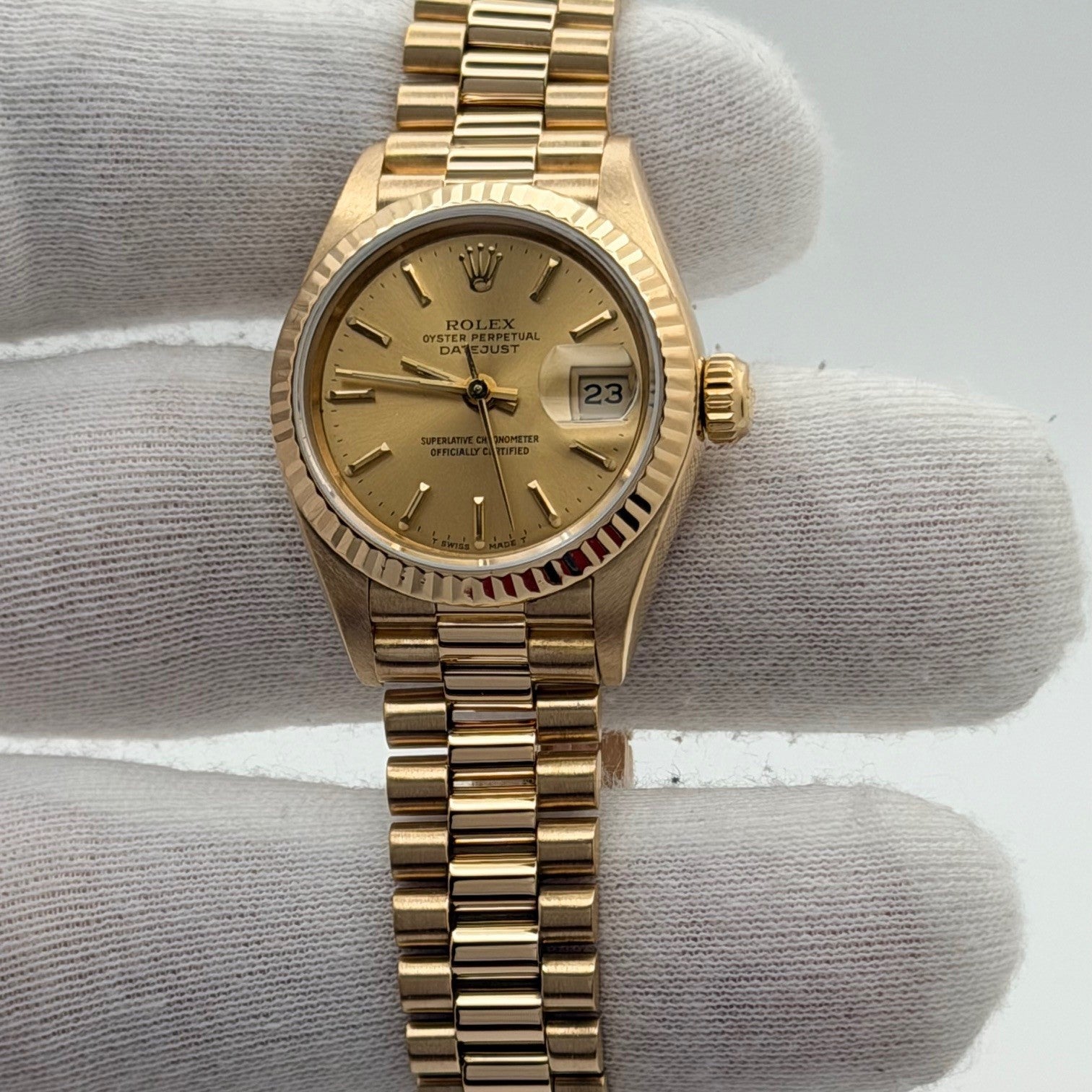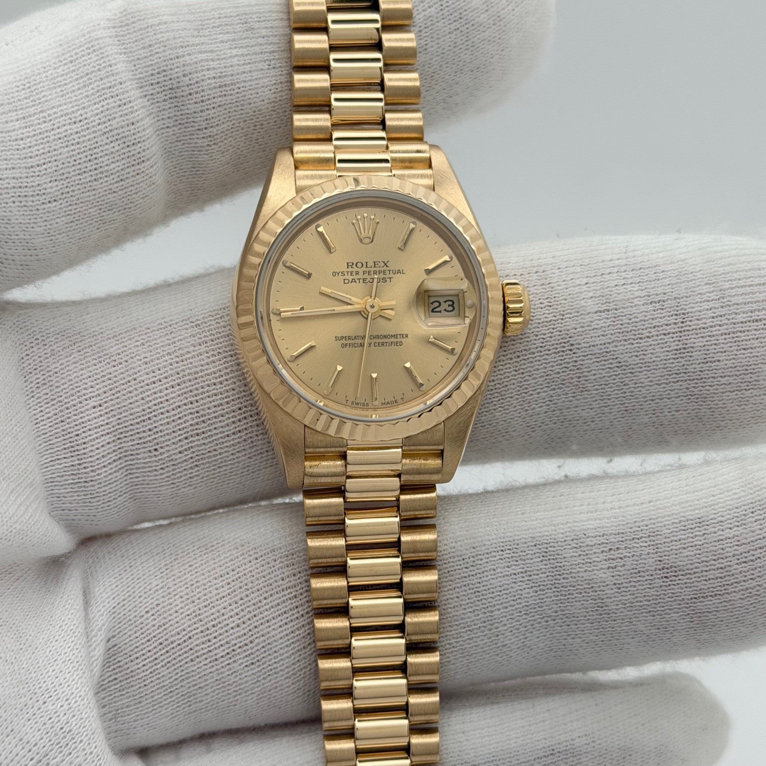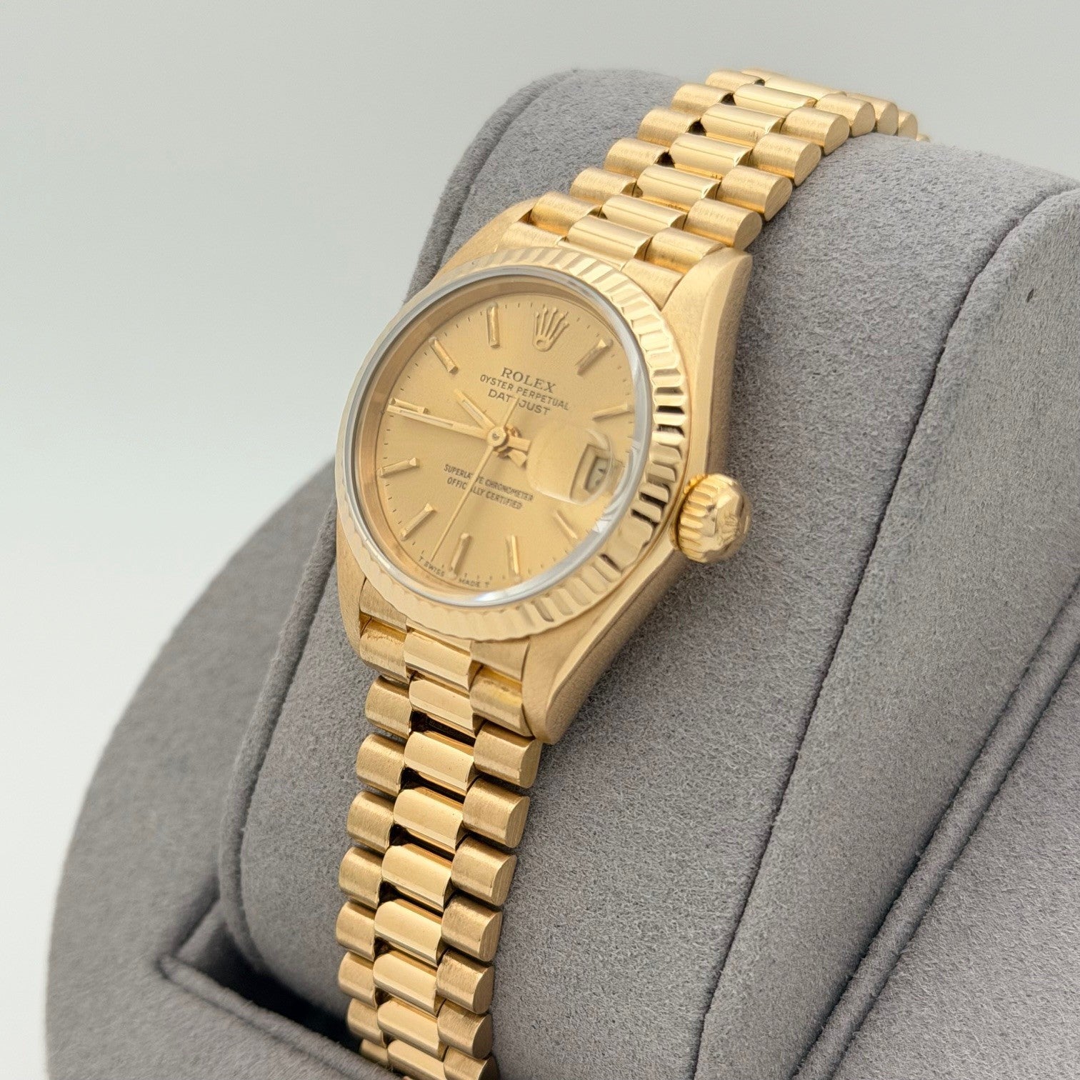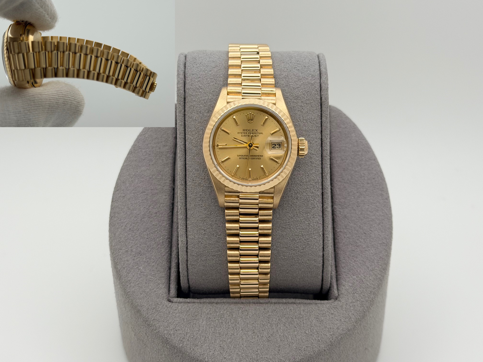 Rolex Ladies President Datejust 69178 26mm Champagne Dial 18k Yellow Gold Rolex Sale! from 999500 /per This item is a recurring or deferred purchase. By continuing, I agree to the cancellation policy and authorize you to charge my payment method at the prices, frequency and dates listed on this page until my order is fulfilled or I cancel, if permitted. +1 (619) 232-1273 This item is currently on backorder but you can still purchase it now and we'll ship as soon as more become available. Style Number: 69178Serial: 954****Year: 1987 Model: Rolex Ladies President Datejust Case Material: 18k Yellow Gold Band: 18k Yellow Gold President Bezel: 18k Yellow Gold Fluted Dial: Champagne Dial Crystal: Sapphire Case Size: 26mm Includes: - Elegant Watch Box- Certified Appraisal - 1 Year WarrantySKU 23306 / 121285T103025