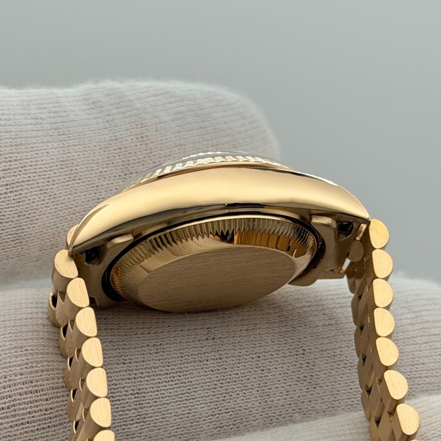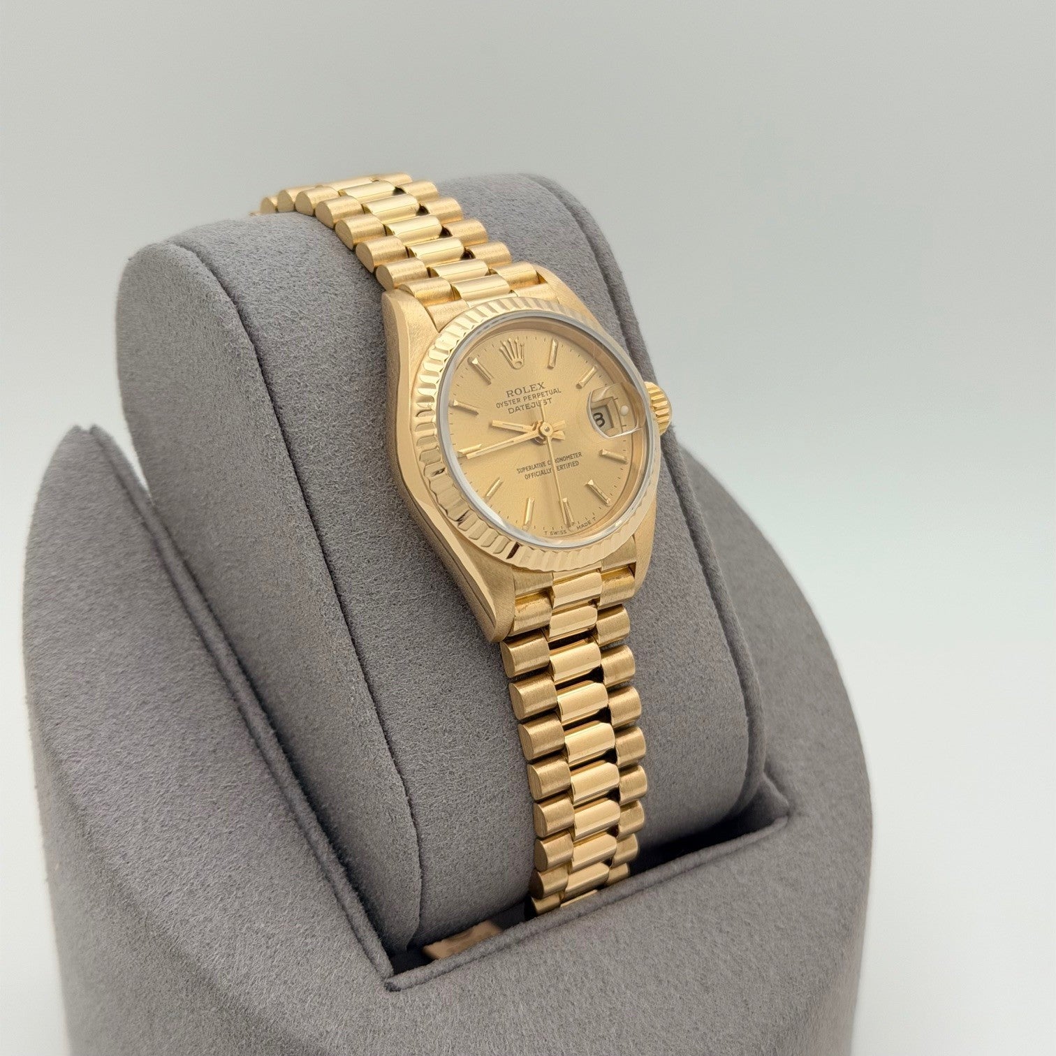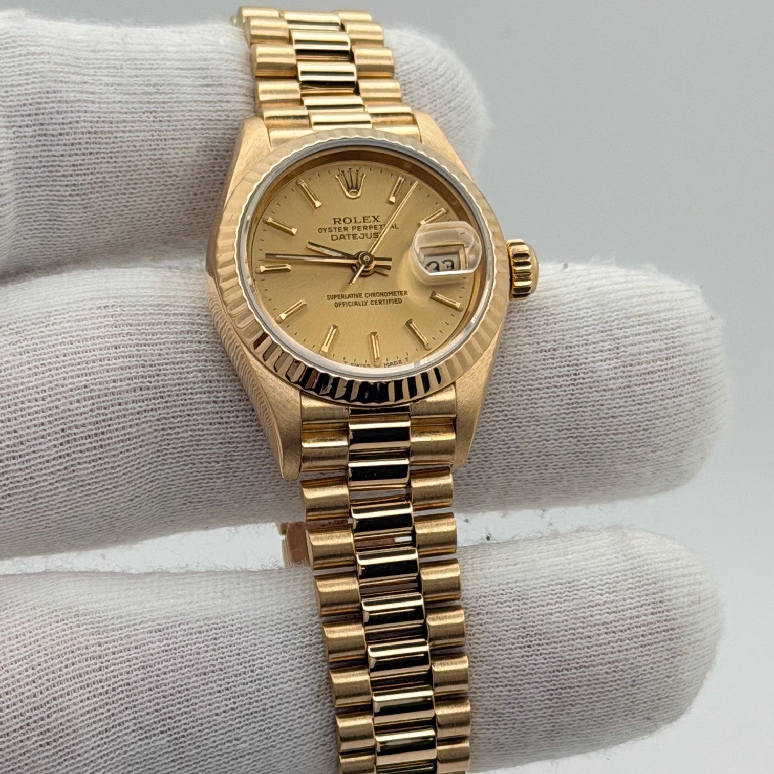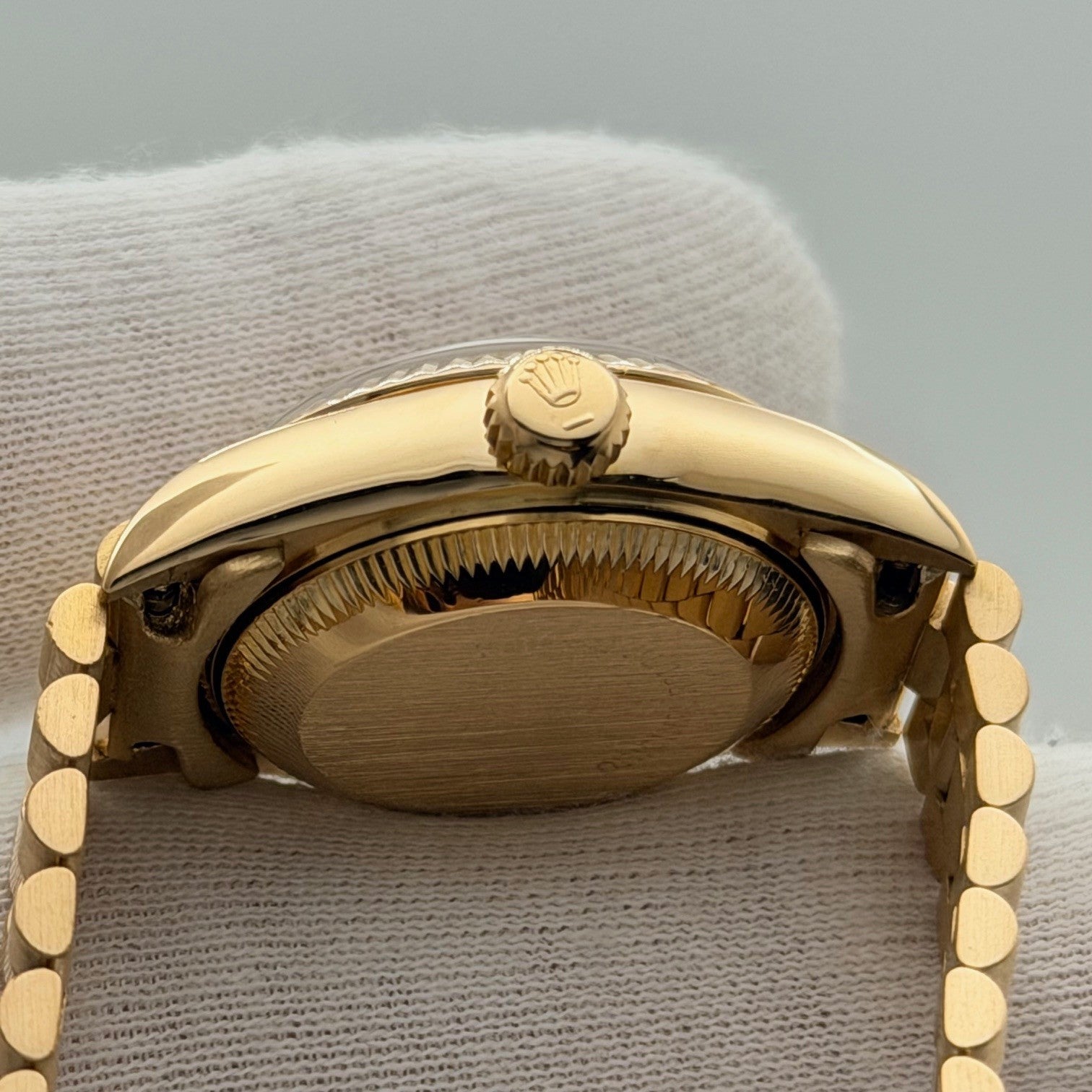 Rolex Ladies President Datejust 69178 26mm Champagne Dial 18k Yellow Gold Rolex Sale! from 999500 /per This item is a recurring or deferred purchase. By continuing, I agree to the cancellation policy and authorize you to charge my payment method at the prices, frequency and dates listed on this page until my order is fulfilled or I cancel, if permitted. +1 (619) 232-1273 This item is currently on backorder but you can still purchase it now and we'll ship as soon as more become available. Style Number: 69178Serial: 954****Year: 1987 Model: Rolex Ladies President Datejust Case Material: 18k Yellow Gold Band: 18k Yellow Gold President Bezel: 18k Yellow Gold Fluted Dial: Champagne Dial Crystal: Sapphire Case Size: 26mm Includes: - Elegant Watch Box- Certified Appraisal - 1 Year WarrantySKU 23306 / 121285T103025