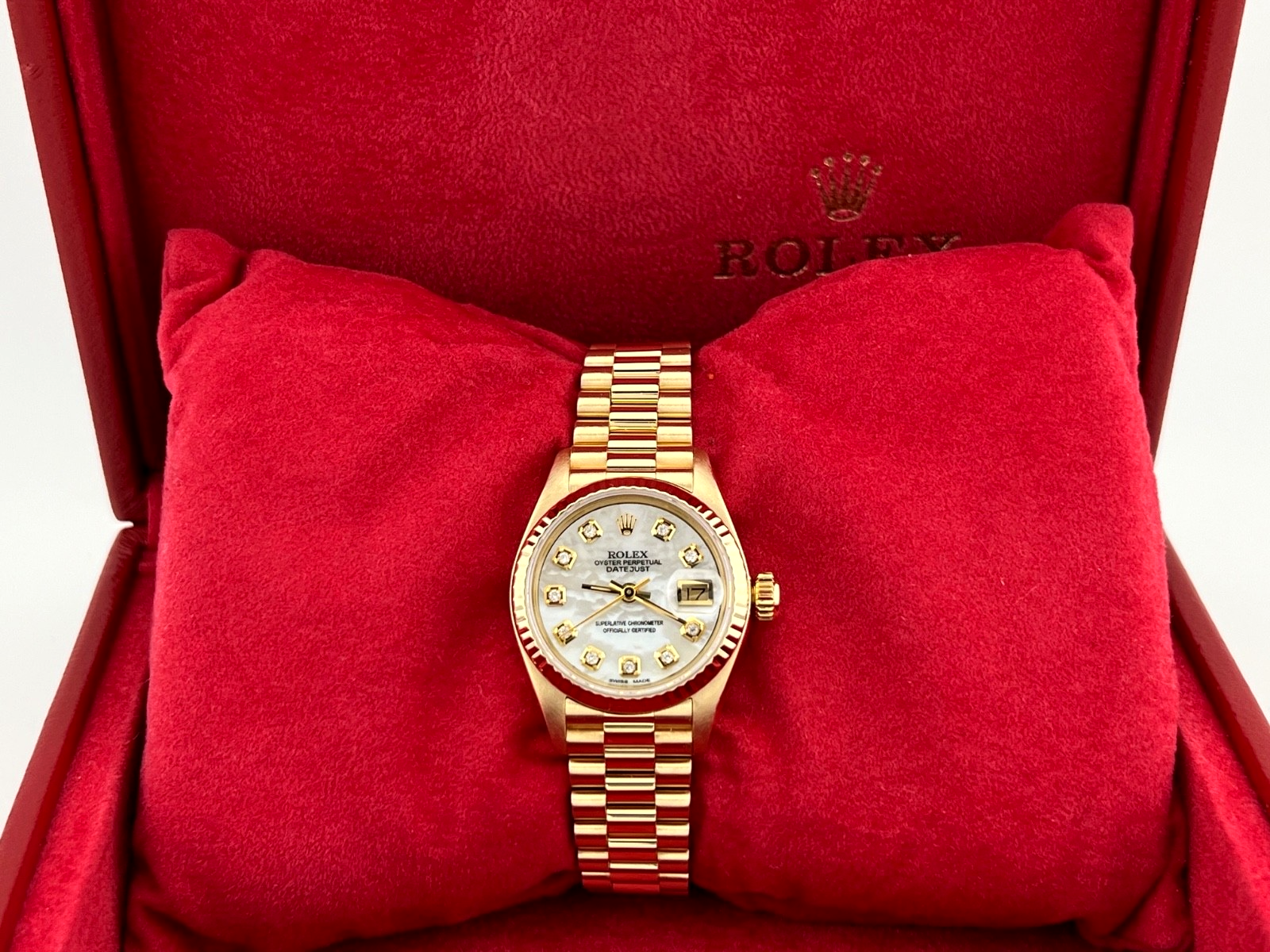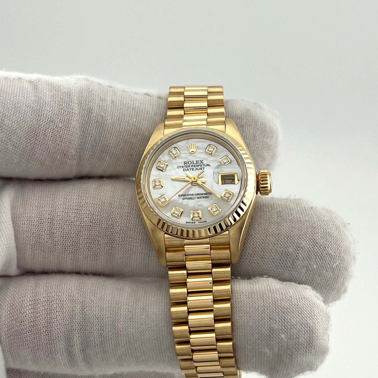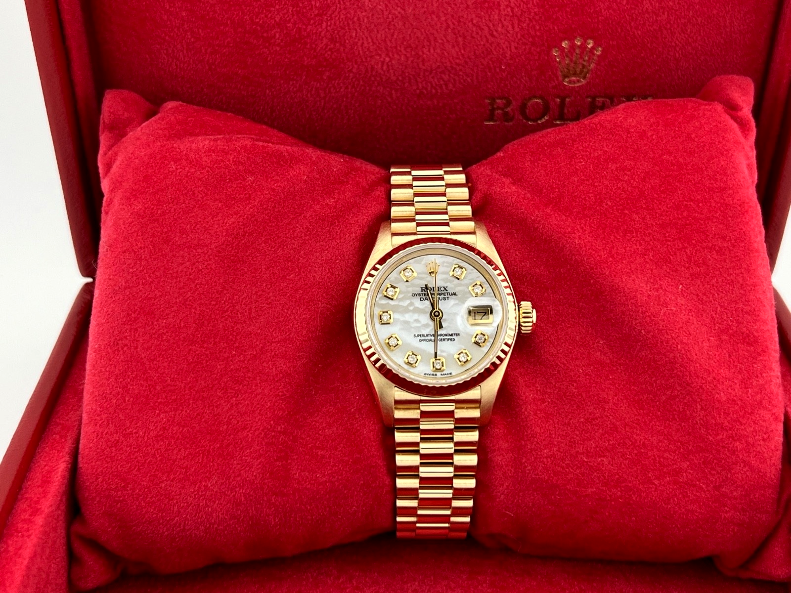 Rolex Ladies President Datejust 69178 26mm Mother Of Pearl Diamond Dial 18k Gold Rolex Sale! from 999500 /per This item is a recurring or deferred purchase. By continuing, I agree to the cancellation policy and authorize you to charge my payment method at the prices, frequency and dates listed on this page until my order is fulfilled or I cancel, if permitted. +1 (619) 232-1273 This item is currently on backorder but you can still purchase it now and we'll ship as soon as more become available. Style Number: 69178Serial: N13****Year: 1993 Model: Rolex Ladies President Datejust Case Material: 18k Yellow Gold Band: 18k Yellow Gold President Bezel: 18k Yellow Gold Fluted Dial: Custom Mother Of Pearl Diamond Dial Crystal: Sapphire Case Size: 26mm Includes: - Elegant Watch Box- Certified Appraisal - 1 Year WarrantySKU 23083 / 123400TSTADEN092725