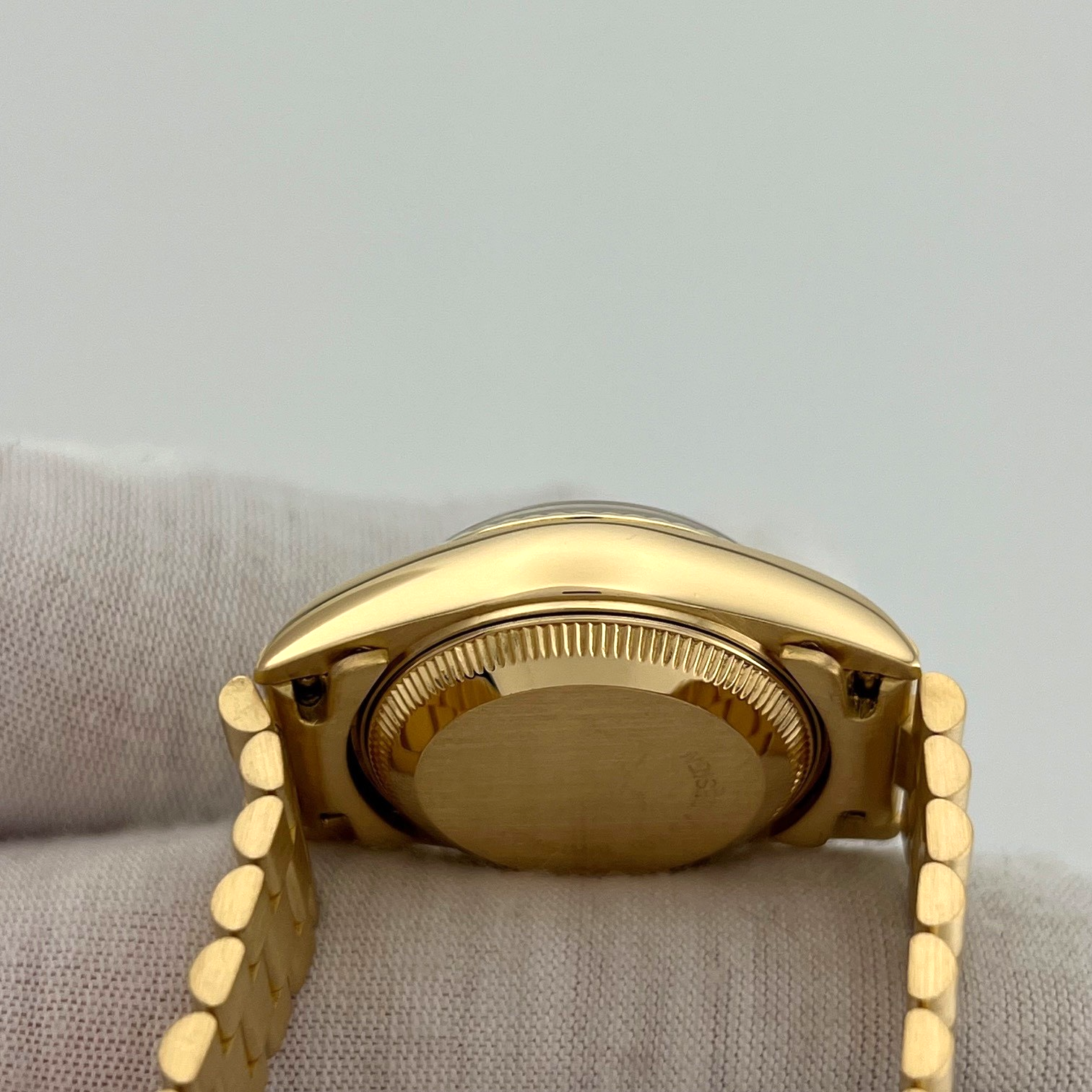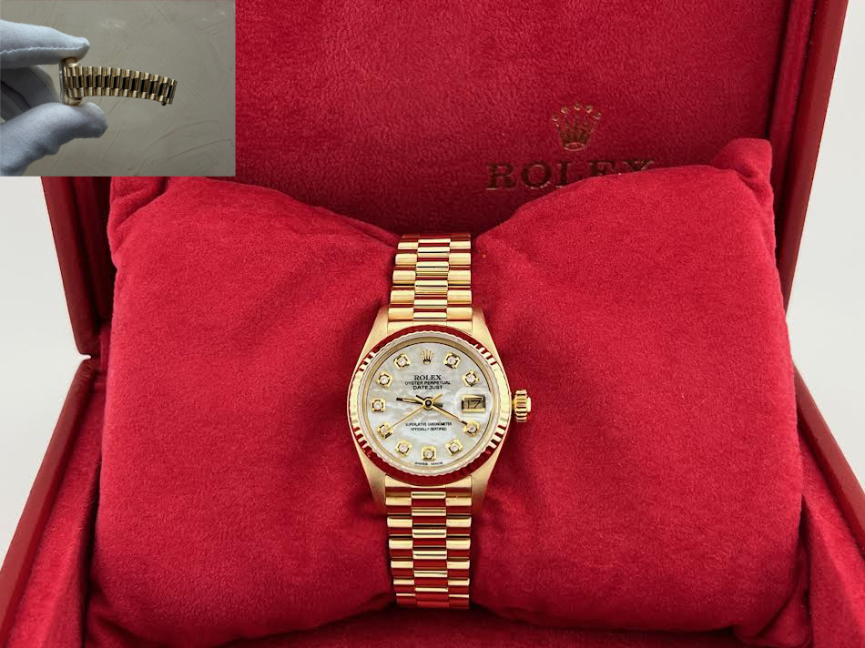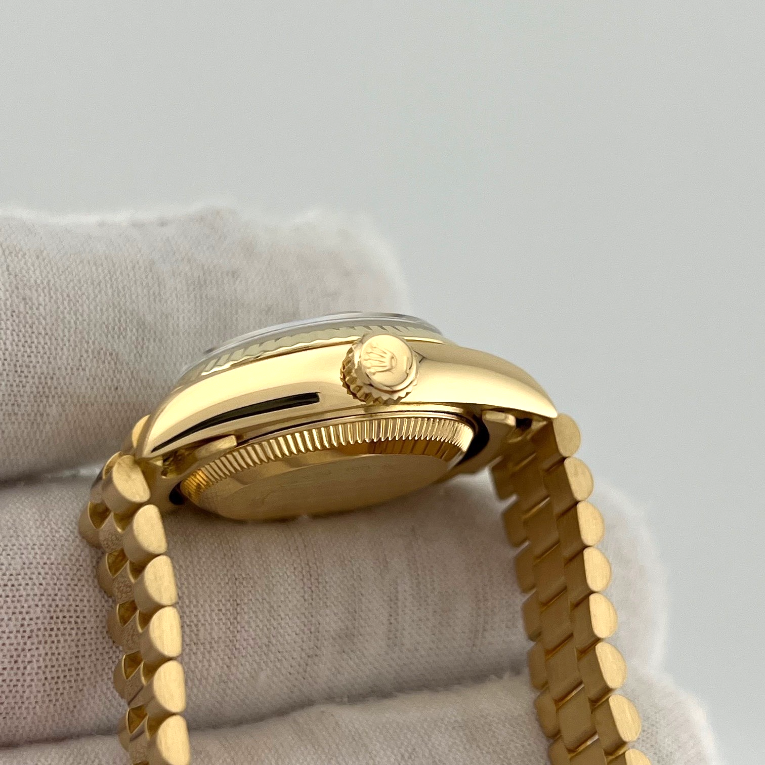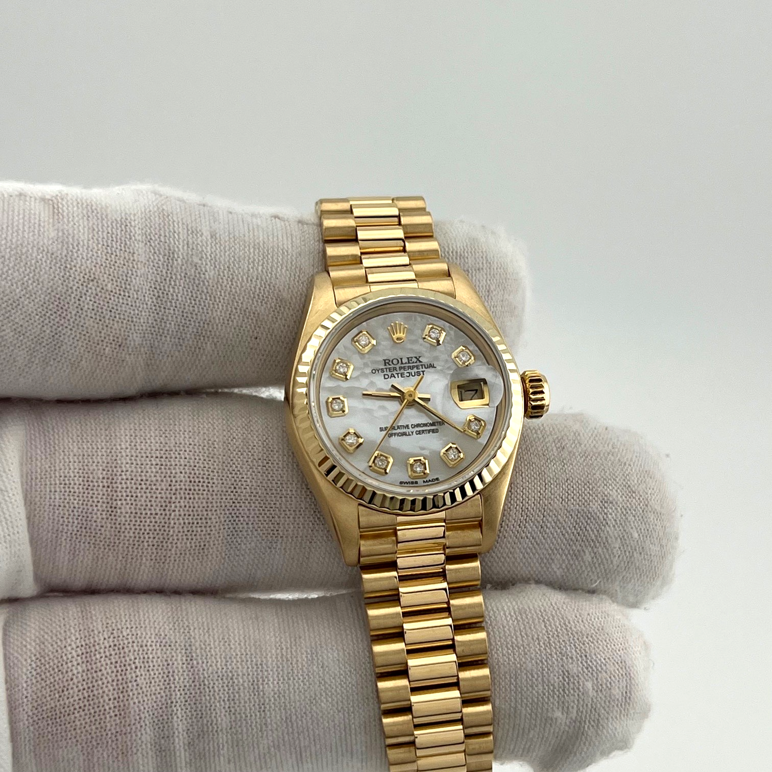 Rolex Ladies President Datejust 69178 26mm Mother Of Pearl Diamond Dial 18k Gold Rolex Sale! from 999500 /per This item is a recurring or deferred purchase. By continuing, I agree to the cancellation policy and authorize you to charge my payment method at the prices, frequency and dates listed on this page until my order is fulfilled or I cancel, if permitted. +1 (619) 232-1273 This item is currently on backorder but you can still purchase it now and we'll ship as soon as more become available. Style Number: 69178Serial: N13****Year: 1993 Model: Rolex Ladies President Datejust Case Material: 18k Yellow Gold Band: 18k Yellow Gold President Bezel: 18k Yellow Gold Fluted Dial: Custom Mother Of Pearl Diamond Dial Crystal: Sapphire Case Size: 26mm Includes: - Elegant Watch Box- Certified Appraisal - 1 Year WarrantySKU 23083 / 123400TSTADEN092725