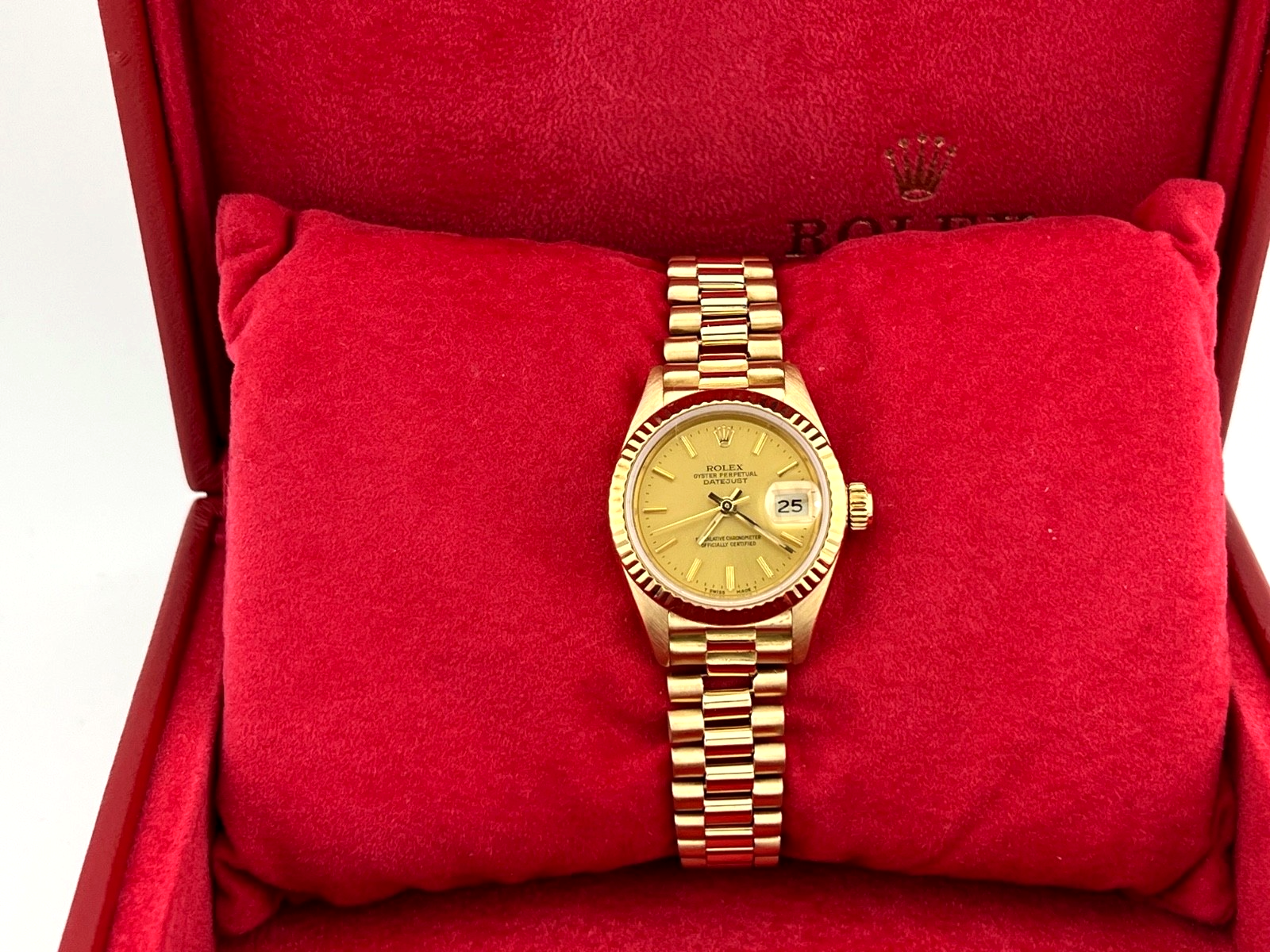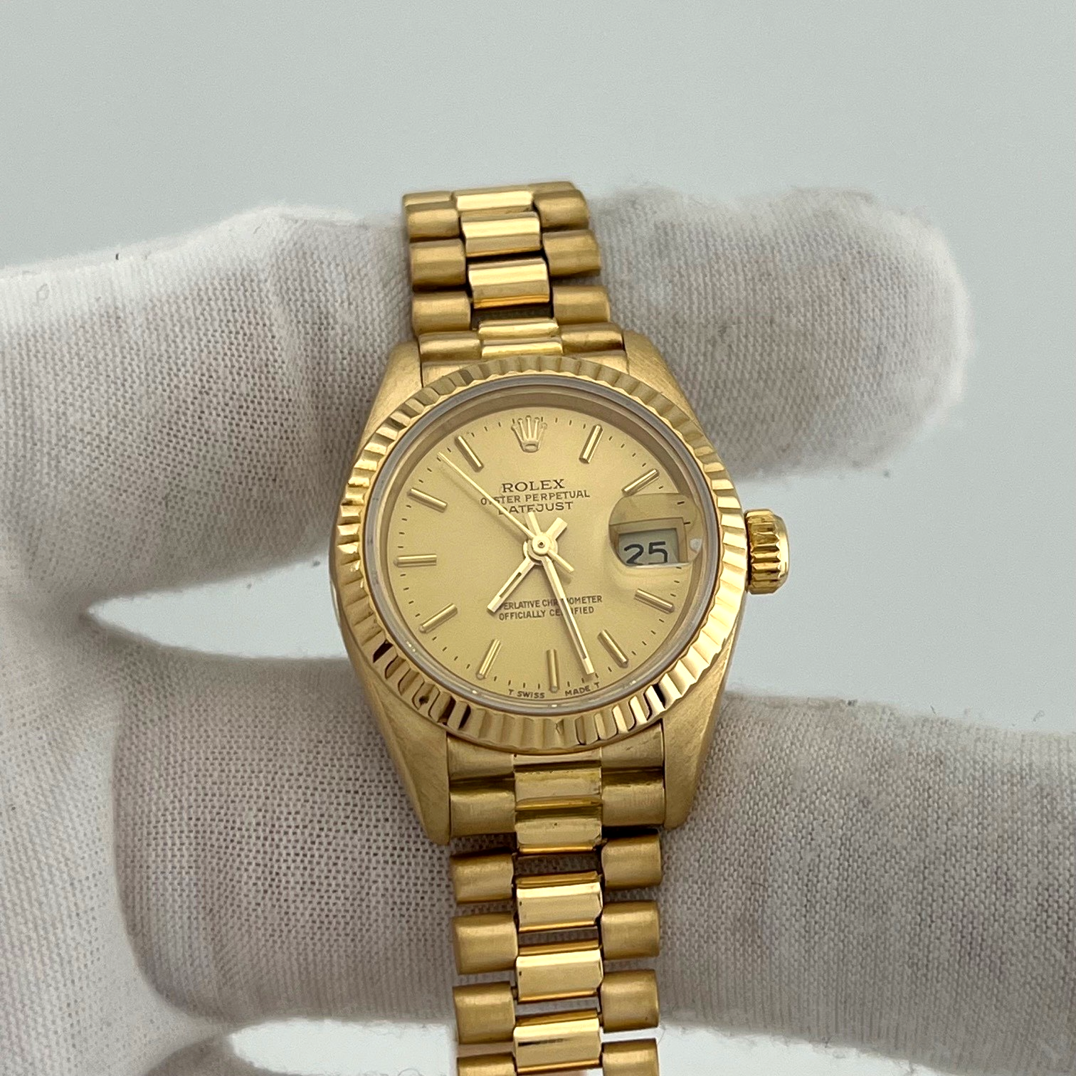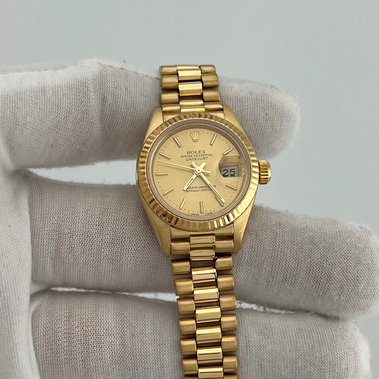 Rolex Ladies President Datejust 69178 Champagne Dial 18k Yellow Gold Rolex Sale! from 949500 /per This item is a recurring or deferred purchase. By continuing, I agree to the cancellation policy and authorize you to charge my payment method at the prices, frequency and dates listed on this page until my order is fulfilled or I cancel, if permitted. +1 (619) 232-1273 This item is currently on backorder but you can still purchase it now and we'll ship as soon as more become available. Style Number: 69178Serial: 813****Year: 1984 Model: Rolex Ladies President Datejust Case Material: 18k Yellow Gold Band: 18k Yellow Gold President Bezel: 18k Yellow Gold Fluted Dial: Champagne Dial Crystal: Sapphire Case Size: 26mm Includes: - Rolex Box - Certified Appraisal - 1 Year WarrantySKU 22894 / 118210TOC080825