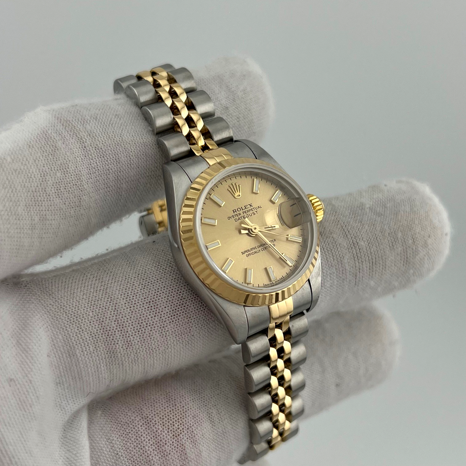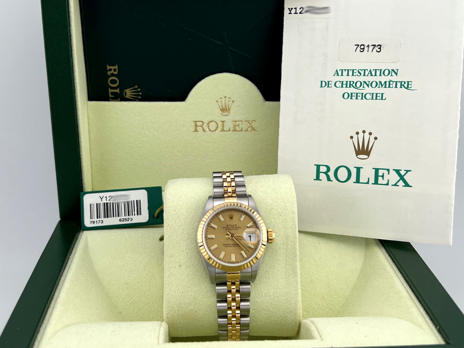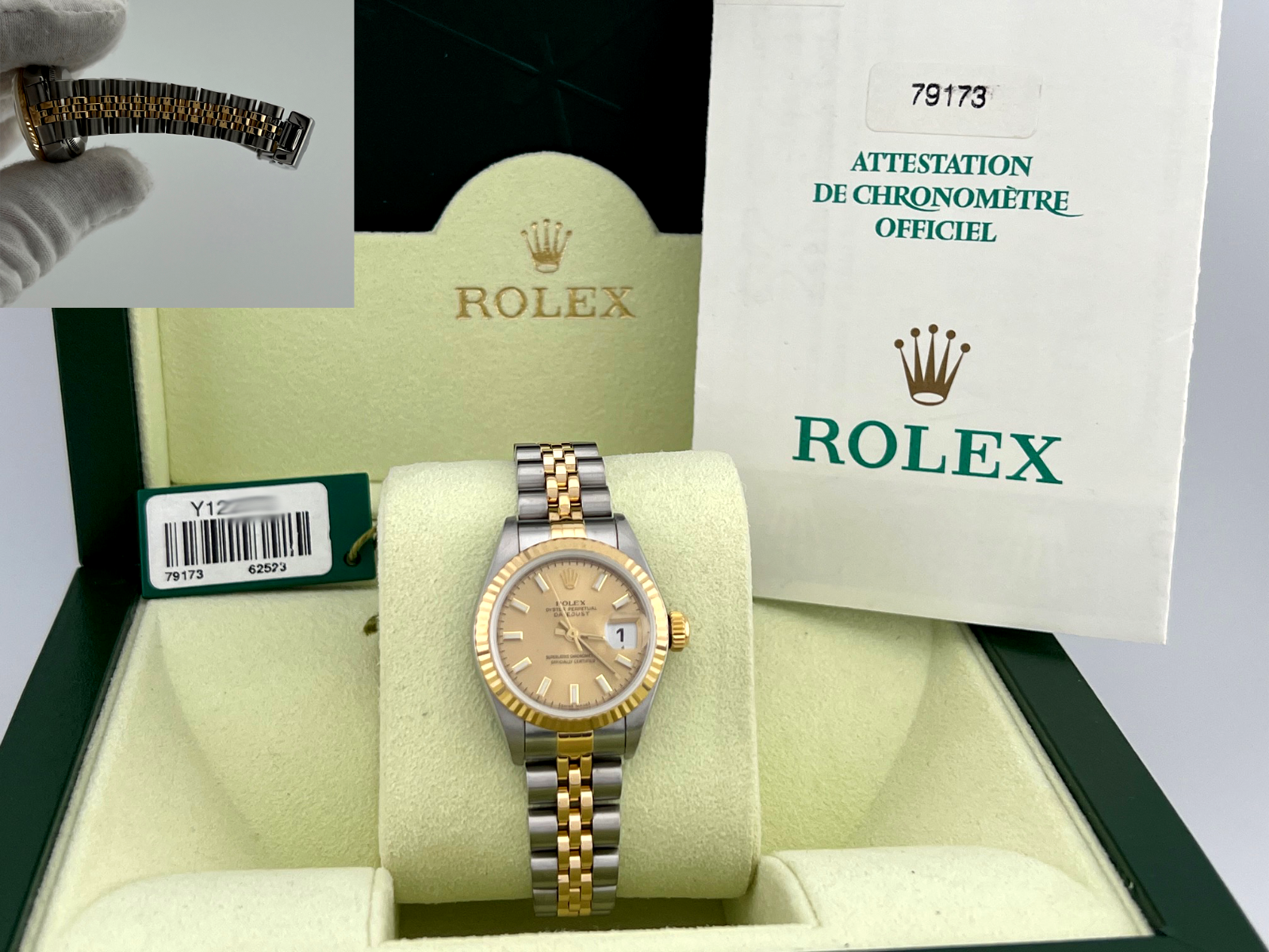 Rolex Lady Datejust 79173 26mm Champagne Dial 18k Yellow Gold Steel Box Papers Rolex Sale! from 699500 /per This item is a recurring or deferred purchase. By continuing, I agree to the cancellation policy and authorize you to charge my payment method at the prices, frequency and dates listed on this page until my order is fulfilled or I cancel, if permitted. +1 (619) 232-1273 This item is currently on backorder but you can still purchase it now and we'll ship as soon as more become available. Style Number: 79173Serial: Y12****Year: 2002 Model: Rolex Ladies Datejust Case Material: Stainless Steel Band: 18k Yellow Gold & Stainless Steel Jubilee Bezel: 18k Yellow Gold Fluted Dial: Champagne Crystal: Sapphire Case Size: 26mm Includes: - Rolex Box & Paper- Certified Appraisal - 1 Year WarrantySKU 23241 / 19525TGC101725