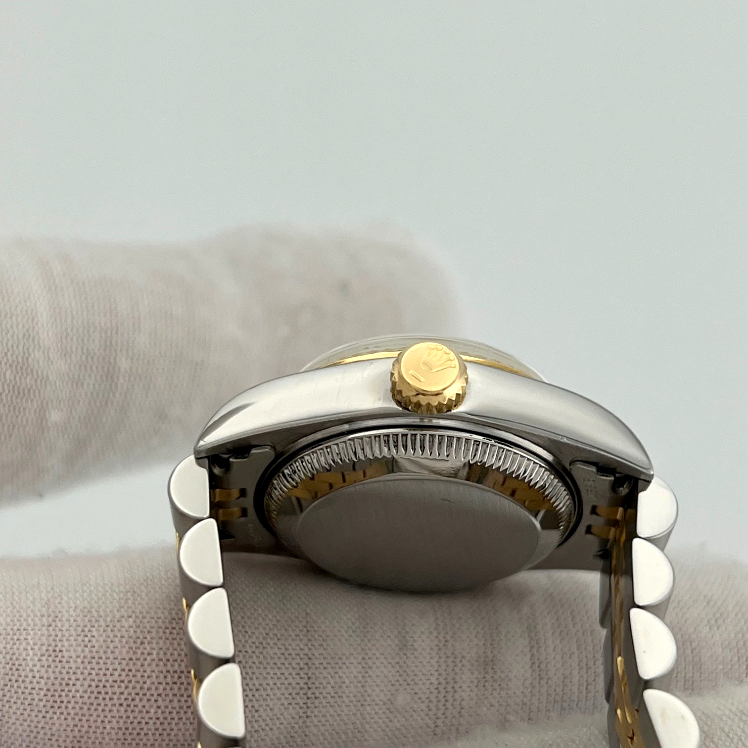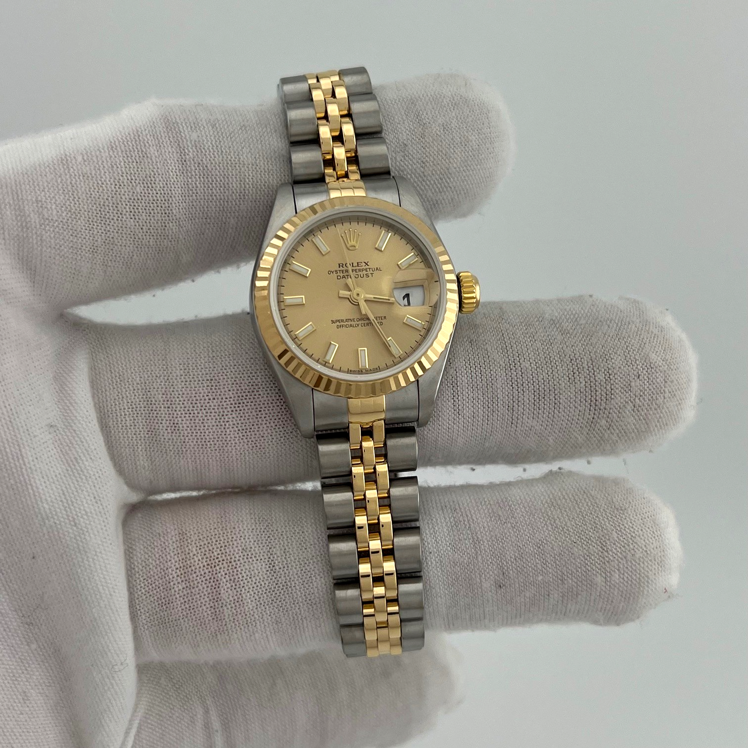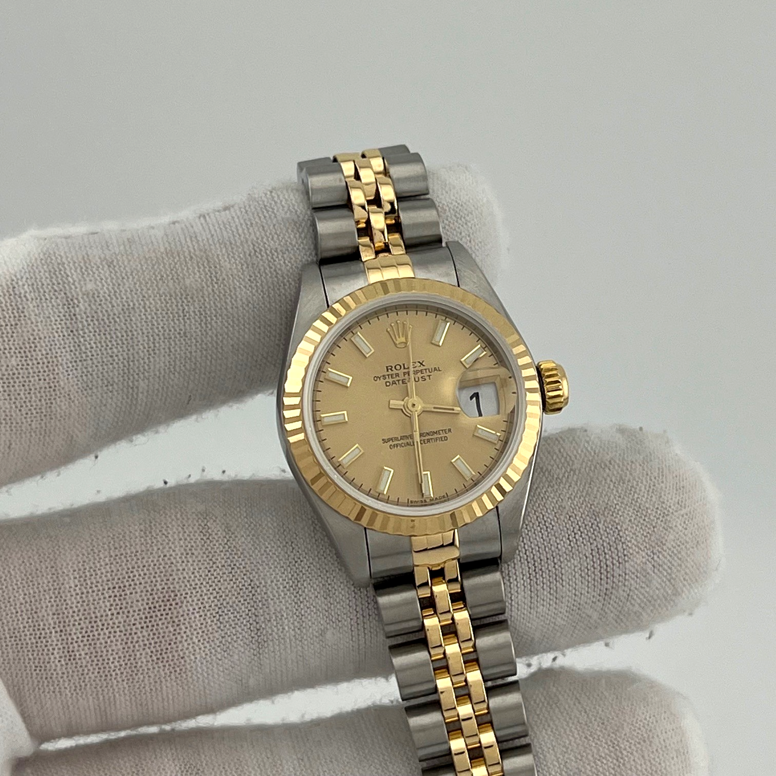 Rolex Lady Datejust 79173 26mm Champagne Dial 18k Yellow Gold Steel Box Papers Rolex Sale! from 699500 /per This item is a recurring or deferred purchase. By continuing, I agree to the cancellation policy and authorize you to charge my payment method at the prices, frequency and dates listed on this page until my order is fulfilled or I cancel, if permitted. +1 (619) 232-1273 This item is currently on backorder but you can still purchase it now and we'll ship as soon as more become available. Style Number: 79173Serial: Y12****Year: 2002 Model: Rolex Ladies Datejust Case Material: Stainless Steel Band: 18k Yellow Gold & Stainless Steel Jubilee Bezel: 18k Yellow Gold Fluted Dial: Champagne Crystal: Sapphire Case Size: 26mm Includes: - Rolex Box & Paper- Certified Appraisal - 1 Year WarrantySKU 23241 / 19525TGC101725