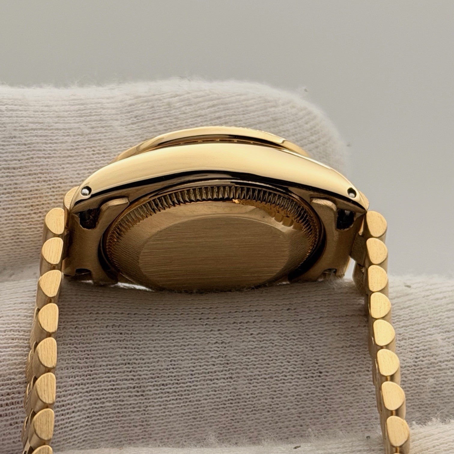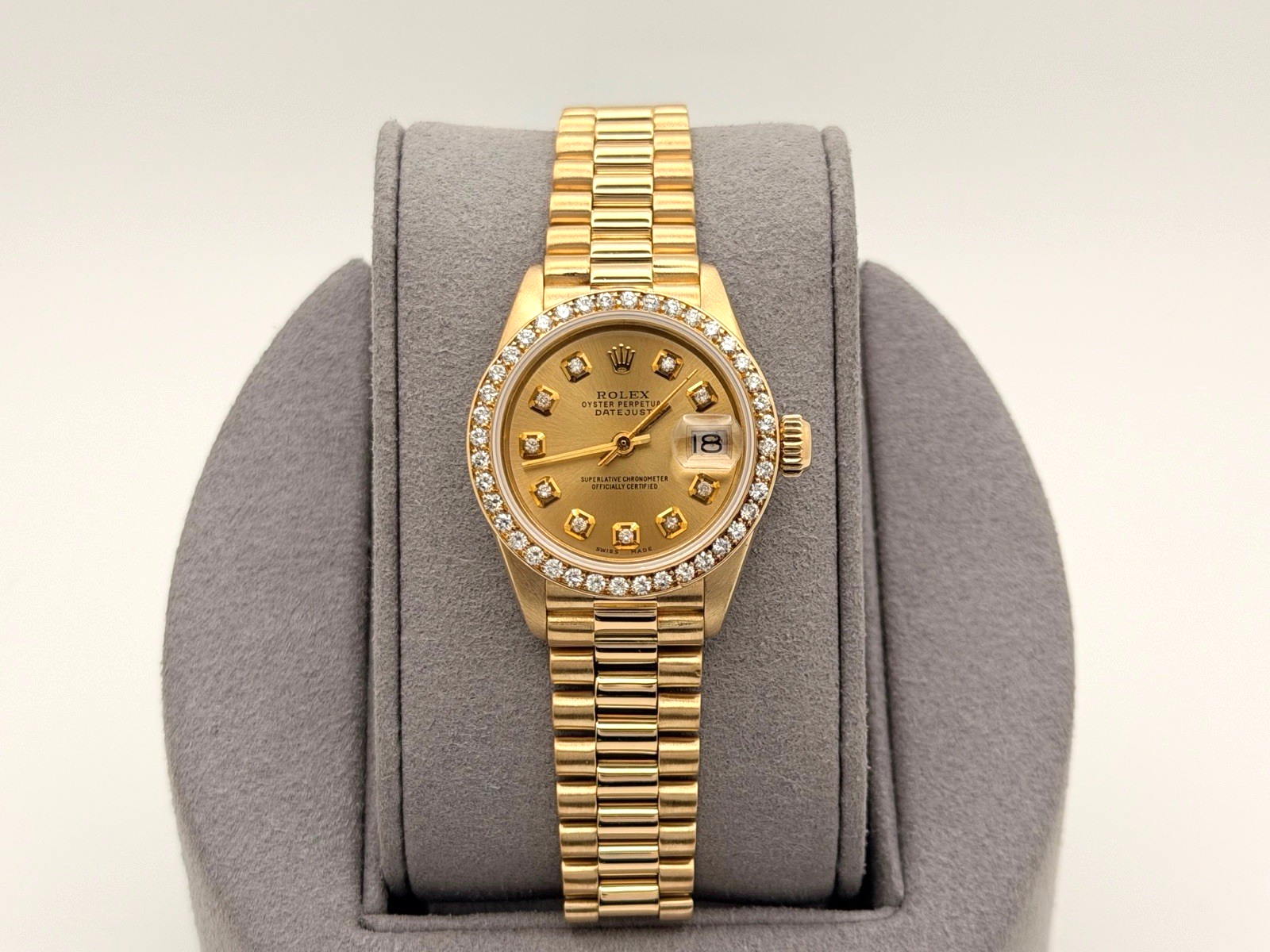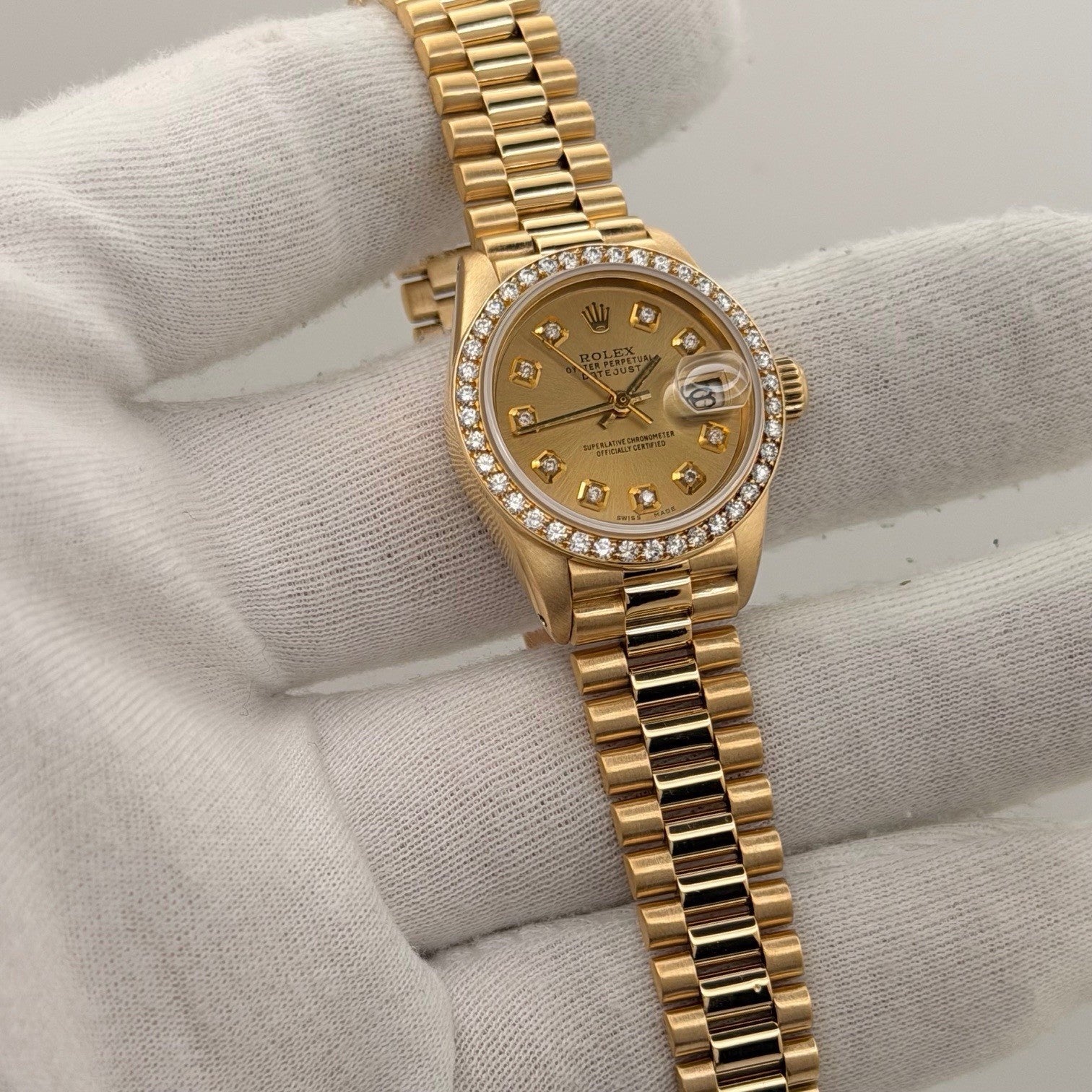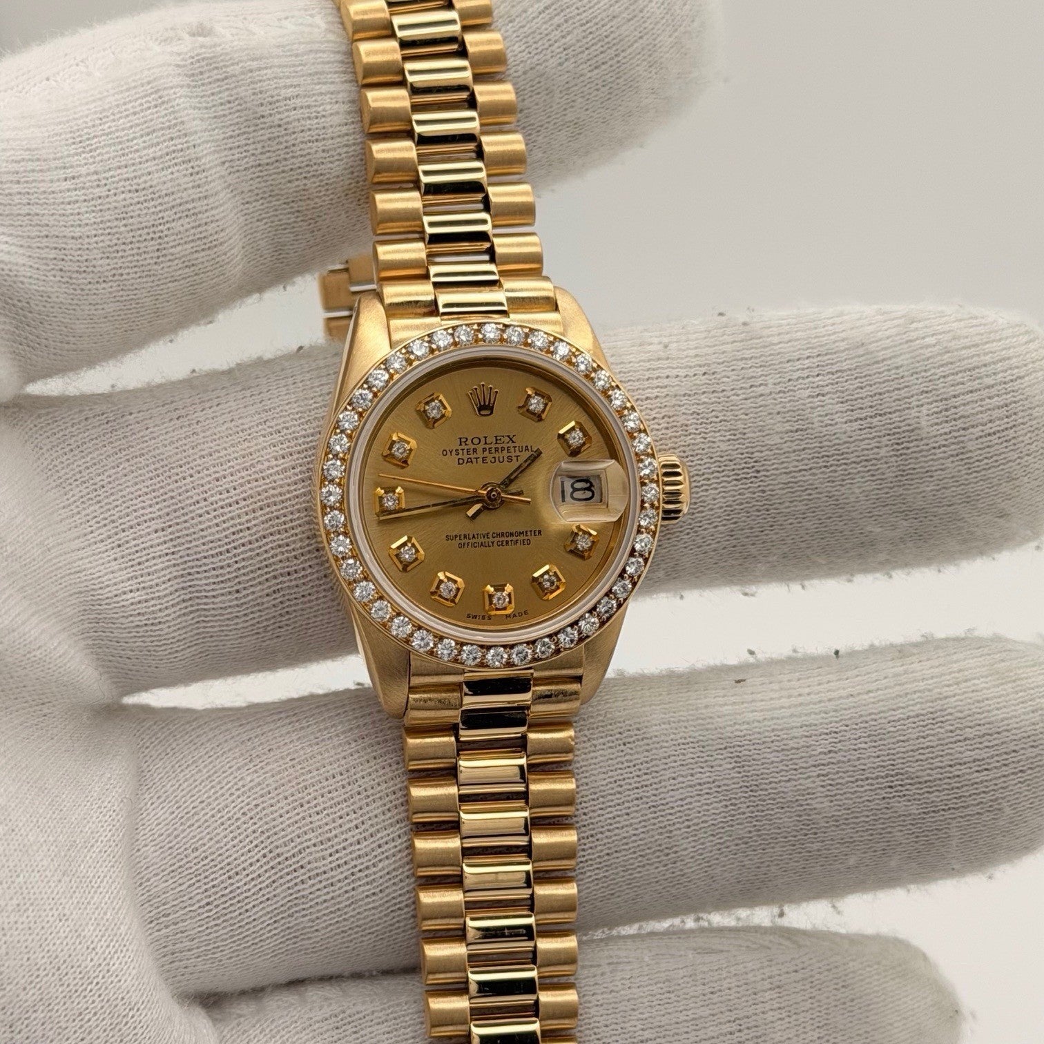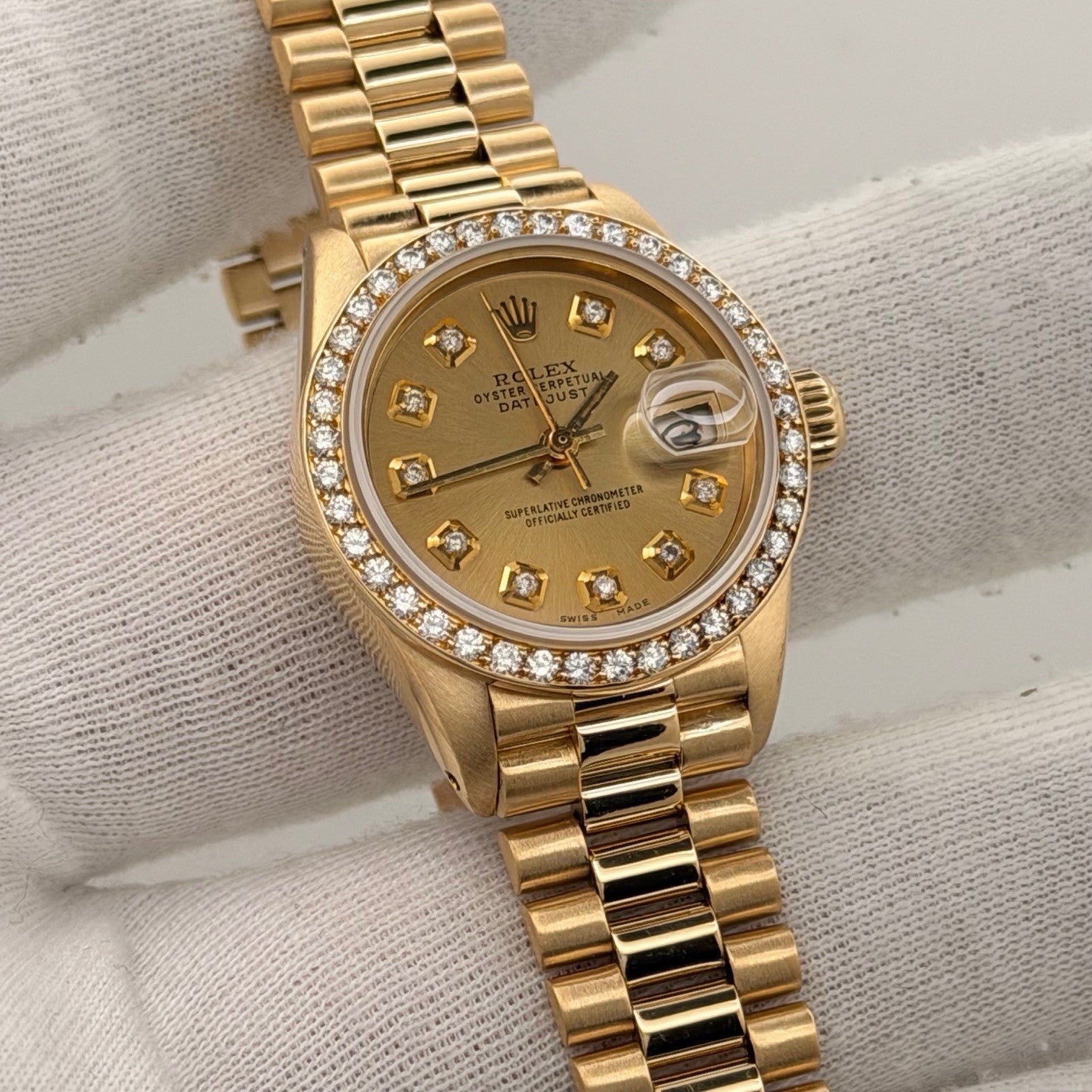 Rolex Lady Datejust President 6917 Champagne Diamond Dial Diamond Bezel 18k Gold Rolex Sale! from 999500 /per This item is a recurring or deferred purchase. By continuing, I agree to the cancellation policy and authorize you to charge my payment method at the prices, frequency and dates listed on this page until my order is fulfilled or I cancel, if permitted. +1 (619) 232-1273 This item is currently on backorder but you can still purchase it now and we'll ship as soon as more become available. Style Number: 6917Serial: 531****Year: 1978 Model: Rolex Lady Datejust President Case Material: 18k Yellow Gold Band: 18k Yellow Gold President Bezel: Custom Diamond Bezel Dial: Custom Champagne Diamond Dial Crystal: Sapphire Case Size: 26mm Includes: - Elegant Watch Box- Certified Appraisal - 1 Year WarrantySKU 23486 / 118825TSTADEN110525