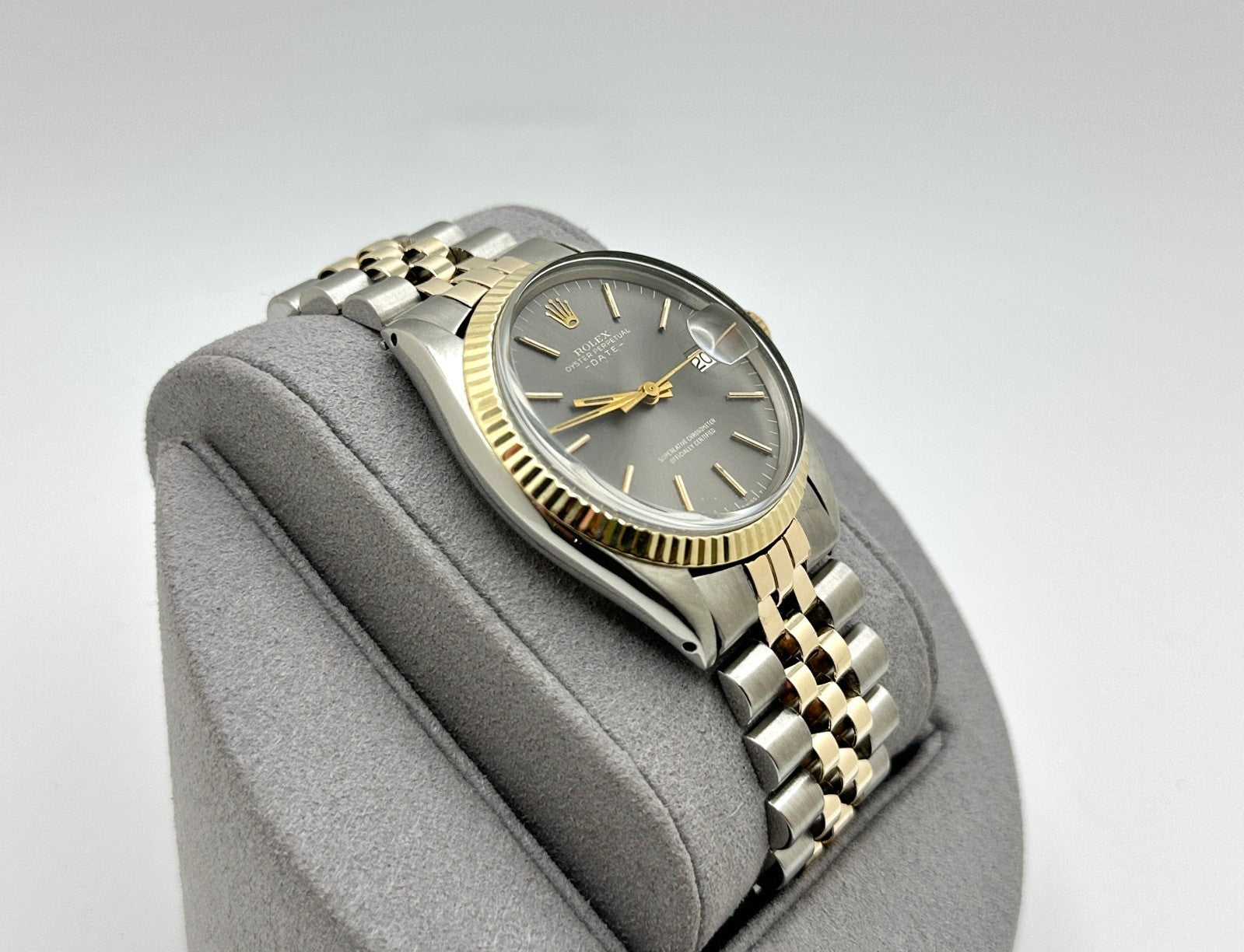 Rolex Oyster Perpetual Date 1500 34mm Gray Dial 14K Yellow Gold Stainless Steel Rolex Sale! from 499500 /per This item is a recurring or deferred purchase. By continuing, I agree to the cancellation policy and authorize you to charge my payment method at the prices, frequency and dates listed on this page until my order is fulfilled or I cancel, if permitted. +1 (619) 232-1273 This item is currently on backorder but you can still purchase it now and we'll ship as soon as more become available. Style Number: 1500Serial: 2351***Year: 1970 Model: Rolex Oyster Perpetual Date Case Material: Stainless Steel Band: Custom 14K Yellow Gold & Stainless Steel Bezel: 14K Yellow Gold Dial: Gray Crystal: Acrylic Case Size: 34mm Includes: - Rolex Box & Paper- Certified Appraisal - One Year WarrantySKU 21479 / 13810TGCORE071924