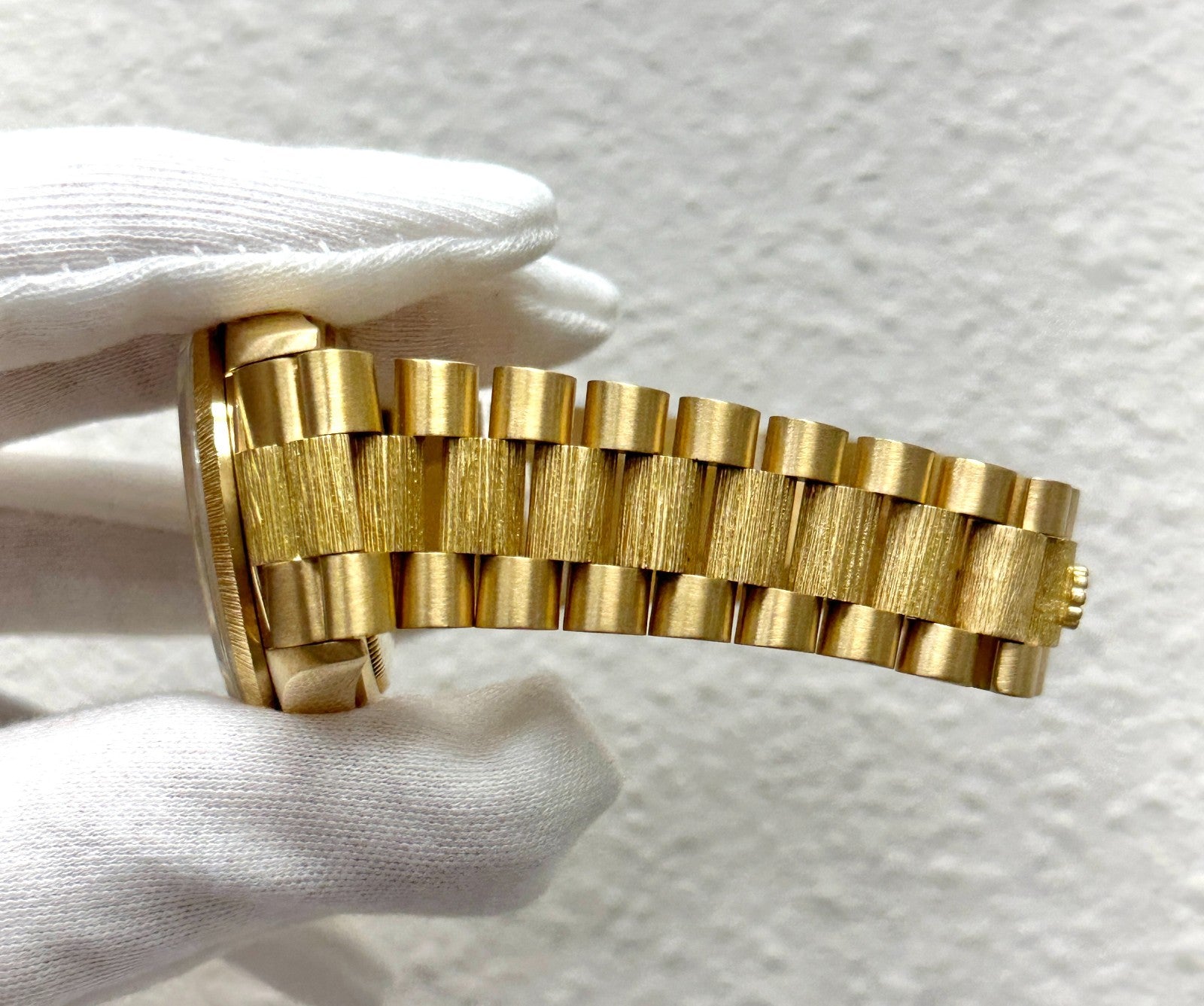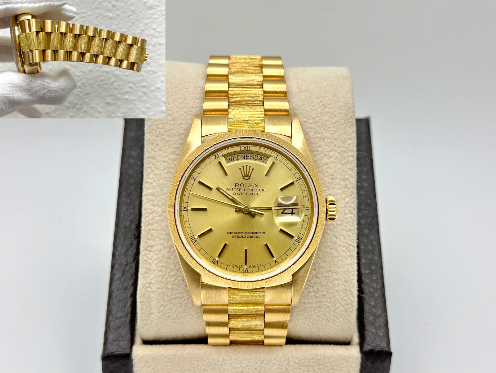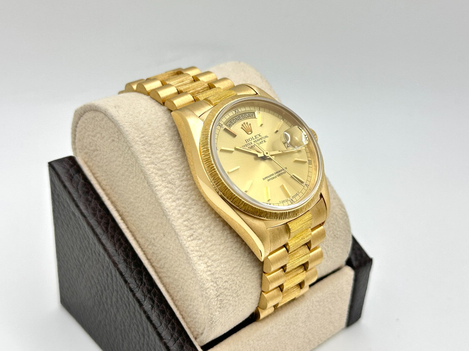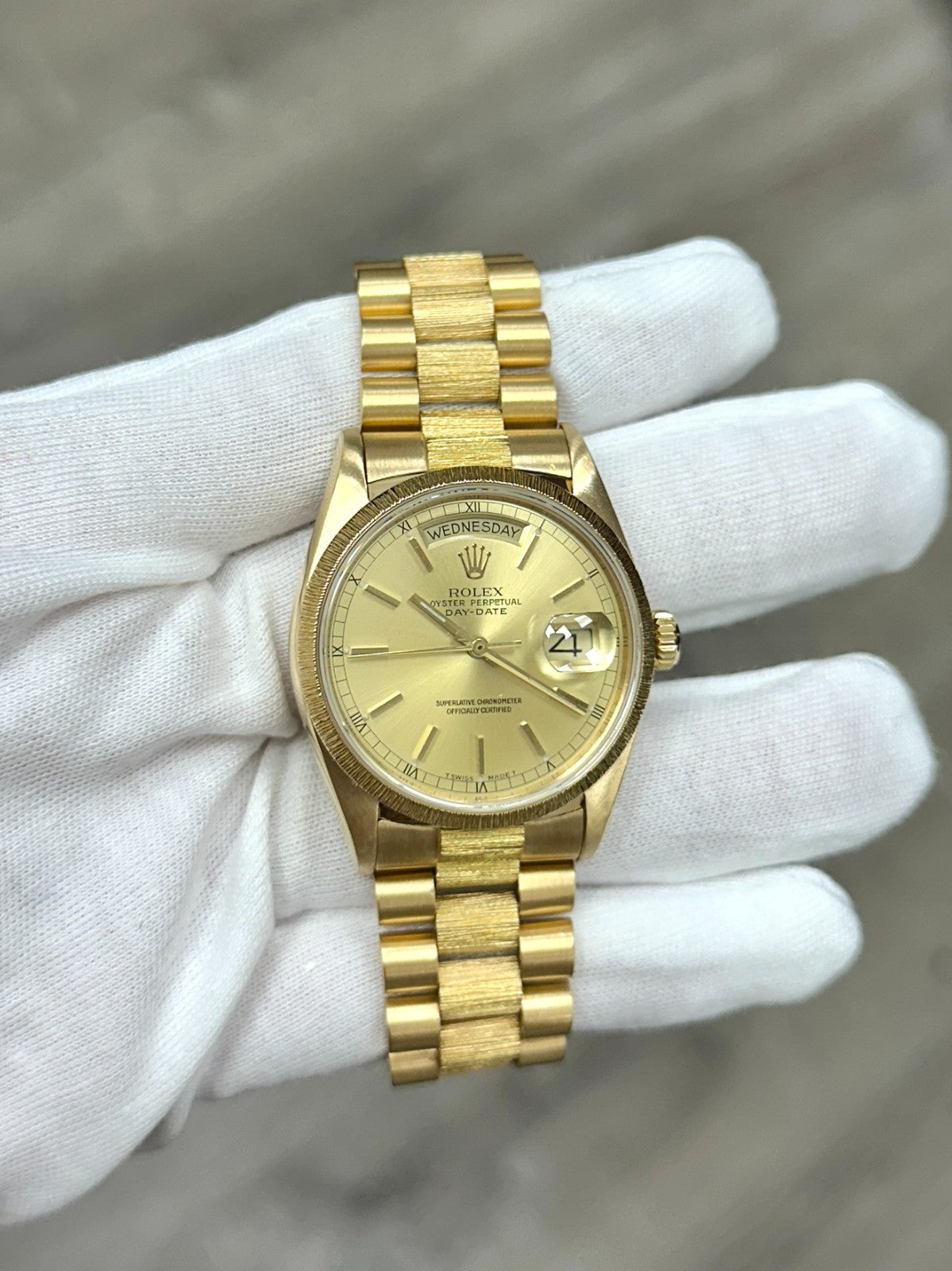 Rolex President Day Date 18078 36mm Bark Finish Champagne Dial 18k Yellow Gold Rolex Sale! from 1999500 /per This item is a recurring or deferred purchase. By continuing, I agree to the cancellation policy and authorize you to charge my payment method at the prices, frequency and dates listed on this page until my order is fulfilled or I cancel, if permitted. +1 (619) 232-1273 This item is currently on backorder but you can still purchase it now and we'll ship as soon as more become available. Style Number: 18078Serial: 9748***Year: 1987 Model: Rolex President Day-Date Case Material: 18K Yellow Gold Band: 18K Yellow Gold Bezel: 18K Yellow Gold Dial: Champagne Crystal: Sapphire Crystal Case Size: 36mm Includes: - Elegant Watch Box- Certified Appraisal - One Year WarrantySKU 23054 / 137215TSD