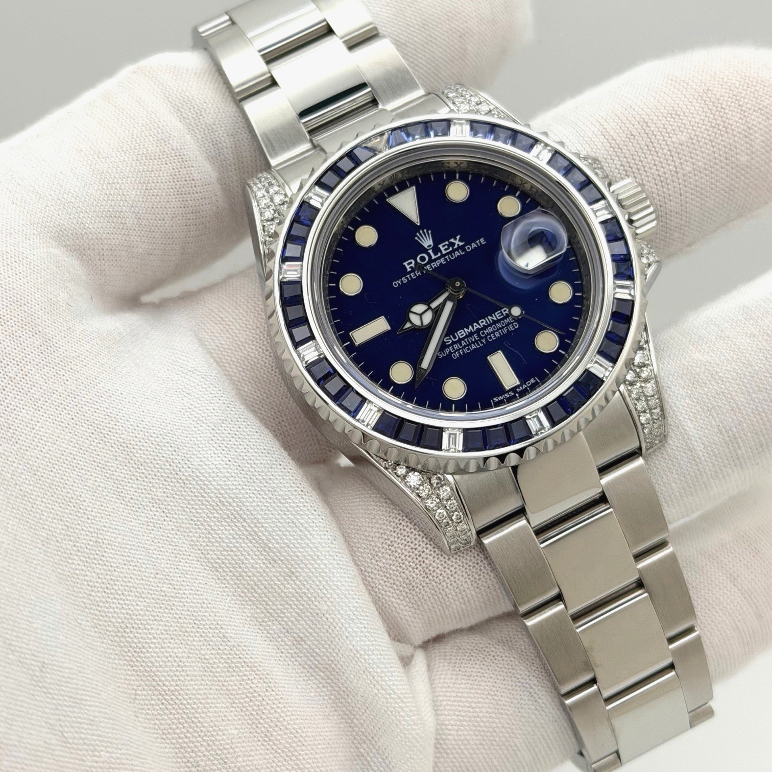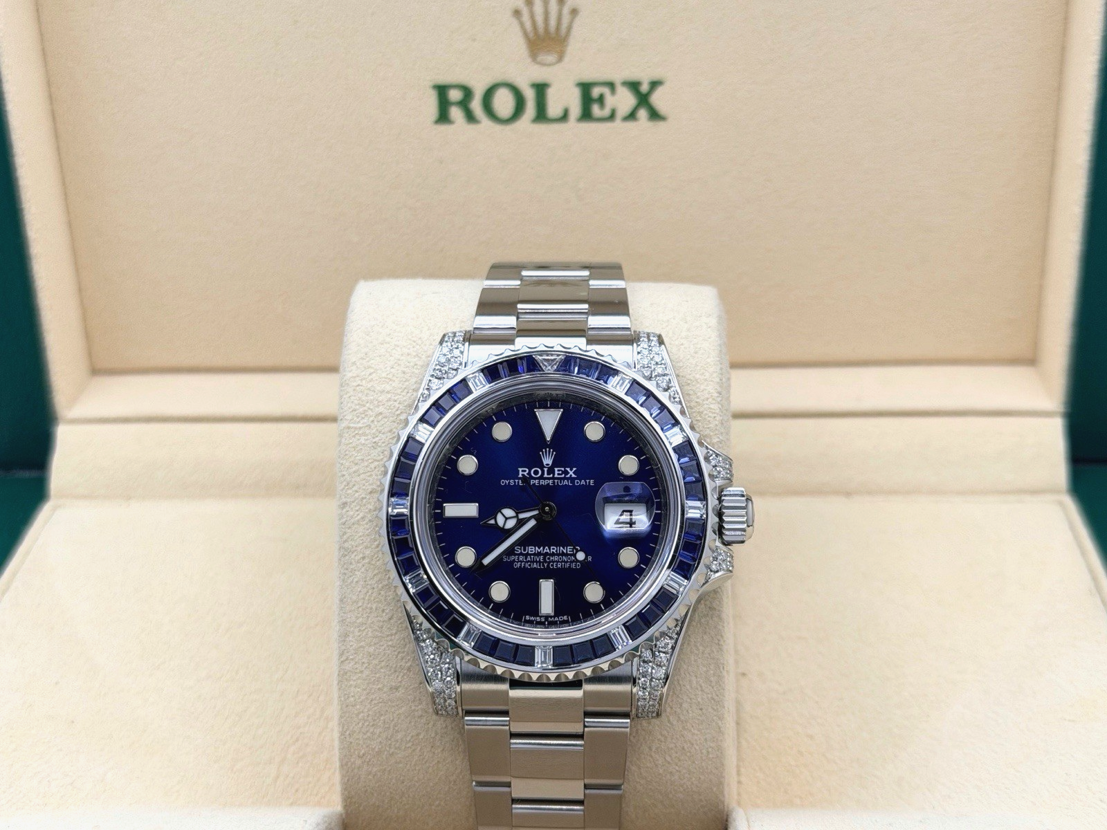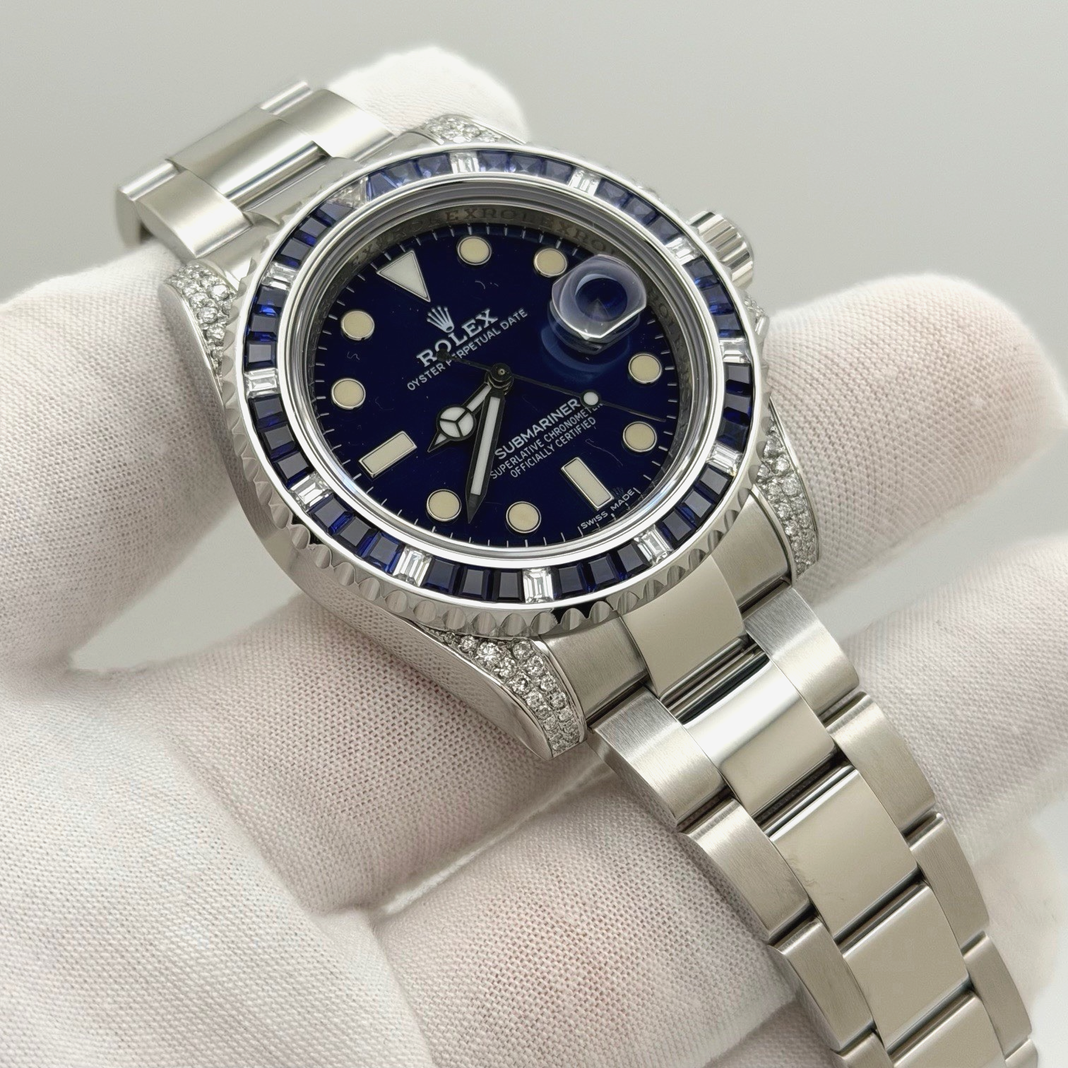 Rolex Submariner Blue 116610 40mm Custom SABR Diamond Case Sapphire Bezel Steel Rolex Sale! from 1299500 /per This item is a recurring or deferred purchase. By continuing, I agree to the cancellation policy and authorize you to charge my payment method at the prices, frequency and dates listed on this page until my order is fulfilled or I cancel, if permitted. +1 (619) 232-1273 This item is currently on backorder but you can still purchase it now and we'll ship as soon as more become available. Style Number: 116610Serial: 70W7****Year: 2010-2020 Model: Rolex Submariner Date Case Material: Stainless Steel with Custom Diamonds Band: Stainless Steel Bezel: Custom Diamond & Sapphire Bezel Dial: Blue Crystal: Sapphire Case Size: 40mm Includes: - Rolex Watch Box- Certified Appraisal - One Year WarrantySKU 23576 / 122560TMF011826