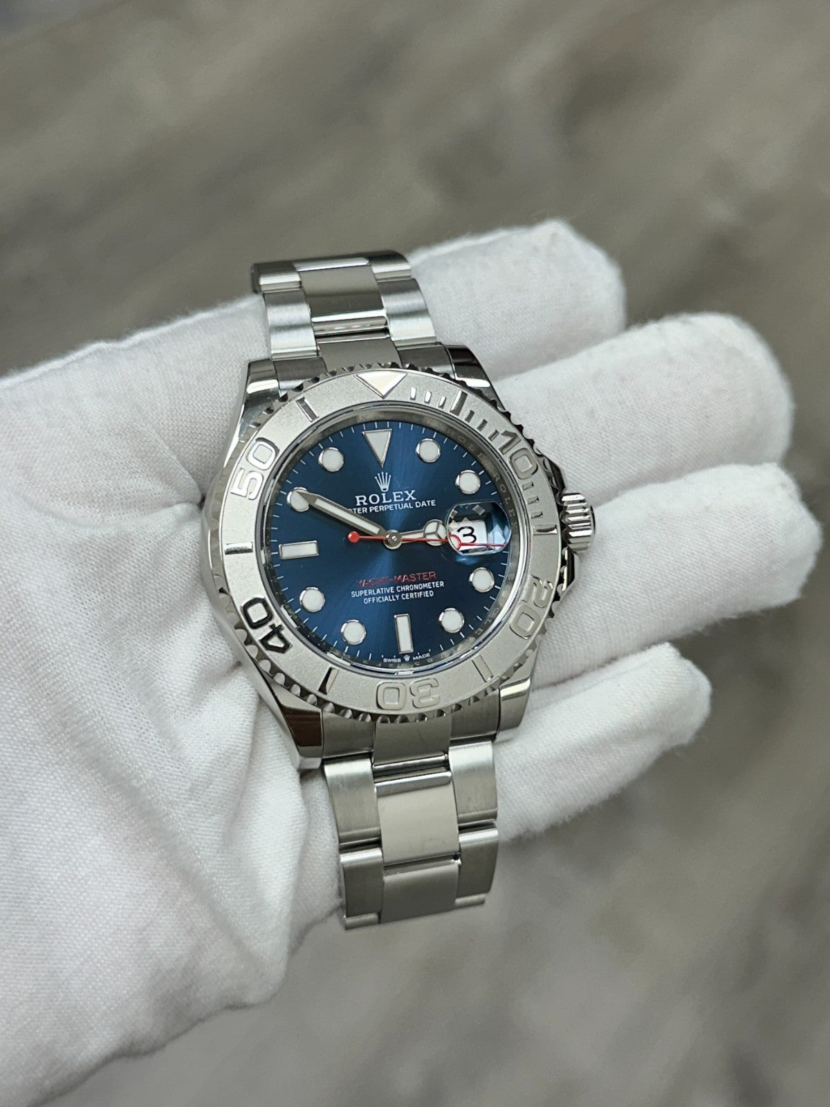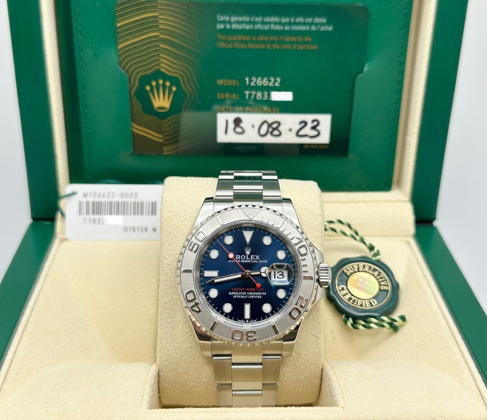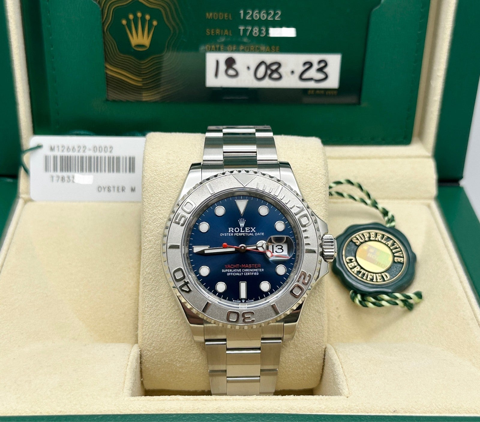 Rolex Yacht Master 126622 40mm Blue Dial Platinum Stainless Steel Box Paper 2023 Rolex Sale! from 1439500 /per This item is a recurring or deferred purchase. By continuing, I agree to the cancellation policy and authorize you to charge my payment method at the prices, frequency and dates listed on this page until my order is fulfilled or I cancel, if permitted. +1 (619) 232-1273 This item is currently on backorder but you can still purchase it now and we'll ship as soon as more become available. Style Number: 126622Serial: T7833***Year: 2023 Model: Rolex Yacht Master Case Material: Stainless Steel Band: Stainless Steel Bezel: Platinum Dial: Blue Crystal: Sapphire Crystal Case Size: 40mm Includes: - Rolex Box & Paper- Certified Appraisal - Five Year Factory Warranty from Original Purchase DateSKU 23014 / 136000TSD091125