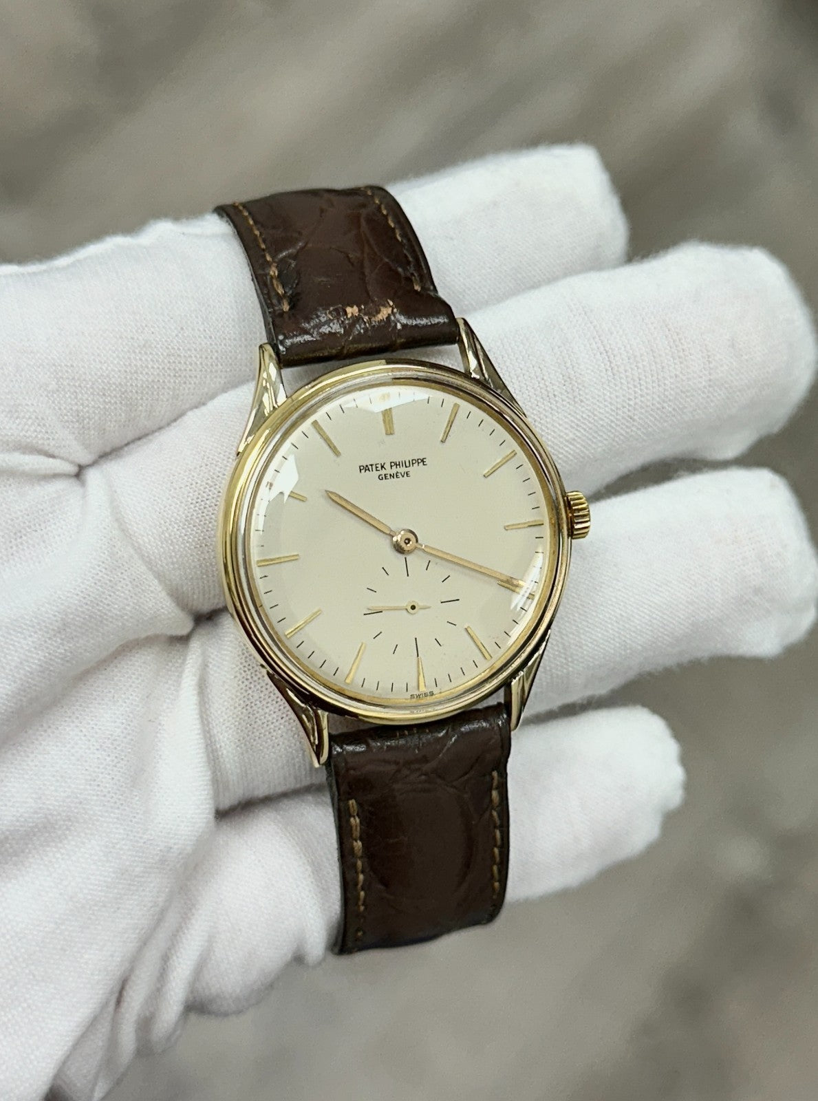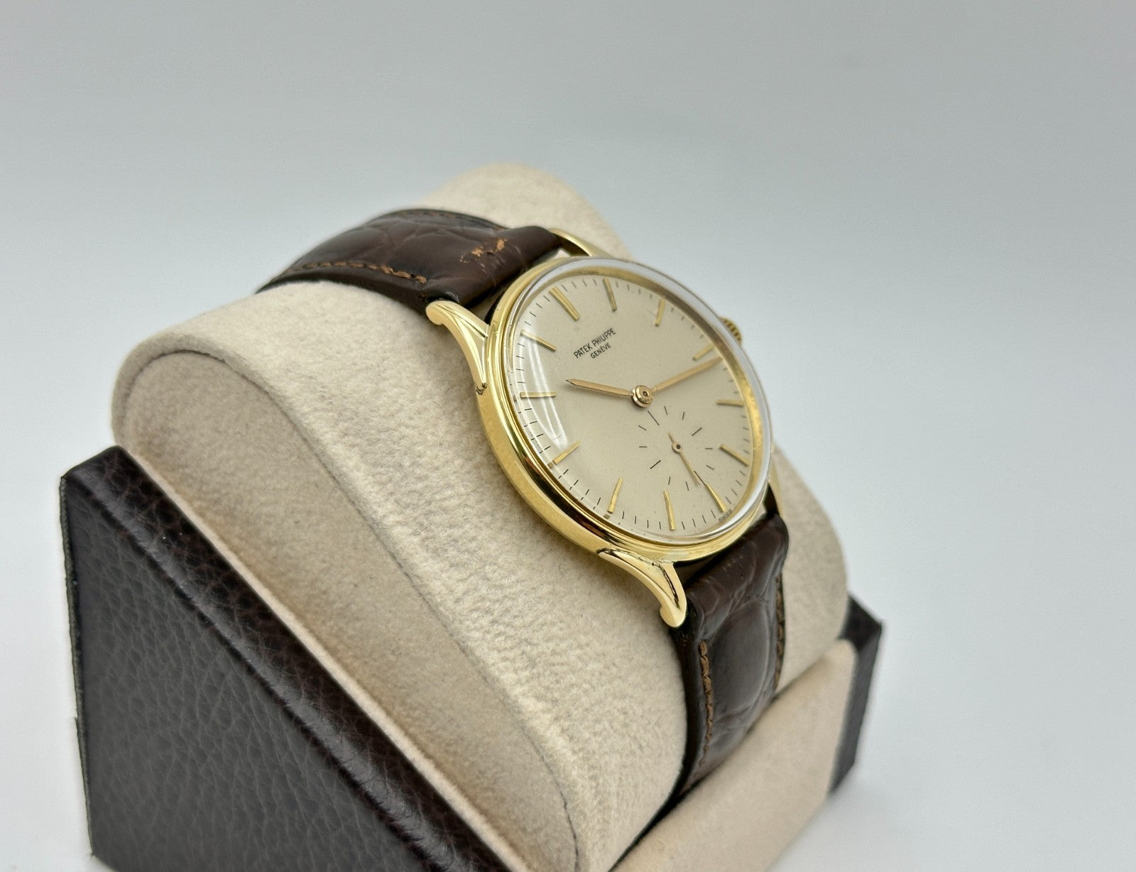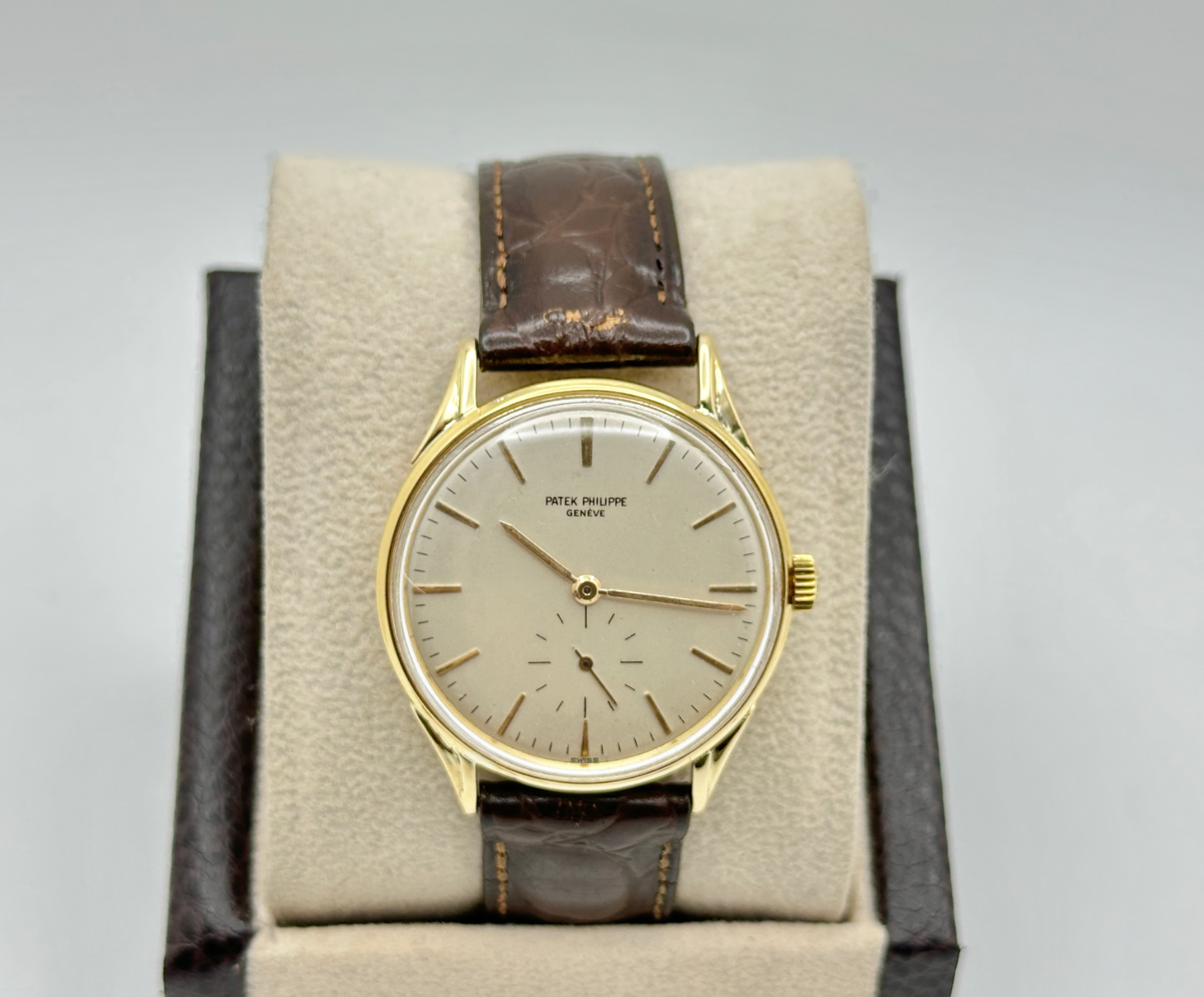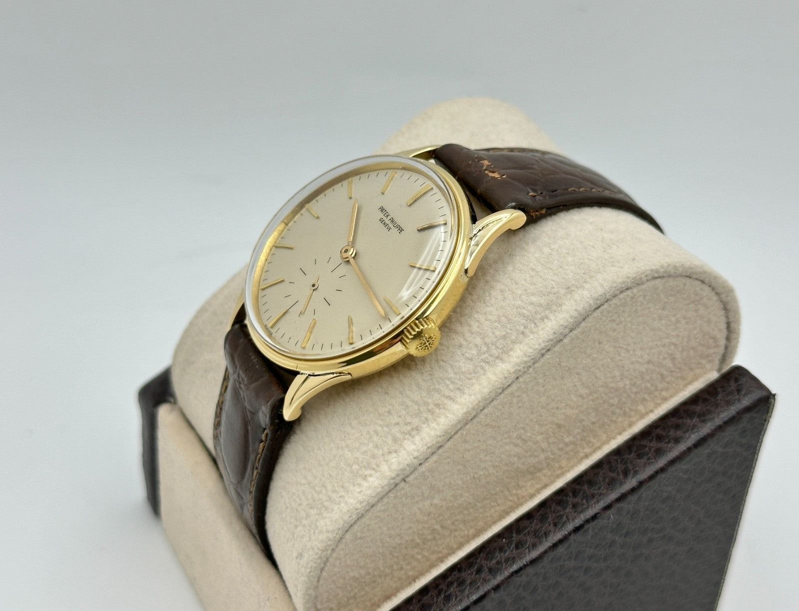 Vintage Patek Philippe Calatrava 3425 33mm 18K Yellow Gold Patek Philippe Sale! from 1099500 /per This item is a recurring or deferred purchase. By continuing, I agree to the cancellation policy and authorize you to charge my payment method at the prices, frequency and dates listed on this page until my order is fulfilled or I cancel, if permitted. +1 (619) 232-1273 This item is currently on backorder but you can still purchase it now and we'll ship as soon as more become available. Style Number: 3425Model: Patek Philippe Calatrava Case Material: 18K Yellow Gold Band: Custom Brown Leather Strap Bezel: 18K Yellow Gold Dial: Silver Dial Face: Acrylic Case Size: 33mm Includes: -Elegant Watch Box-Certified Appraisal -1 Year WarrantySKU 23218 / 118750OFC101625