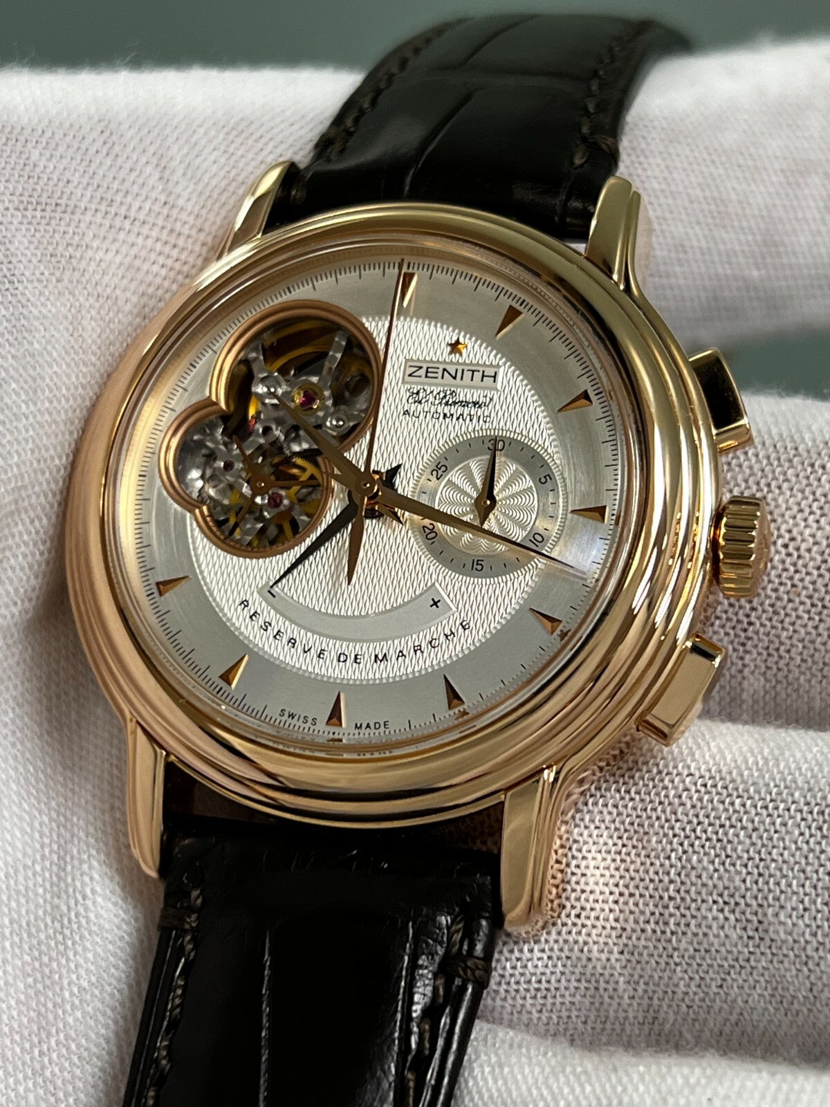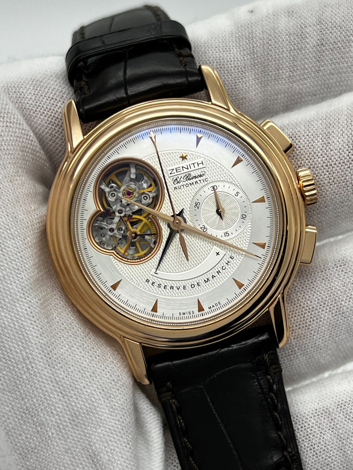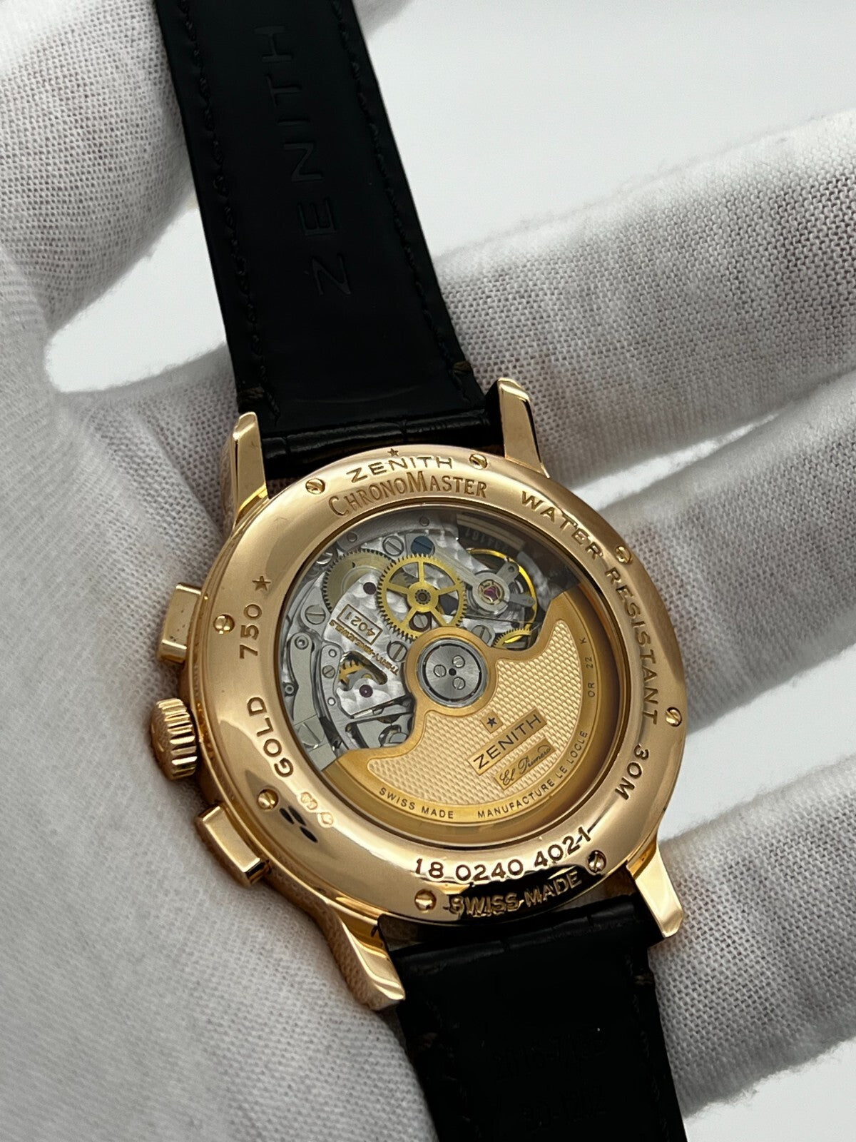 Zenith 18.0240.4021/01.C495 Chronomaster T Open 18K Rose Gold Leather Strap Box Zenith Sale! from 1599500 /per This item is a recurring or deferred purchase. By continuing, I agree to the cancellation policy and authorize you to charge my payment method at the prices, frequency and dates listed on this page until my order is fulfilled or I cancel, if permitted. +1 (619) 232-1273 This item is currently on backorder but you can still purchase it now and we'll ship as soon as more become available. Style Number: 18.0240.4021/01.C495 Model: Chronomaster T Open Case Material: 18K Rose Gold Band: Leather Bezel: 18K Rose Gold Dial: Silver Face: Sapphire Crystal Case Size: 40mm Weight: 135 Grams Includes: -Zenith Box-Certified Appraisal -1 Year WarrantySKU 18483 / 117400TJD091421