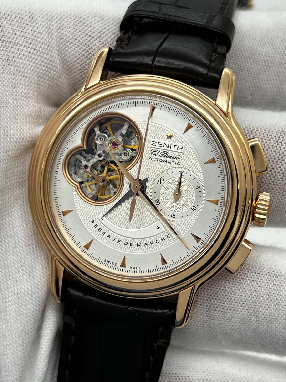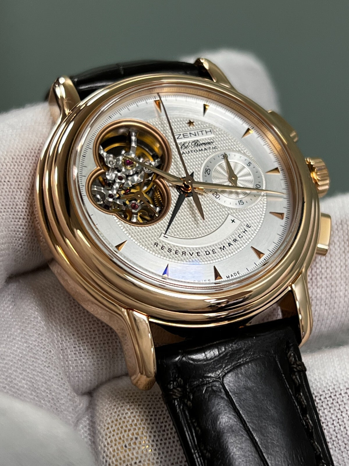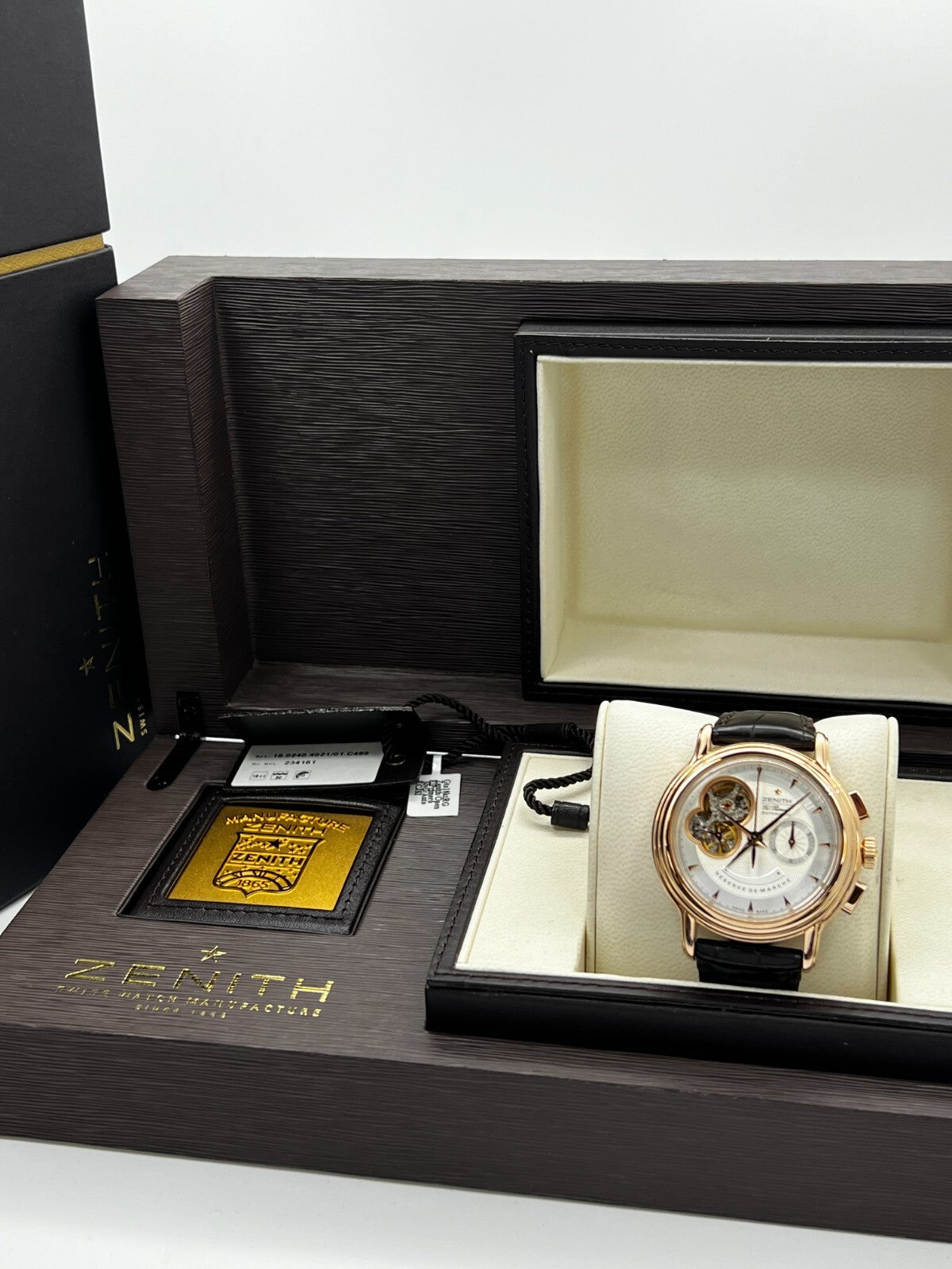Zenith 18.0240.4021/01.C495 Chronomaster T Open 18K Rose Gold Leather Strap Box Zenith Sale! from 1599500 /per This item is a recurring or deferred purchase. By continuing, I agree to the cancellation policy and authorize you to charge my payment method at the prices, frequency and dates listed on this page until my order is fulfilled or I cancel, if permitted. +1 (619) 232-1273 This item is currently on backorder but you can still purchase it now and we'll ship as soon as more become available. Style Number: 18.0240.4021/01.C495 Model: Chronomaster T Open Case Material: 18K Rose Gold Band: Leather Bezel: 18K Rose Gold Dial: Silver Face: Sapphire Crystal Case Size: 40mm Weight: 135 Grams Includes: -Zenith Box-Certified Appraisal -1 Year WarrantySKU 18483 / 117400TJD091421