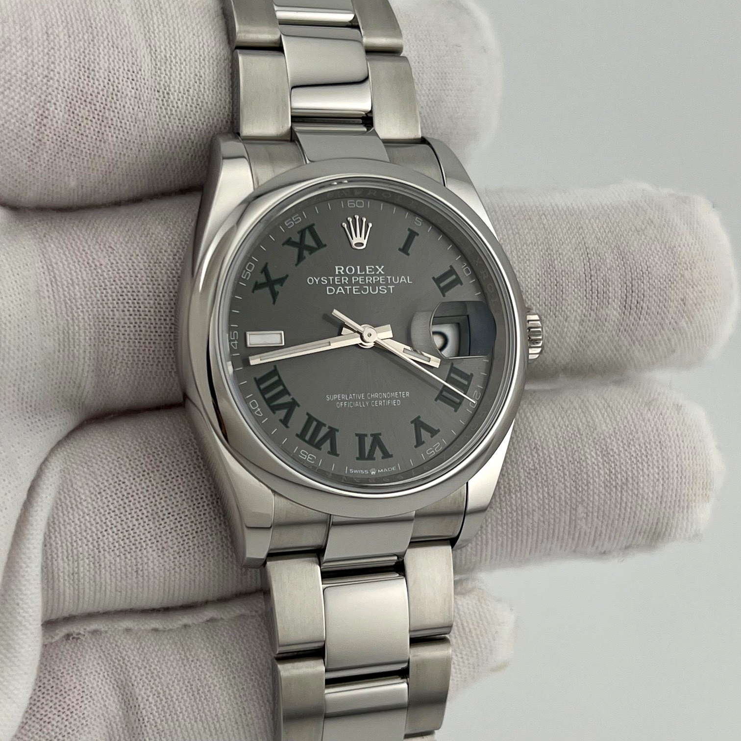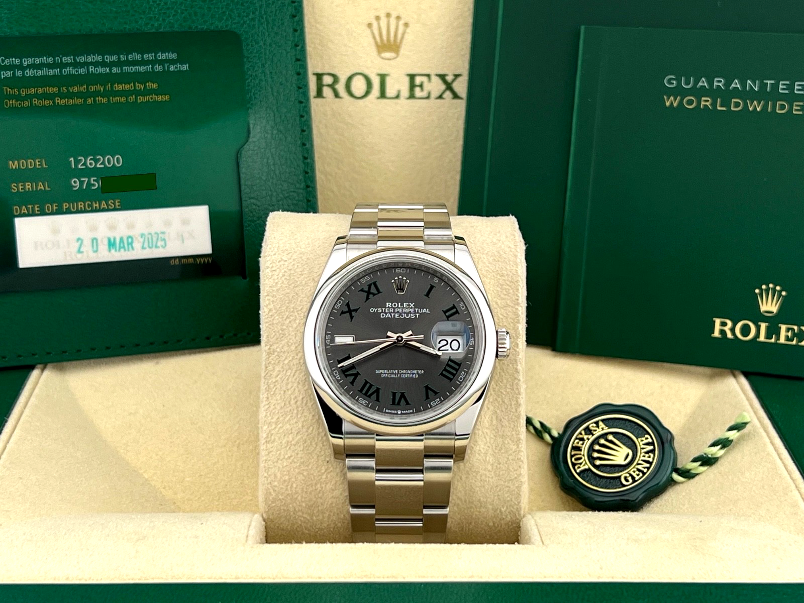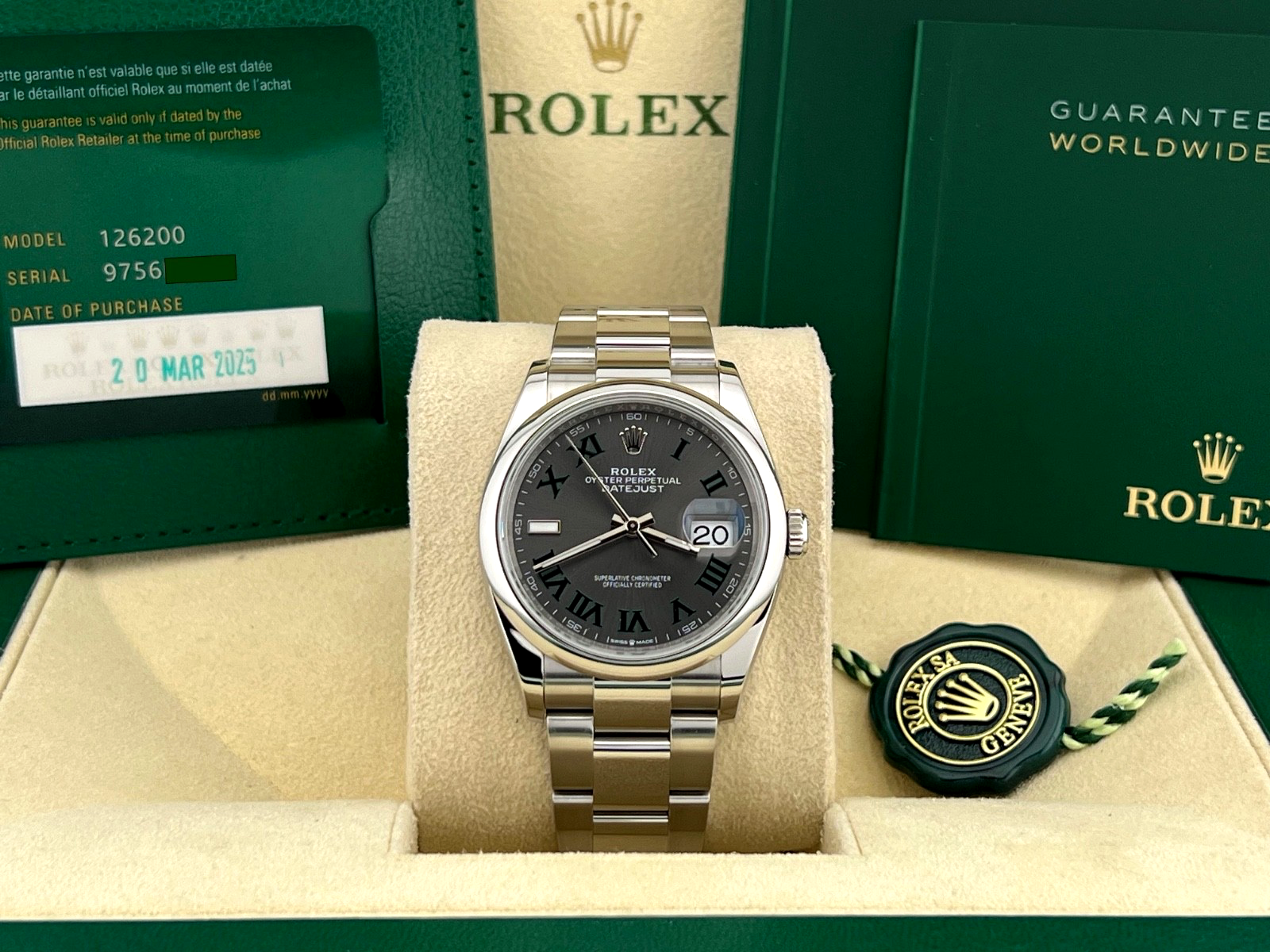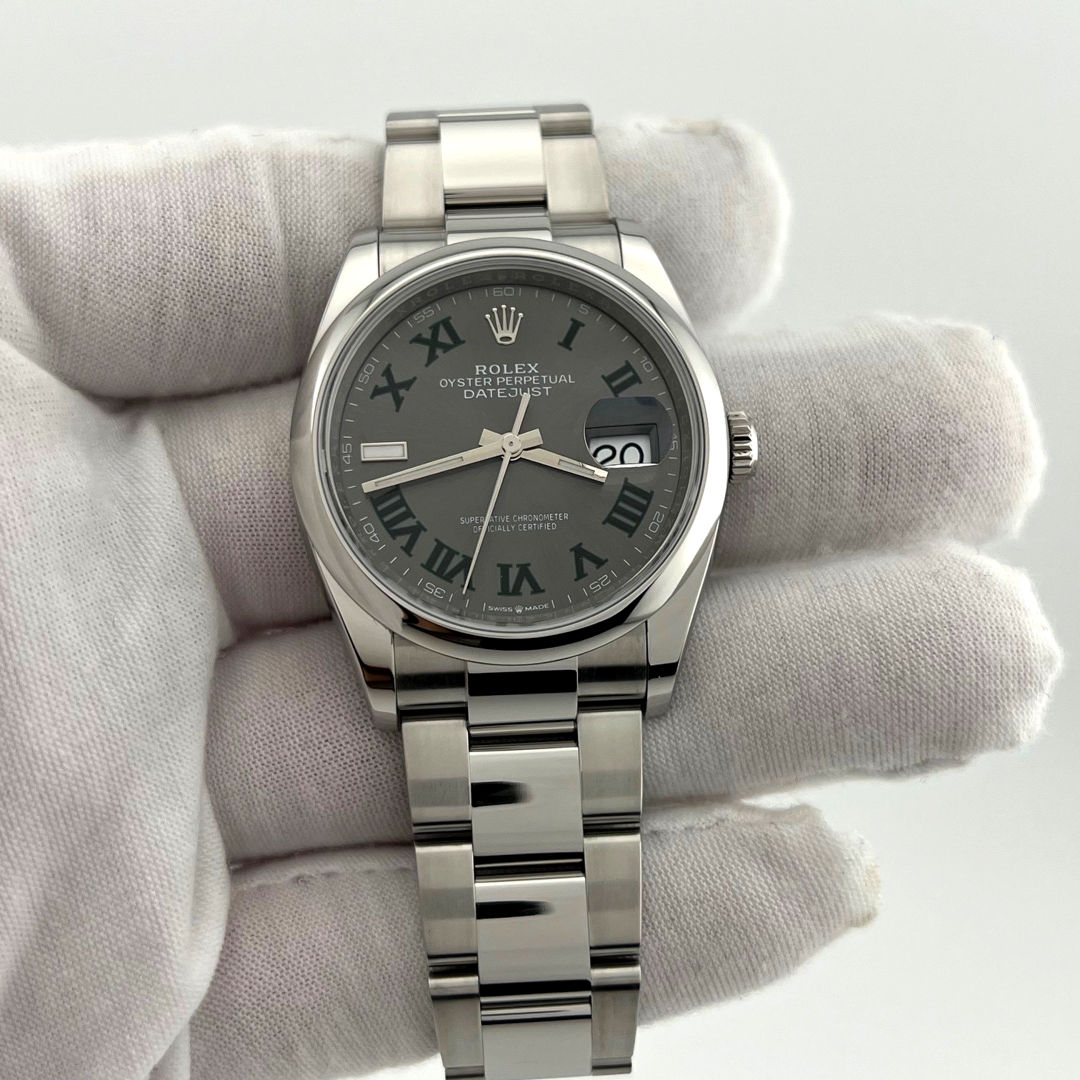 2025 Rolex Datejust Wimbledon 126200 36mm Stainless Steel Box Papers Rolex Sale! from 1049500 /per This item is a recurring or deferred purchase. By continuing, I agree to the cancellation policy and authorize you to charge my payment method at the prices, frequency and dates listed on this page until my order is fulfilled or I cancel, if permitted. +1 (619) 232-1273 This item is currently on backorder but you can still purchase it now and we'll ship as soon as more become available. Style Number: 126200Serial: 9756****Year: 2025 Model: Rolex Datejust 36 Case Material: Stainless Steel Band: Stainless Steel Bezel: Stainless Steel Dial: Wimbledon Dial Crystal: Sapphire Case Size: 36mm Includes: - 2025 Rolex Box & Paper- Certified Appraisal - Five Year Factory Warranty from Original Purchase DateSKU 23086 / 121450TOC092325