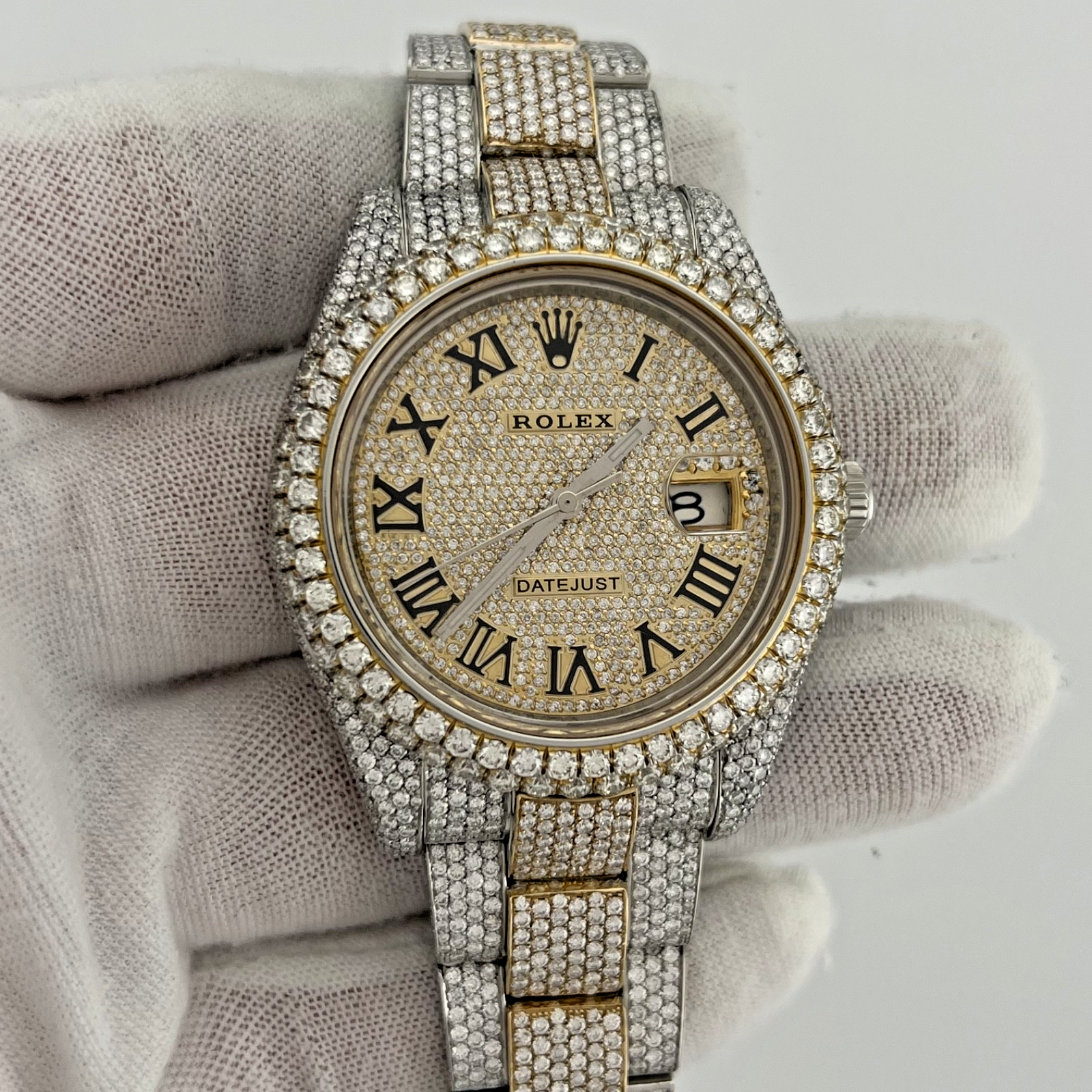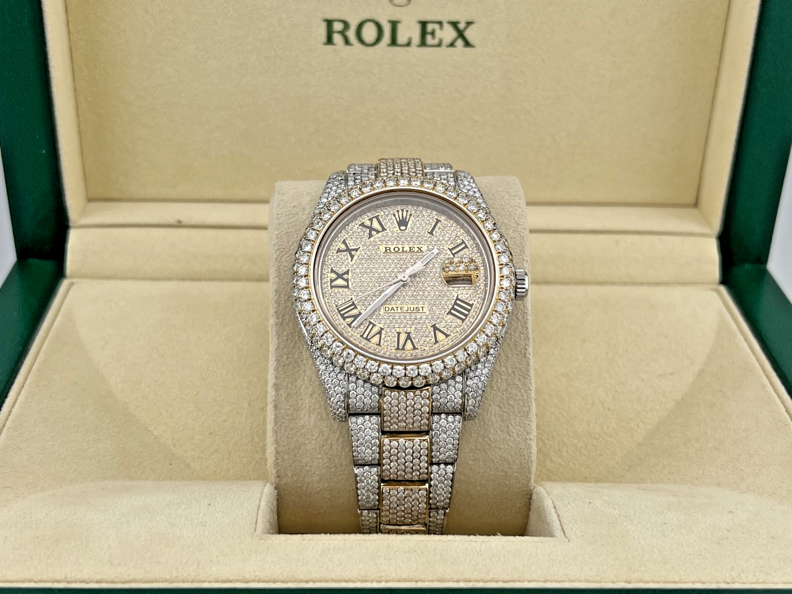 Rolex Datejust 116333 41mm Diamond Case Bezel Band and Pave Dial 18k Gold Steel Rolex Sale! from 1599500 /per This item is a recurring or deferred purchase. By continuing, I agree to the cancellation policy and authorize you to charge my payment method at the prices, frequency and dates listed on this page until my order is fulfilled or I cancel, if permitted. +1 (619) 232-1273 This item is currently on backorder but you can still purchase it now and we'll ship as soon as more become available. Style Number: 116333Serial: G60****Year: 2010 Model: Rolex Datejust II Case Material: Diamond Encrusted Stainless Steel Band: Custom Diamond Encrusted Yellow Gold & Stainless Steel Bezel: Custom Diamond Bezel Dial: Custom Pave Diamond Dial Crystal: Sapphire Case Size: 41mm Includes: - Elegant Watch Box- Certified Appraisal - 1 Year WarrantySKU 22713 / 126370TBJ062525