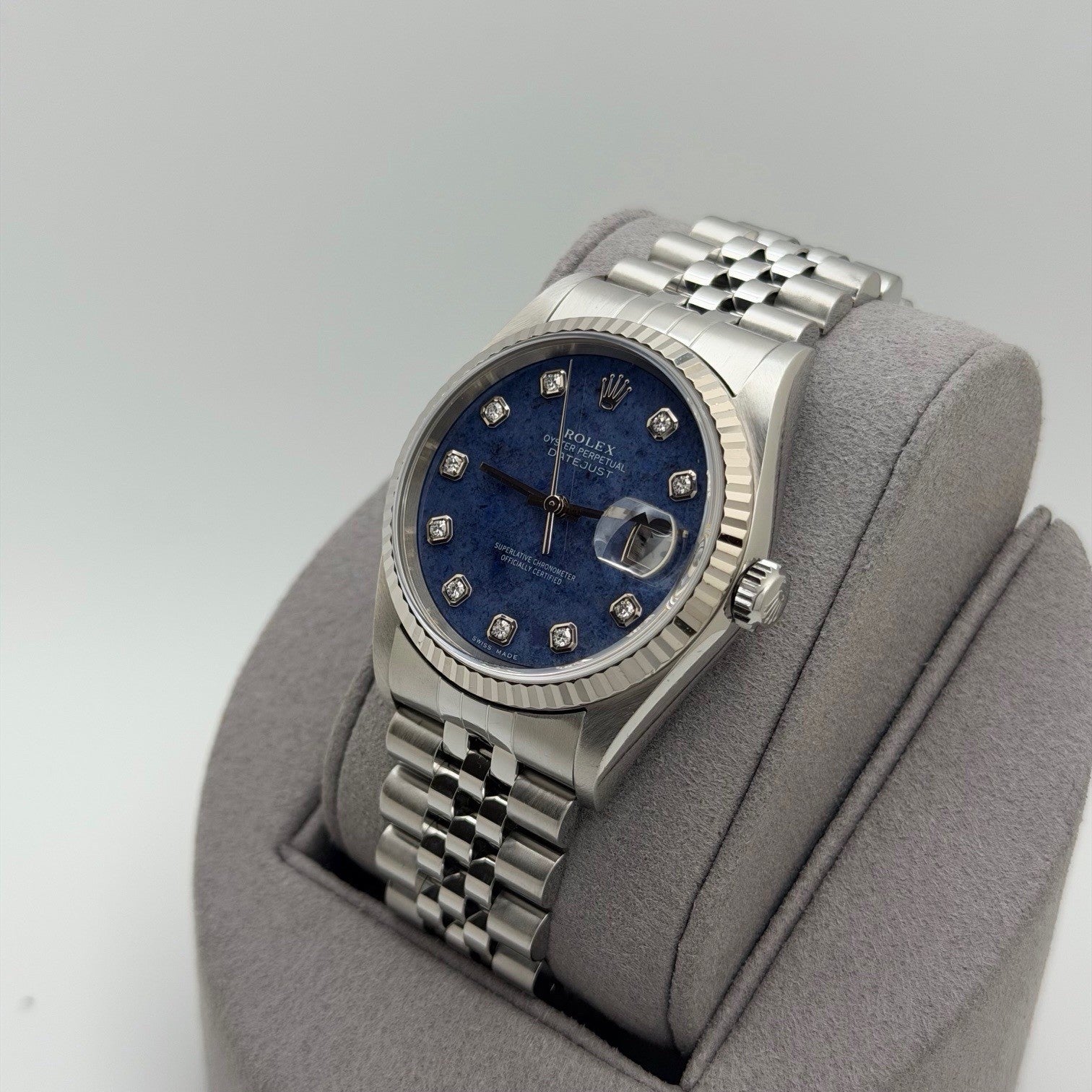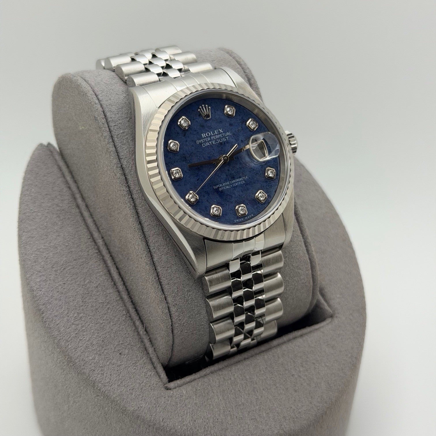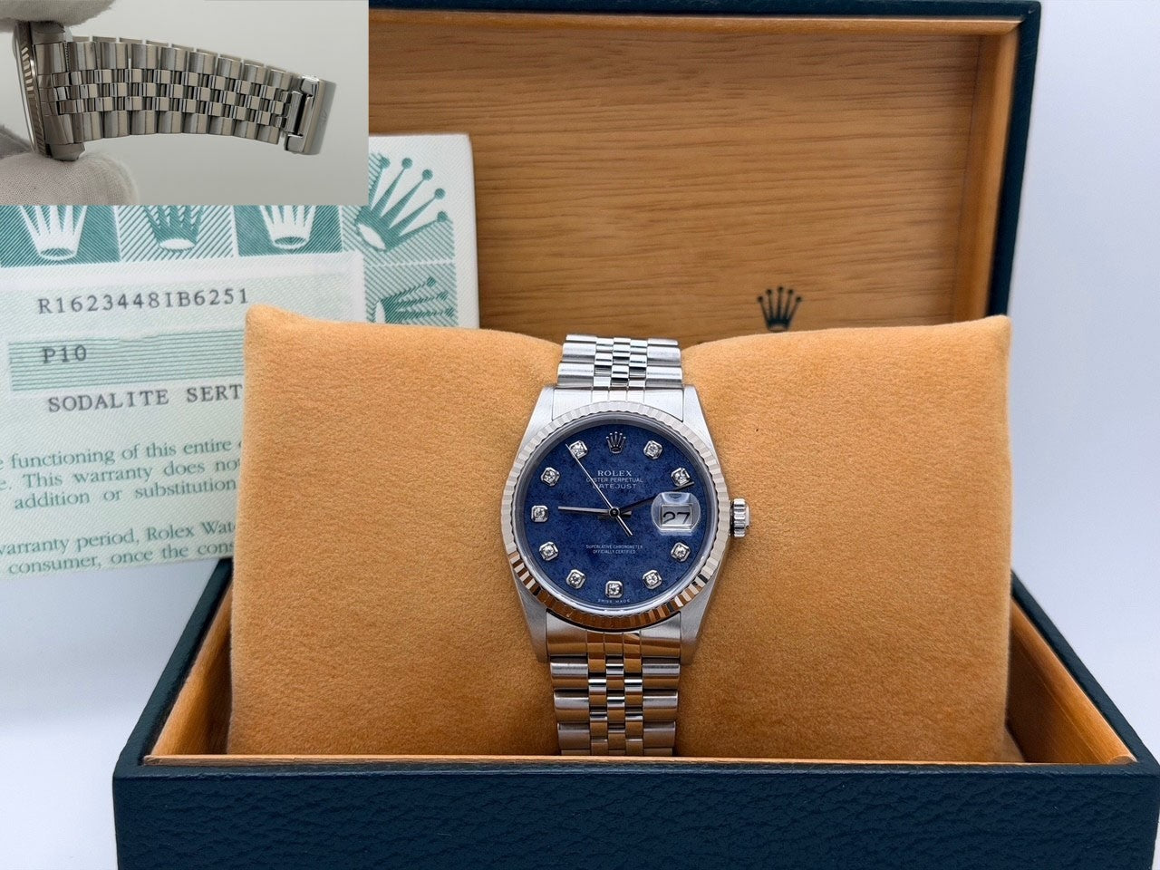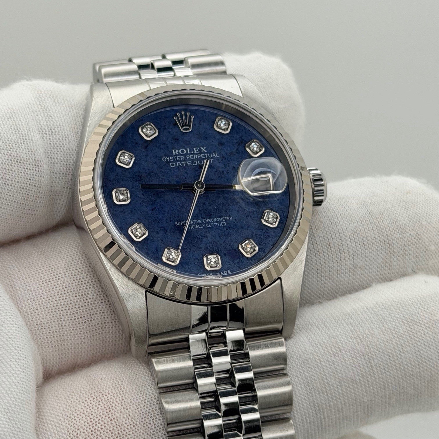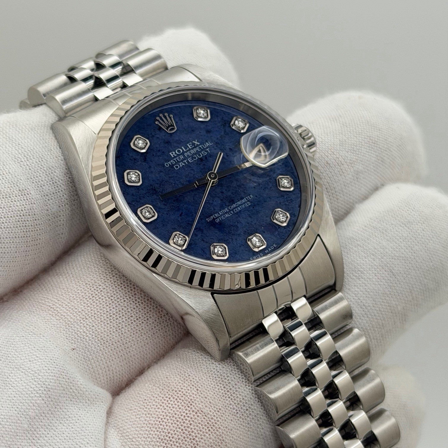 Rolex Datejust 16234 36mm Blue Sodalite Diamond Dial 18k Gold Steel Box Paper Rolex Sale! from 1479500 /per This item is a recurring or deferred purchase. By continuing, I agree to the cancellation policy and authorize you to charge my payment method at the prices, frequency and dates listed on this page until my order is fulfilled or I cancel, if permitted. +1 (619) 232-1273 This item is currently on backorder but you can still purchase it now and we'll ship as soon as more become available. Style Number: 16234Serial: P10****Year: 2000 Model: Rolex Datejust Case Material: Stainless Steel Band: Stainless Steel Jubilee Bezel: 18k White Gold Fluted Bezel Dial: Factory Blue Sodalite Serti Diamond Dial Crystal: Sapphire Case Size: 36mm Includes: - Rolex Box & Papers- Certified Appraisal - One Year WarrantySKU 23672 / 127300TOC012726