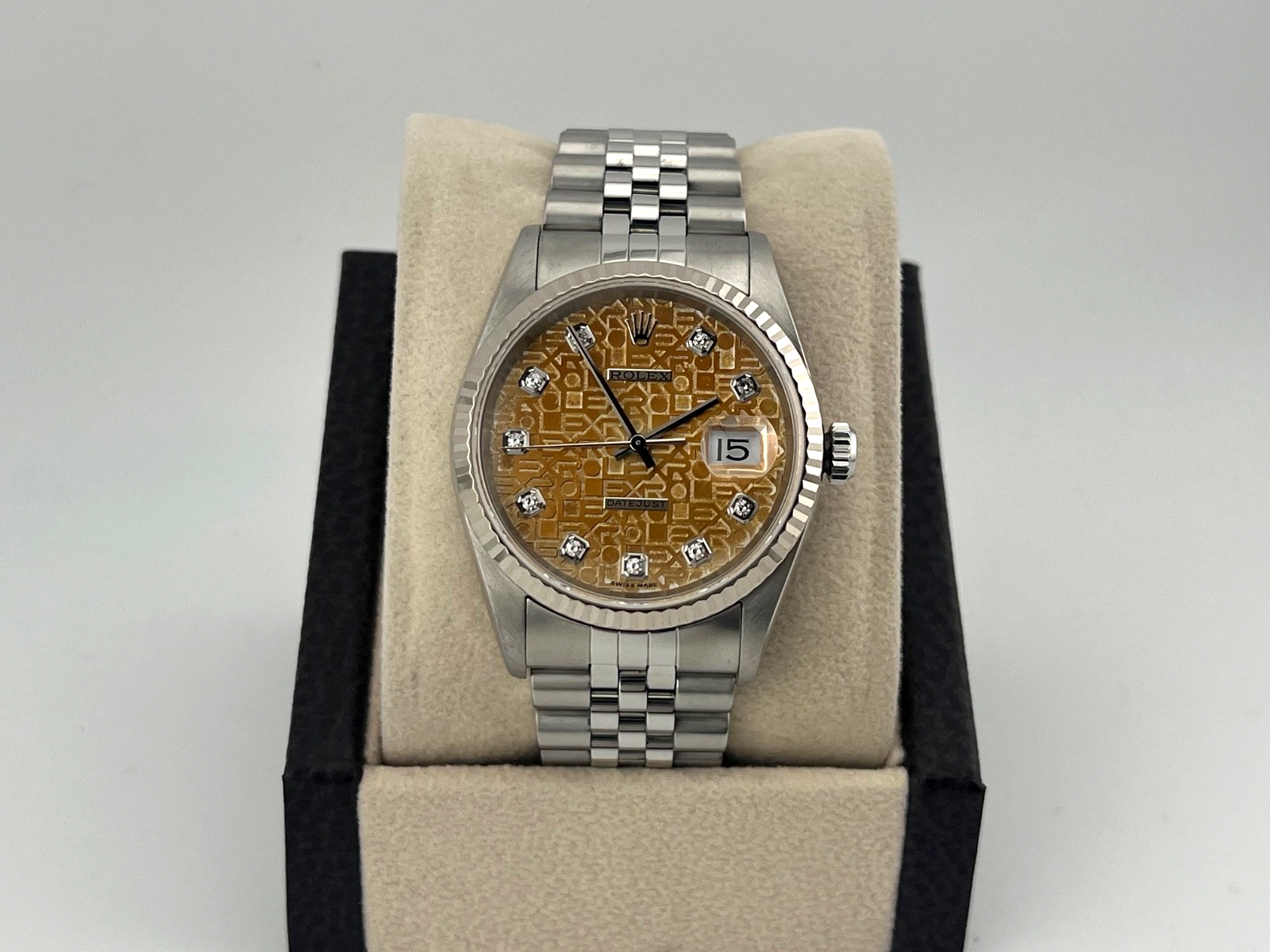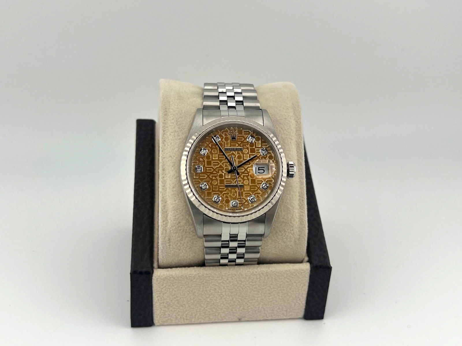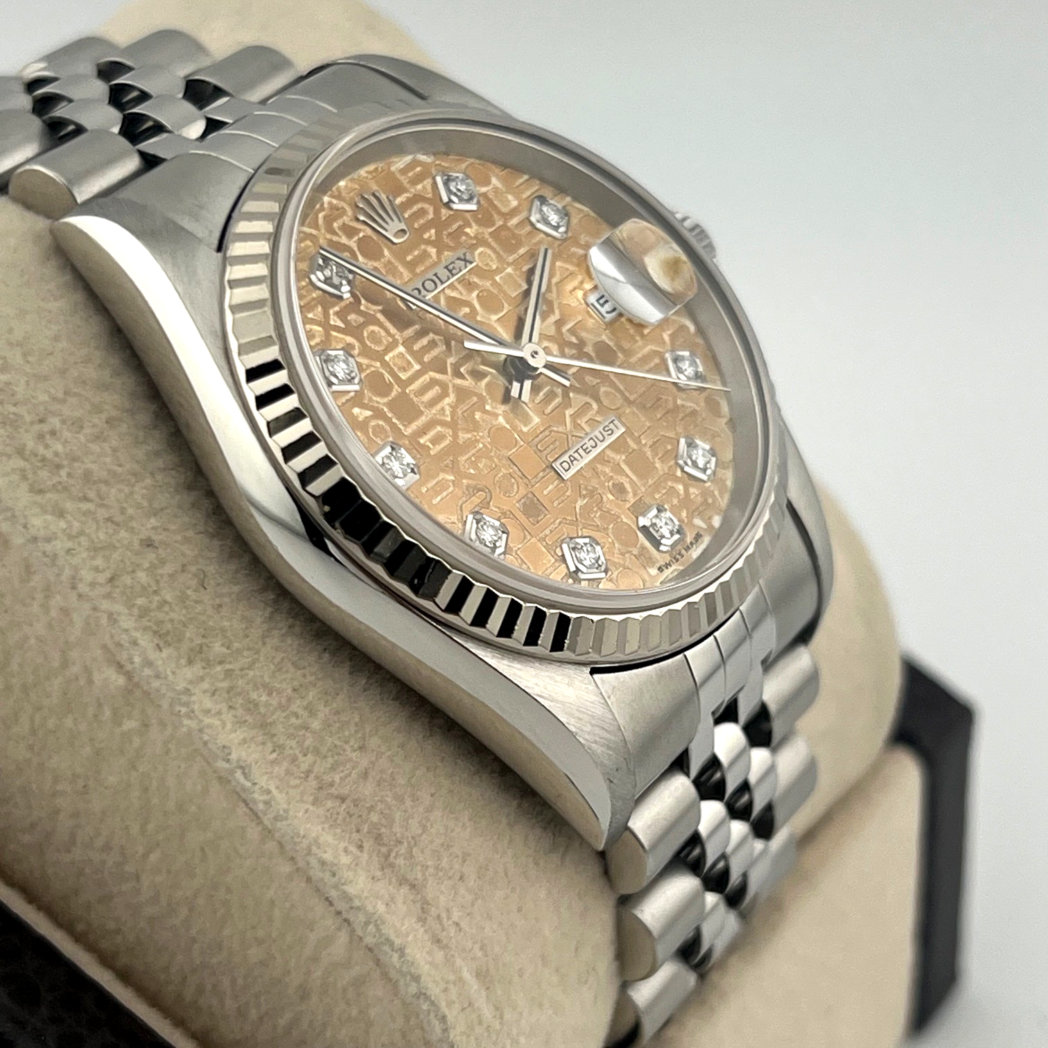 Rolex Datejust 16234 36mm TROPICAL Jubilee Diamond Dial 18k Gold Stainless Steel Rolex Sale! from 799500 /per This item is a recurring or deferred purchase. By continuing, I agree to the cancellation policy and authorize you to charge my payment method at the prices, frequency and dates listed on this page until my order is fulfilled or I cancel, if permitted. +1 (619) 232-1273 This item is currently on backorder but you can still purchase it now and we'll ship as soon as more become available. Style Number: 16234Serial: P73****Year: 2000 Model: Rolex Datejust Case Material: Stainless Steel Band: Stainless Steel Jubilee Bezel: 18k White Gold Fluted Dial: TROPICAL Factory Rolex Jubilee Diamond Dial - This Rolex Jubilee diamond dial has aged to a rare and desirable fiery orange color. Crystal: Sapphire Case Size: 36mm Includes: - Elegant Watch Box- Certified Appraisal - 1 Year WarrantySKU 21515 / 19492TGCORE081724