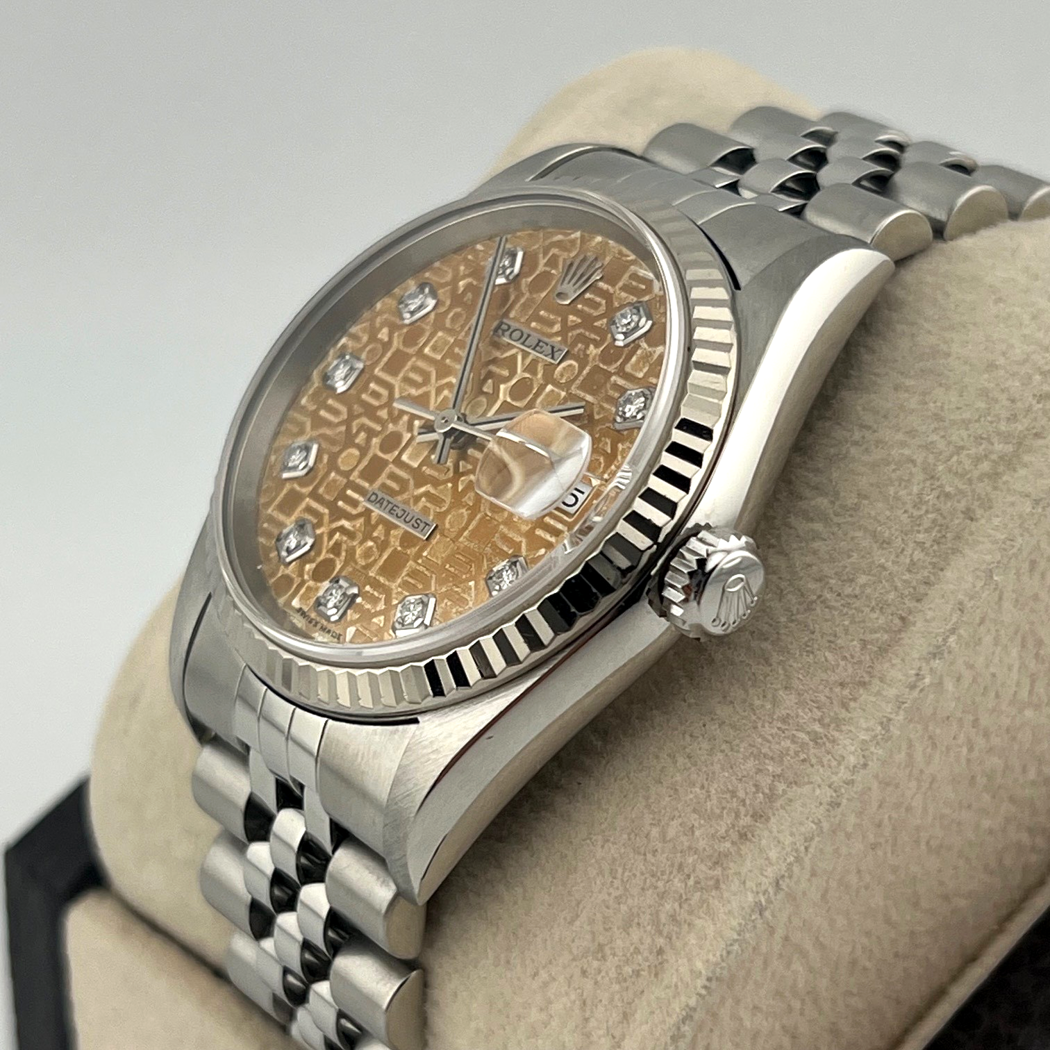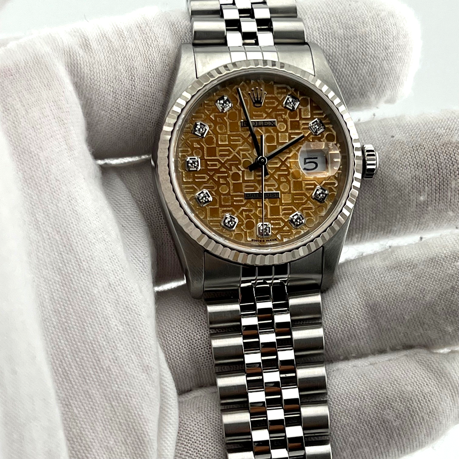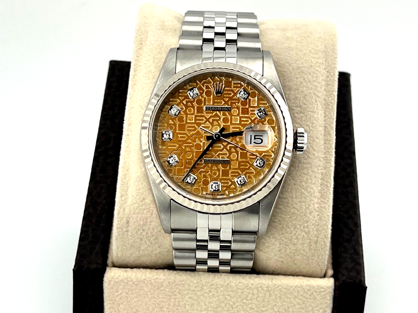 Rolex Datejust 16234 36mm TROPICAL Jubilee Diamond Dial 18k Gold Stainless Steel Rolex Sale! from 799500 /per This item is a recurring or deferred purchase. By continuing, I agree to the cancellation policy and authorize you to charge my payment method at the prices, frequency and dates listed on this page until my order is fulfilled or I cancel, if permitted. +1 (619) 232-1273 This item is currently on backorder but you can still purchase it now and we'll ship as soon as more become available. Style Number: 16234Serial: P73****Year: 2000 Model: Rolex Datejust Case Material: Stainless Steel Band: Stainless Steel Jubilee Bezel: 18k White Gold Fluted Dial: TROPICAL Factory Rolex Jubilee Diamond Dial - This Rolex Jubilee diamond dial has aged to a rare and desirable fiery orange color. Crystal: Sapphire Case Size: 36mm Includes: - Elegant Watch Box- Certified Appraisal - 1 Year WarrantySKU 21515 / 19492TGCORE081724