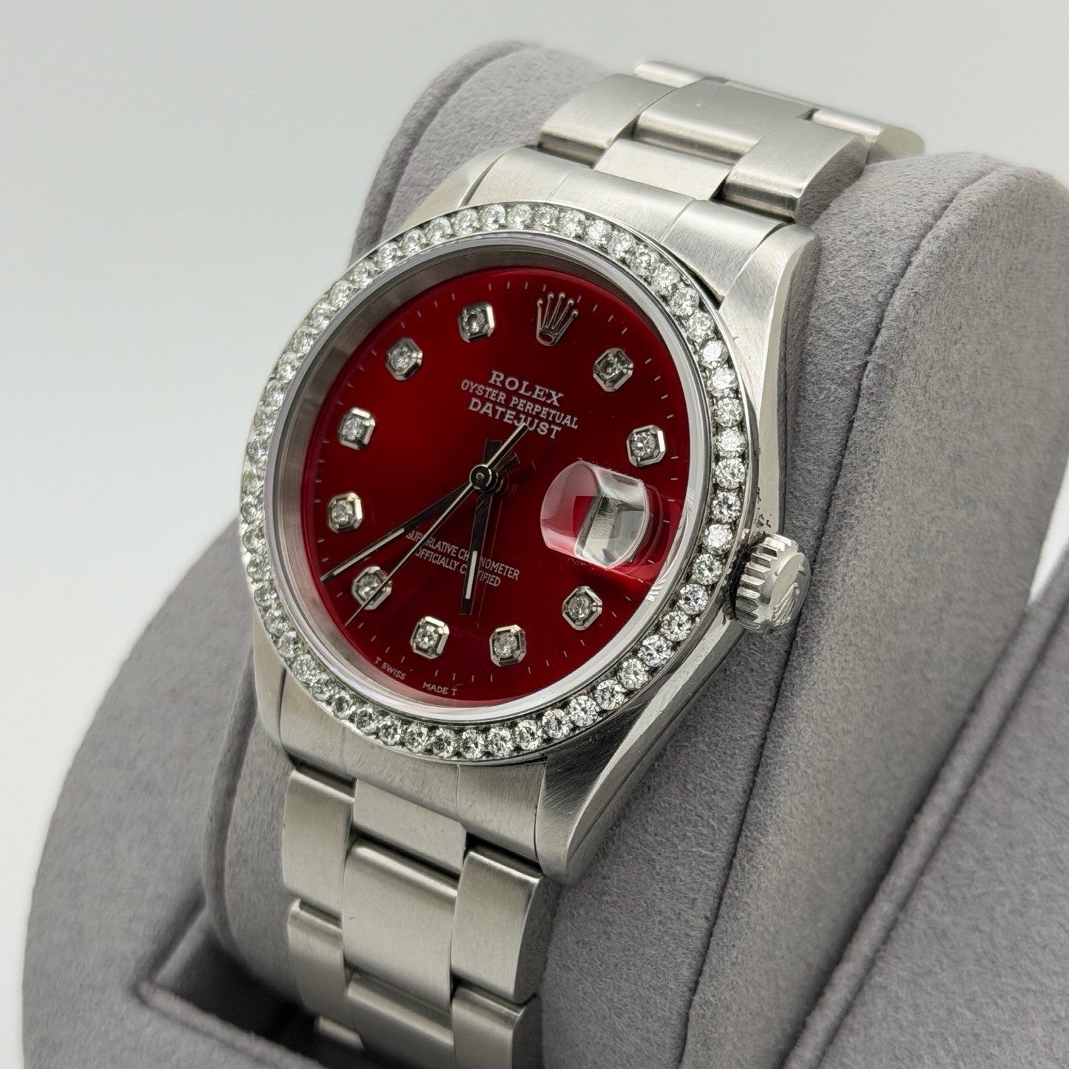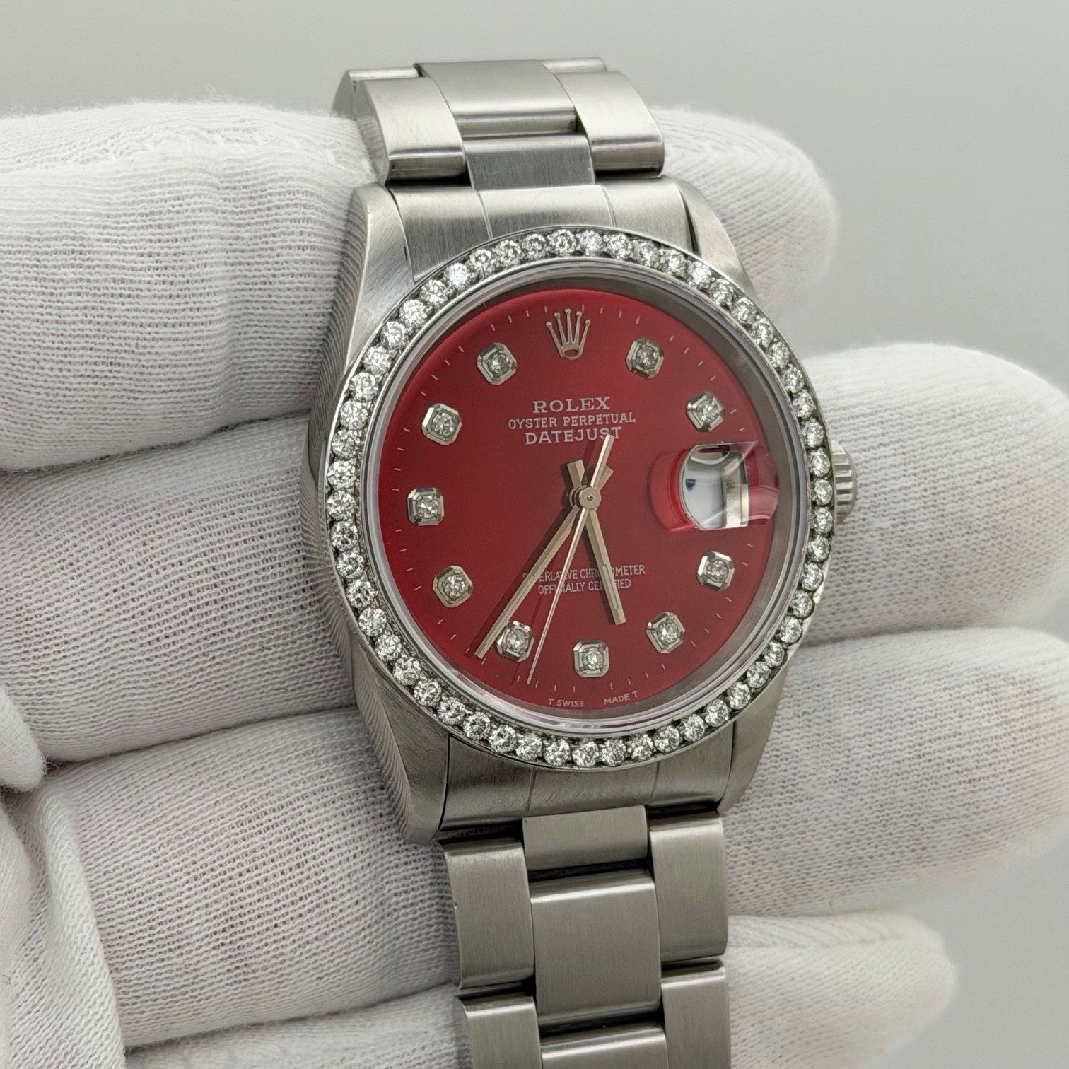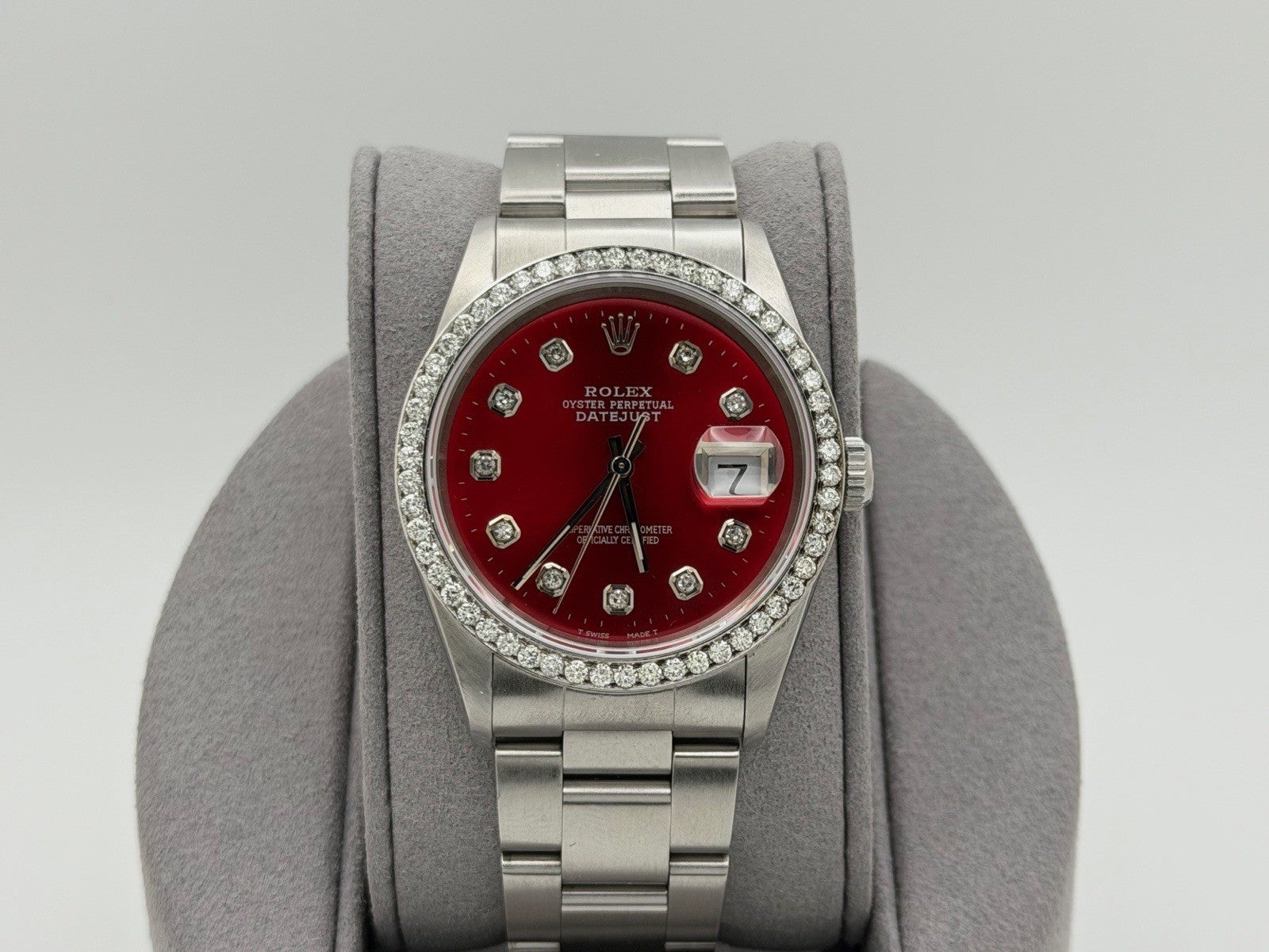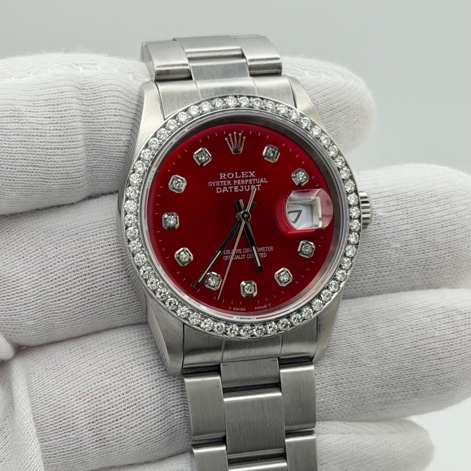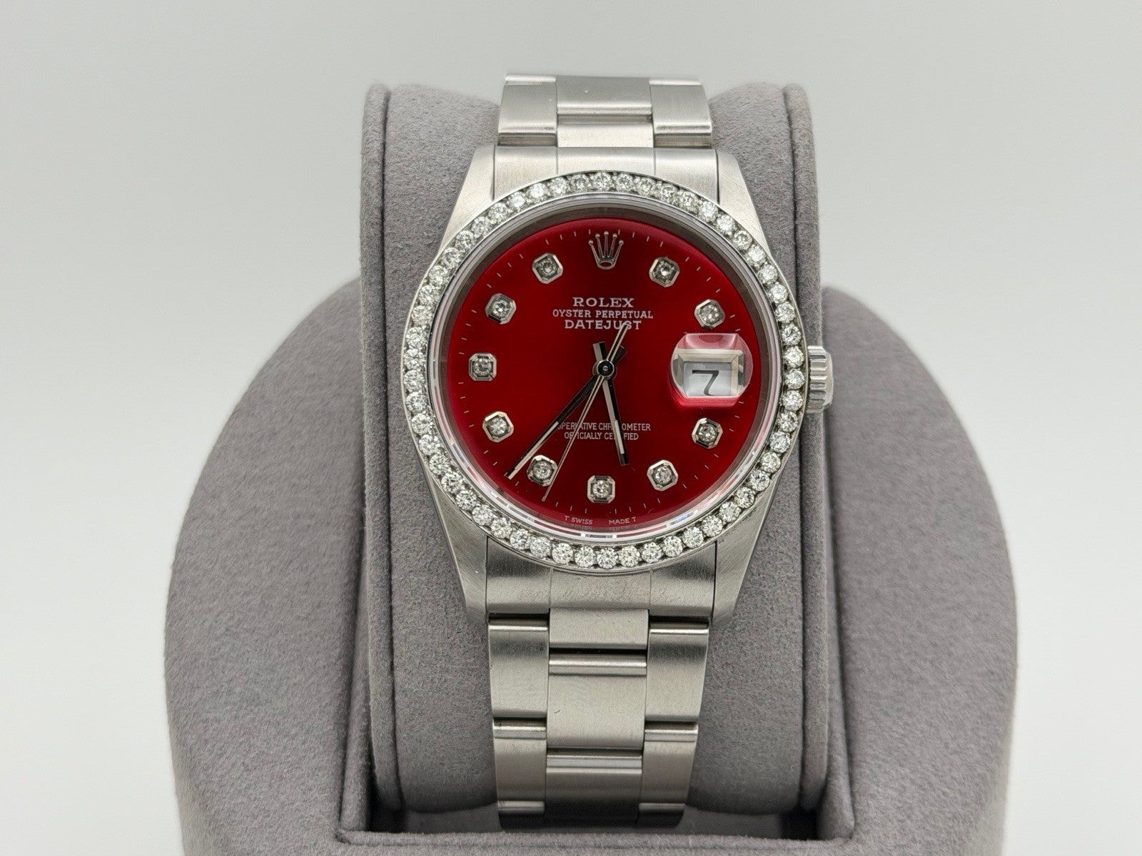Rolex Datejust 16264 36mm Red Diamond Dial Diamond Bezel Stainless Steel Rolex Sale! from 699500 /per This item is a recurring or deferred purchase. By continuing, I agree to the cancellation policy and authorize you to charge my payment method at the prices, frequency and dates listed on this page until my order is fulfilled or I cancel, if permitted. +1 (619) 232-1273 This item is currently on backorder but you can still purchase it now and we'll ship as soon as more become available. Style Number: 16264Serial: T69**** Year: 1996 Model: Rolex Datejust Case Material: Stainless Steel Band: Stainless Steel Bezel: Custom Diamond Bezel Dial: Custom Red Diamond Dial Crystal: Sapphire Case Size: 36mm Includes: - Elegant Watch Box- Certified Appraisal - One Year WarrantySKU 22212 / 18778TGC030325