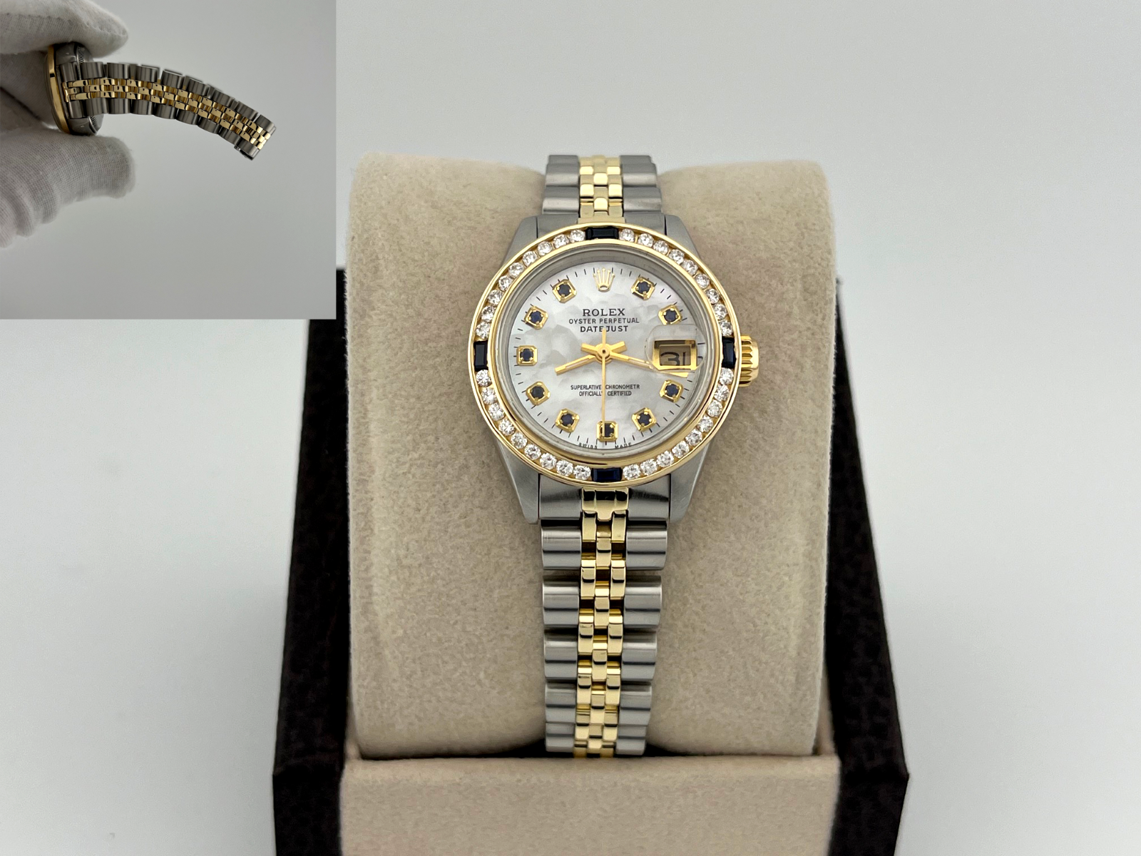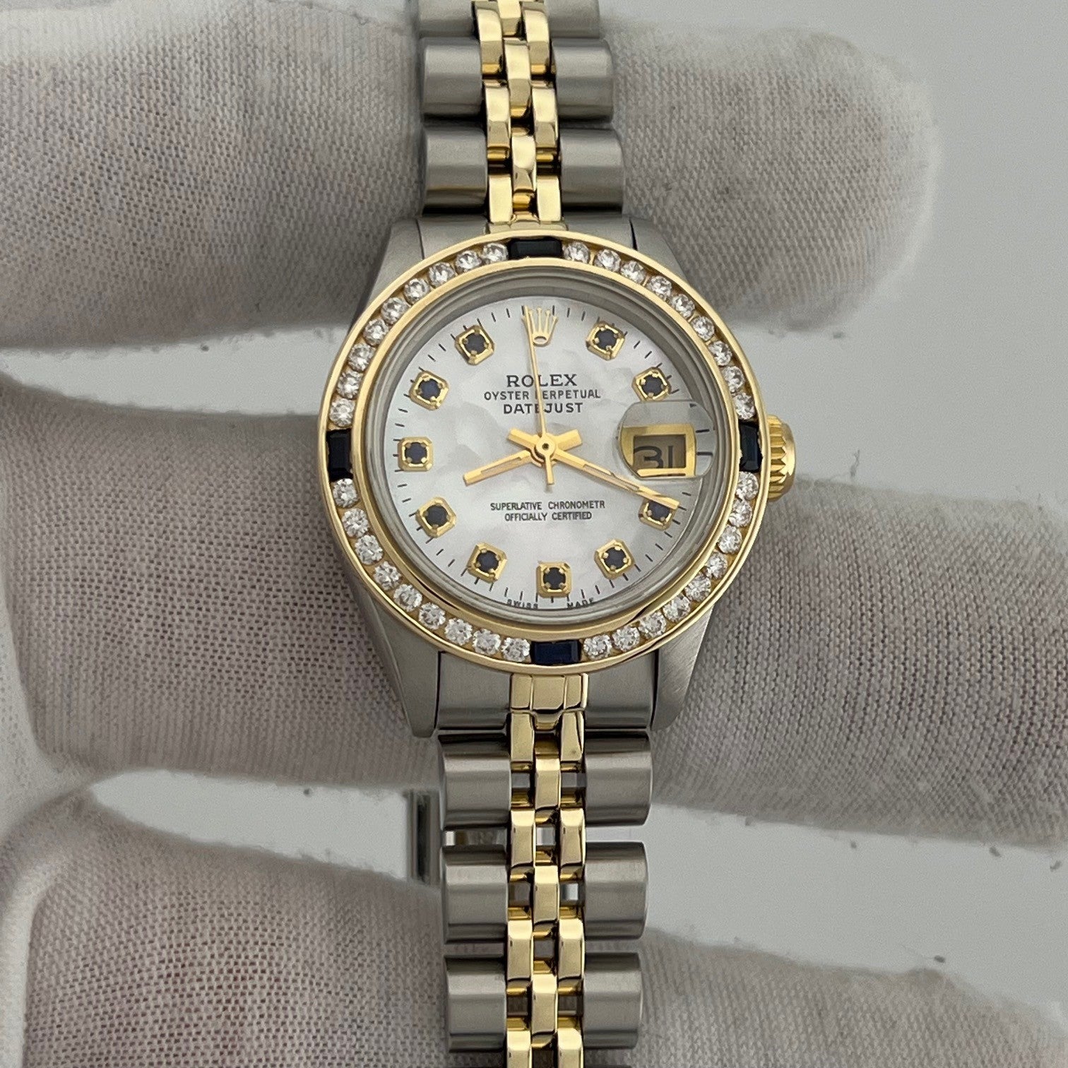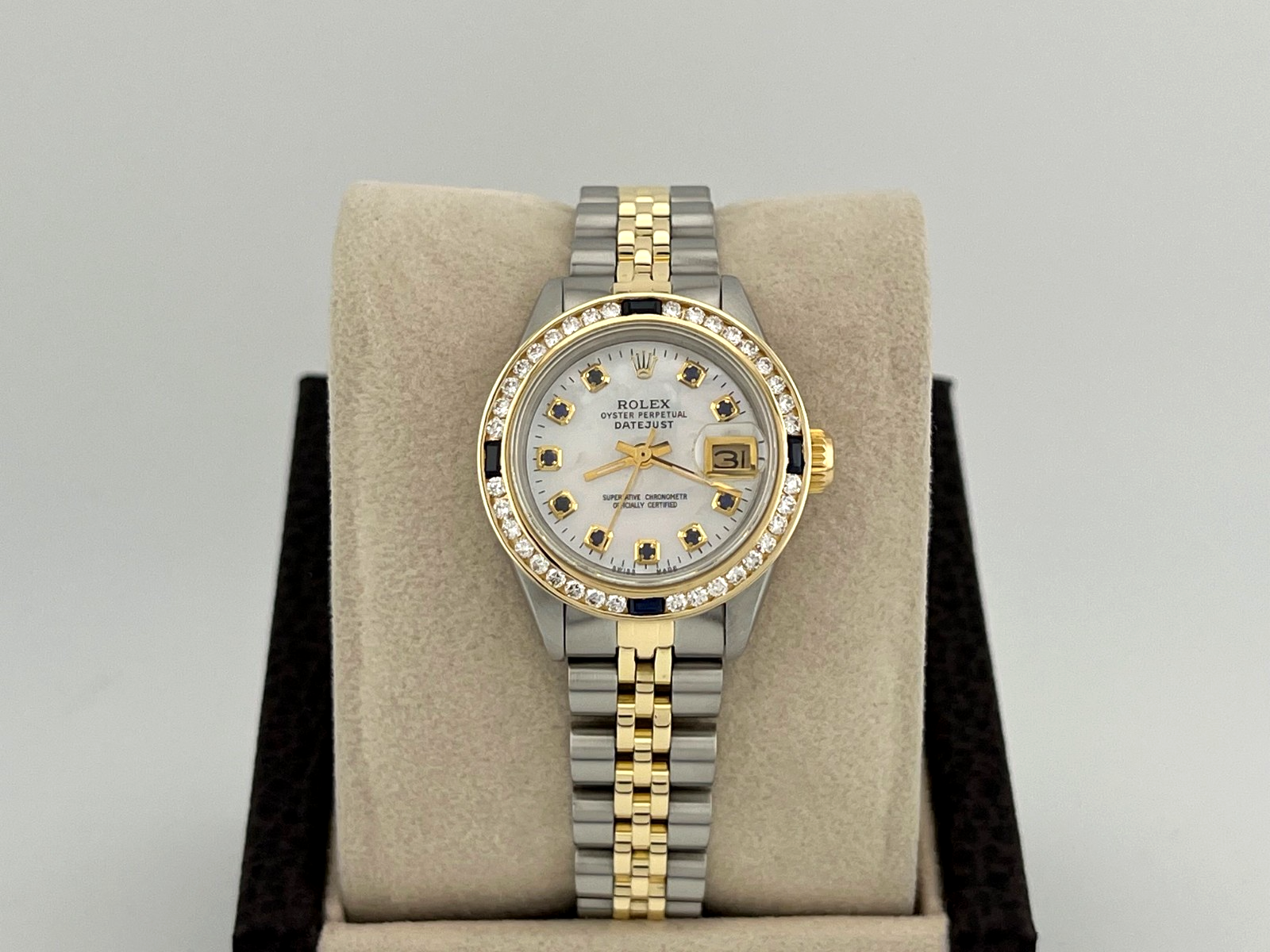 Rolex Datejust 6917 Mother of Pearl Sapphire Dial Diamond Bezel Gold Steel Rolex Sale! from 499500 /per This item is a recurring or deferred purchase. By continuing, I agree to the cancellation policy and authorize you to charge my payment method at the prices, frequency and dates listed on this page until my order is fulfilled or I cancel, if permitted. +1 (619) 232-1273 This item is currently on backorder but you can still purchase it now and we'll ship as soon as more become available. Style Number: 6917Serial: 374****Year: 1974 Model: Rolex Ladies Datejust Case Material: Stainless Steel Band: 14k Yellow Gold & Stainless Steel Jubilee Bezel: Custom Diamond & Sapphire Bezel Dial: Custom Mother Of Pearl with Sapphire Markers Crystal: Sapphire Case Size: 26mm Includes: - Elegant Watch Box- Certified Appraisal - 1 Year WarrantySKU 23058 / 17770TOC091525